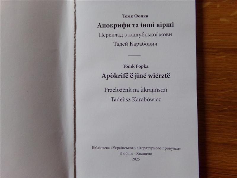 Ukazał się tomik poezji kaszubskiego poety Tomasza Fopke w przekładzie na język ukraiński Tadeusza Karabowicza. "Apokryfy i inne wiersze" zawiera też esej literacki tłumacza o autorze poezji. Wydanie było popularyzowane w ubiegłym tygodniu w Chwaszczenie na Kaszubach i w Gdyni. Pojutrze spotkanie autorskie odbędzie się też w Muzeum Literackim im. Józefa Czechowicza w Lublinie.