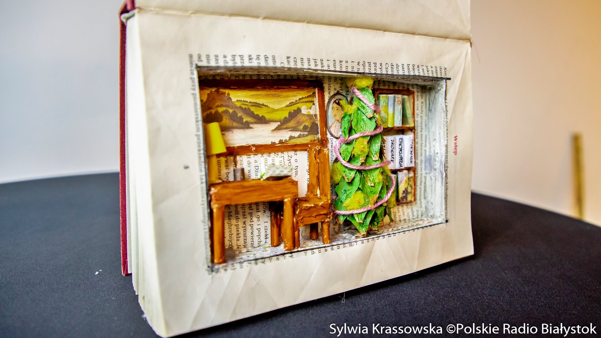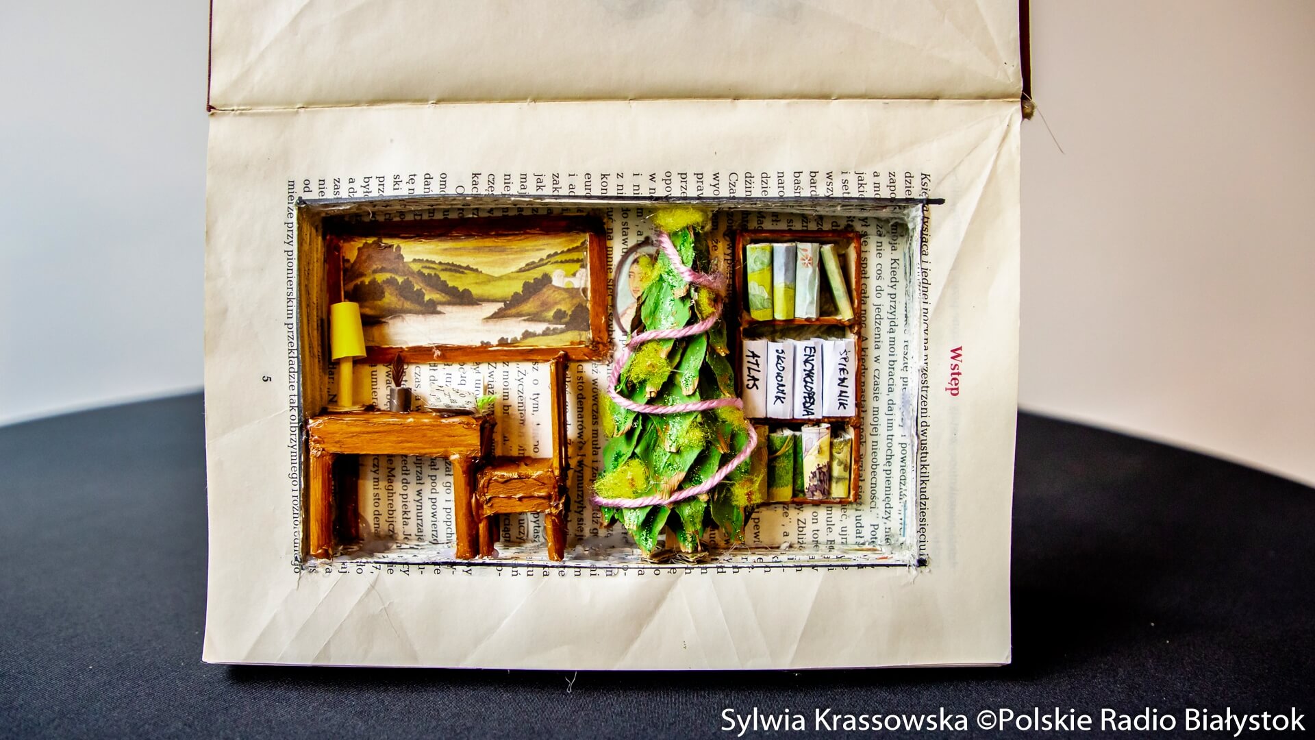 Niby zwyczajna książka. Dwie okładki związane barwną wstążeczką. Ale okazuje się, że w środku jest cały świat! Tak wyobraża sobie idealną Gwiazdkę z książką autorka tej pracy- Agnieszka Fiedorczuk. Jakież to jest śliczne! Biurko i krzesełeczko jest drewniane, lampka (prawie) świeci, a w bibliotece stoją woluminy najwspanialszych lektur. Mieszkałabym tam!