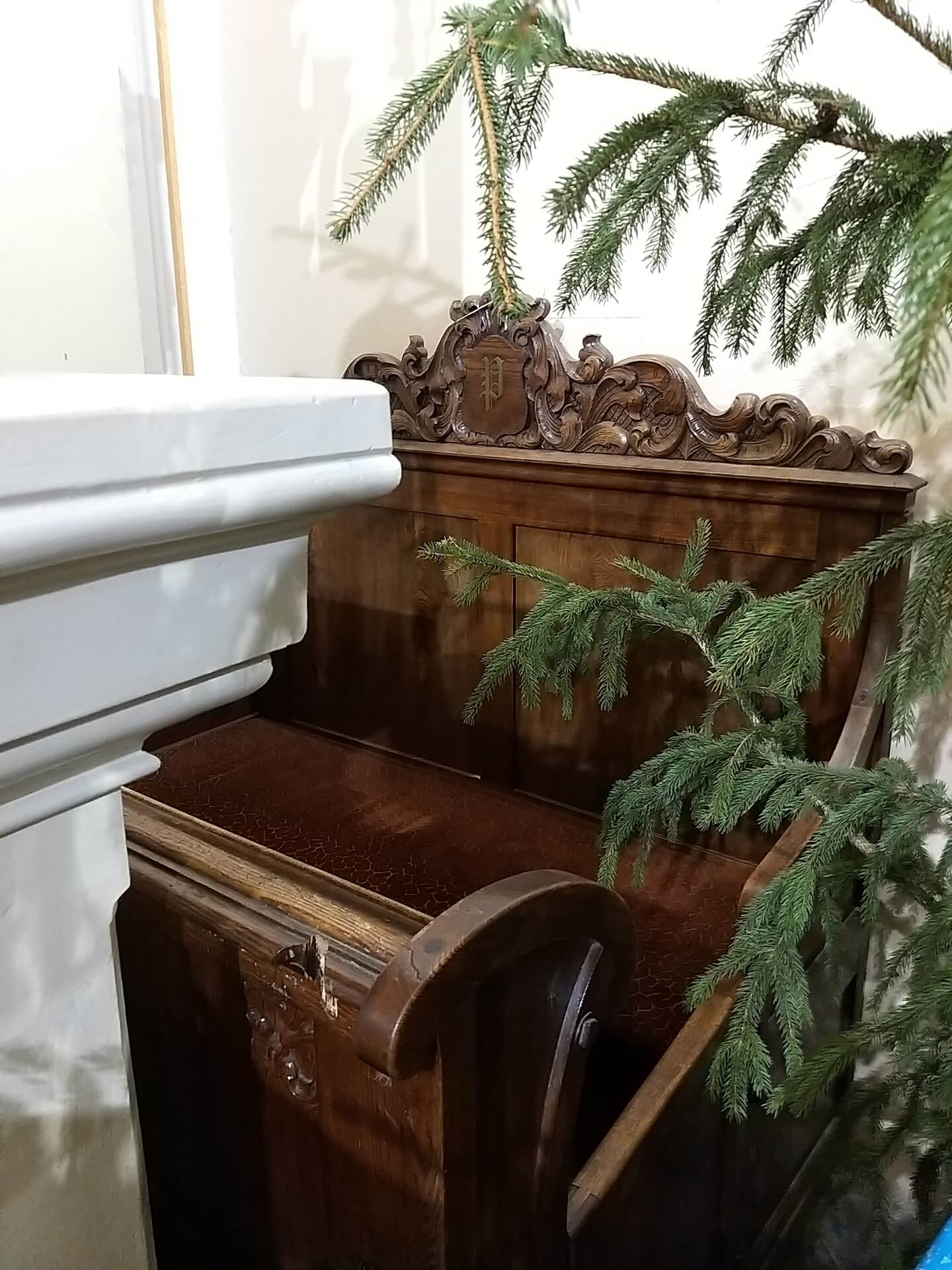 Ławka z inicjałami rodziny Pieńkowskich-kościół w Dołubowie, fot. Dorota Sokołowska