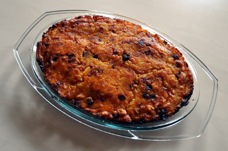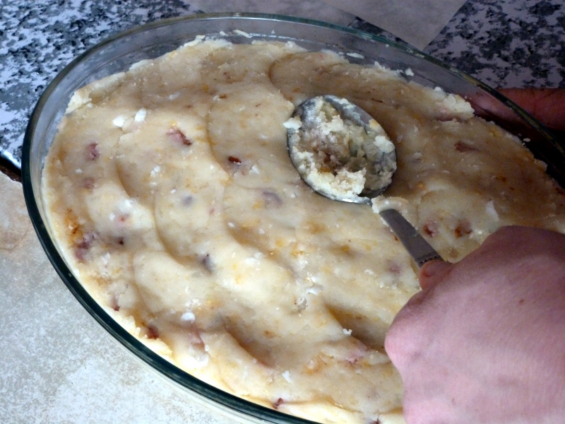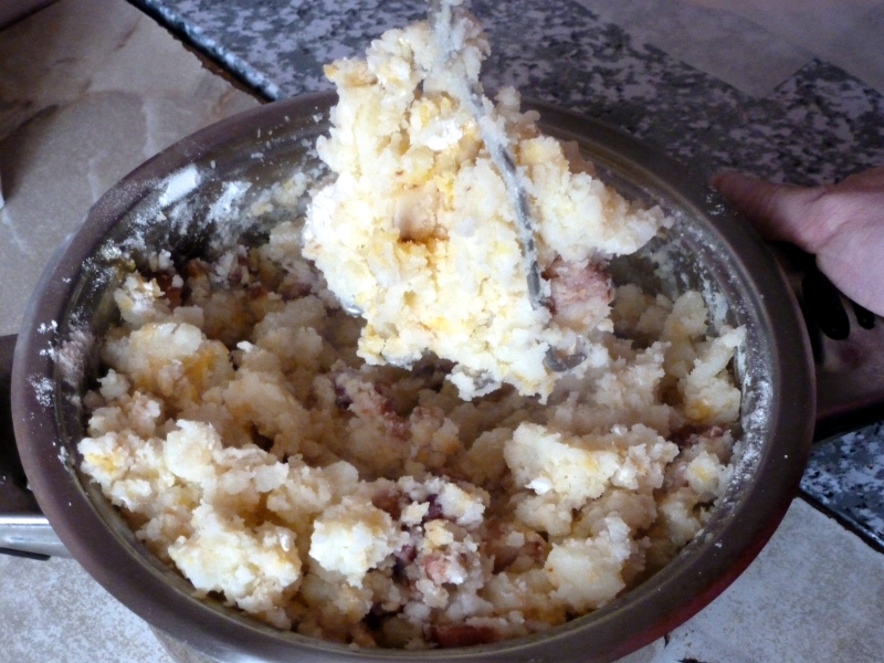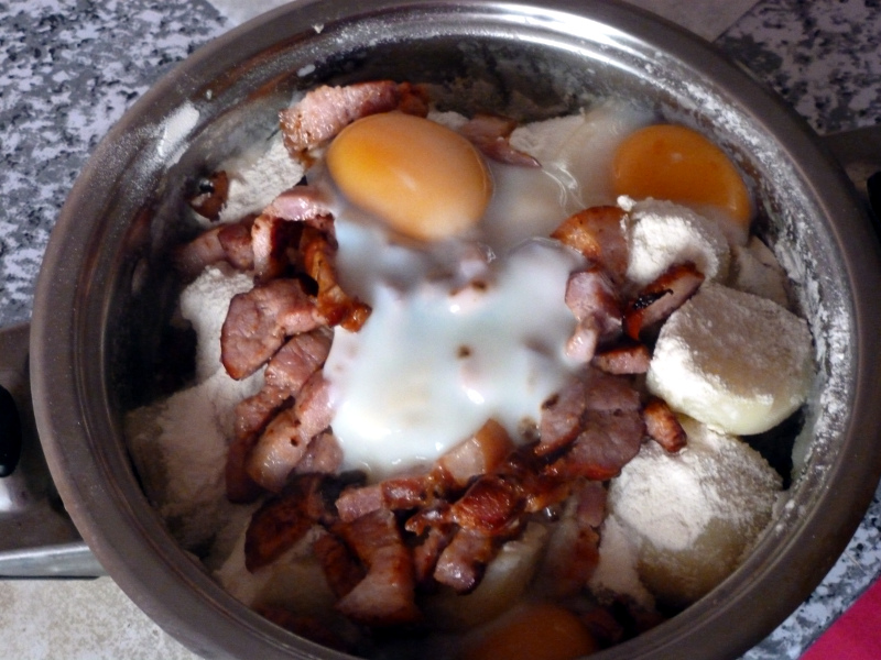 Ziemniaki gotujemy w osolonej wodzie. W tym samym czasie smażymy pokrojony w kostkę boczek - możemy dodać oleju rzepakowego, jeśli boczek jest chudy. Ziemniaki po ugotowaniu odparowujemy i posypujemy mąką (tak, by je przykryć). Szybko dodajemy rozgrzany boczek z tłuszczem i na wierzch wbijamy jajka. Na kilka minut przykrywamy garnek i czekamy, aż białko się zetnie. Potem taką masę dokładnie ugniatamy i mieszamy. Wkładamy do blachy (lub naczynia żaroodpornego) cienką warstwę masy ziemniaczanej i wstawiamy do piekarnika. Pieczemy w temperaturze około 150 stopni Celsjusza, aż wierzch się zarumieni. Można podawać z surówkami, mlekiem słodkim lub zsiadłym. (rr/zmj)