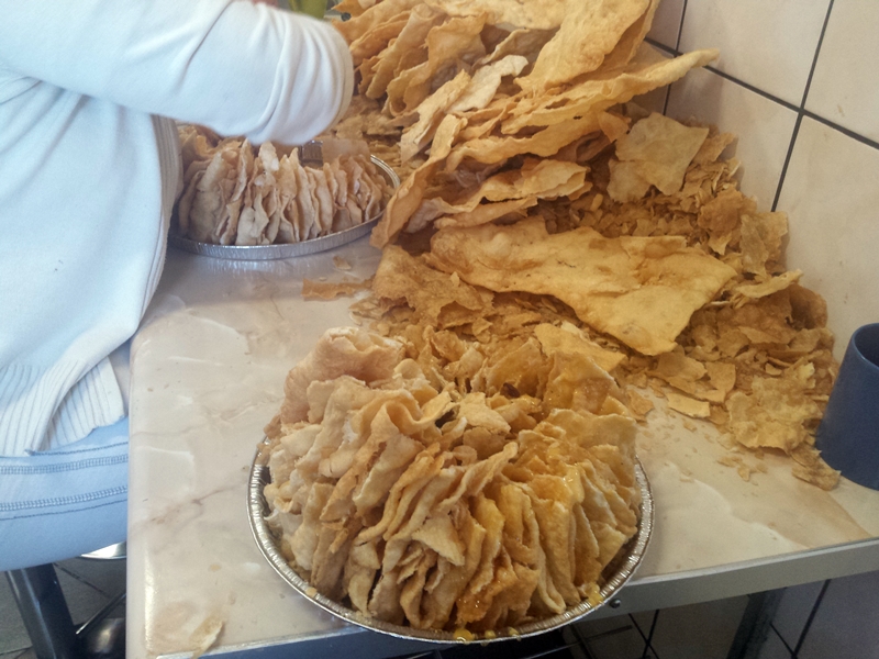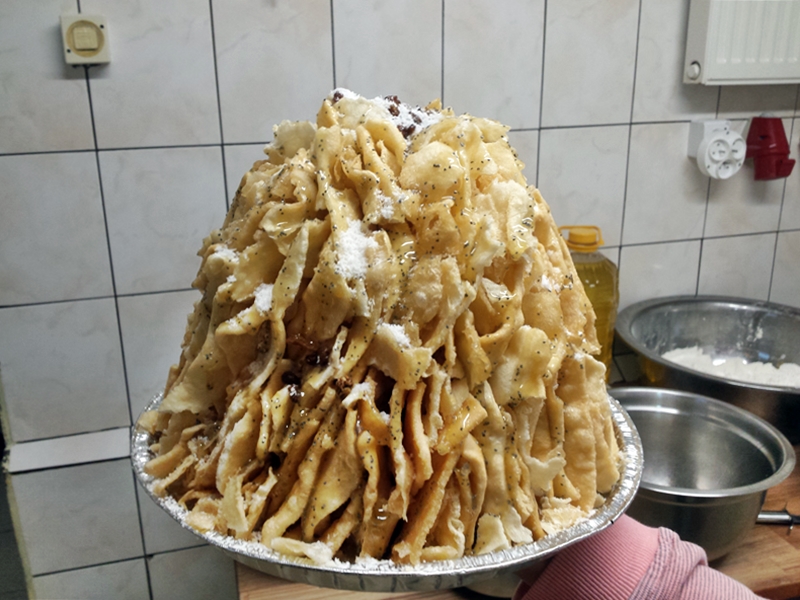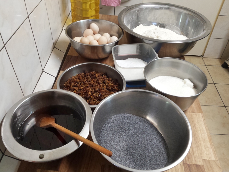 Z jajek, mąki i soli ugniatamy ciasto (mąka powinna mieć temperaturę pokojową), wlewamy trochę oleju i cały czas ugniatamy, aż olej wsiąknie w ciasto. Tak przygotowaną masę moczymy co najmniej pół godziny w oleju. W tym czasie podgrzewamy miód z cukrem, aż ten się rozpuści. Ciasto cienko rozwałkowujemy i dość duże płaty smażymy na rozgrzanym oleju z obu stron. Kładziemy na papierowy ręcznik. Gdy chrust jest gotowy, można układać z niego mrowisko. Chrust odpowiednio łamiemy, układamy płatki jeden obok drugiego i sklejamy miodem z cukrem, posypując też rodzynkami i makiem. Po ułożeniu jednej warstwy, układamy na niej następne, także polewając miodem i posypując makiem i rodzynkami. Mrowisko najlepiej smakuje po 3 dniach.