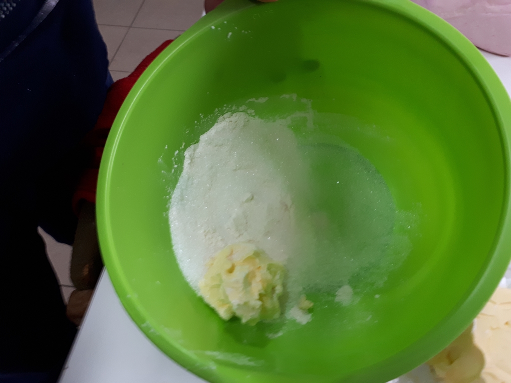 Przygotowanie kruszonki: wsypujemy do miski 2 łyżki mąki, dodajemy 2 łyżki masła i 2 łyżki cukru. Mieszamy i kruszymy.
