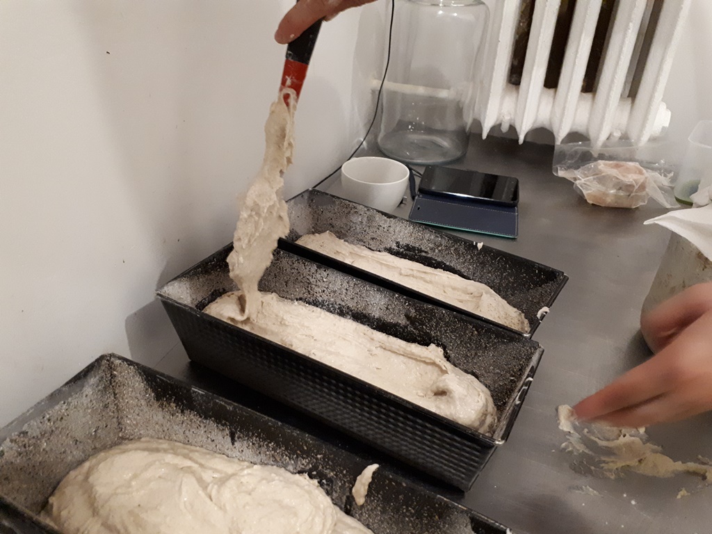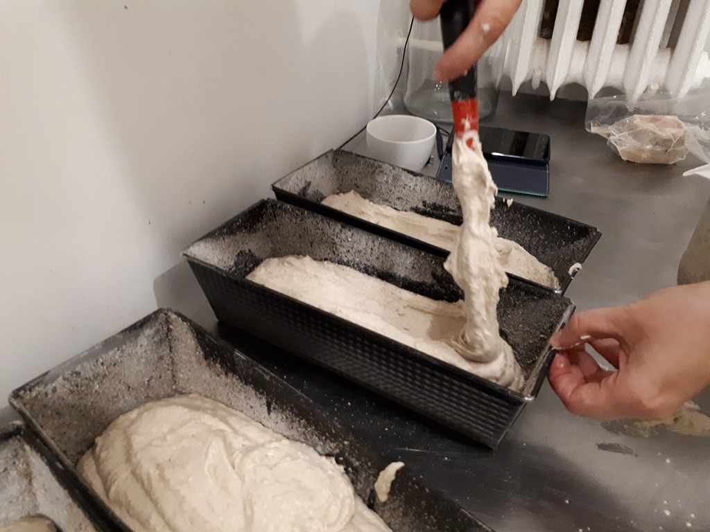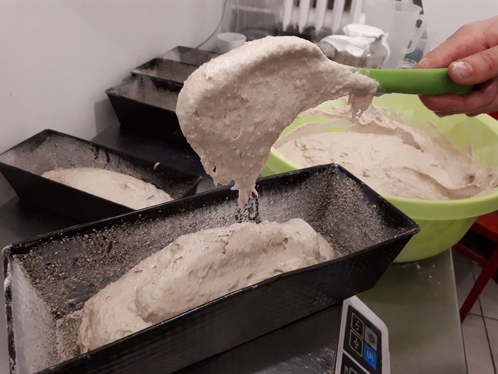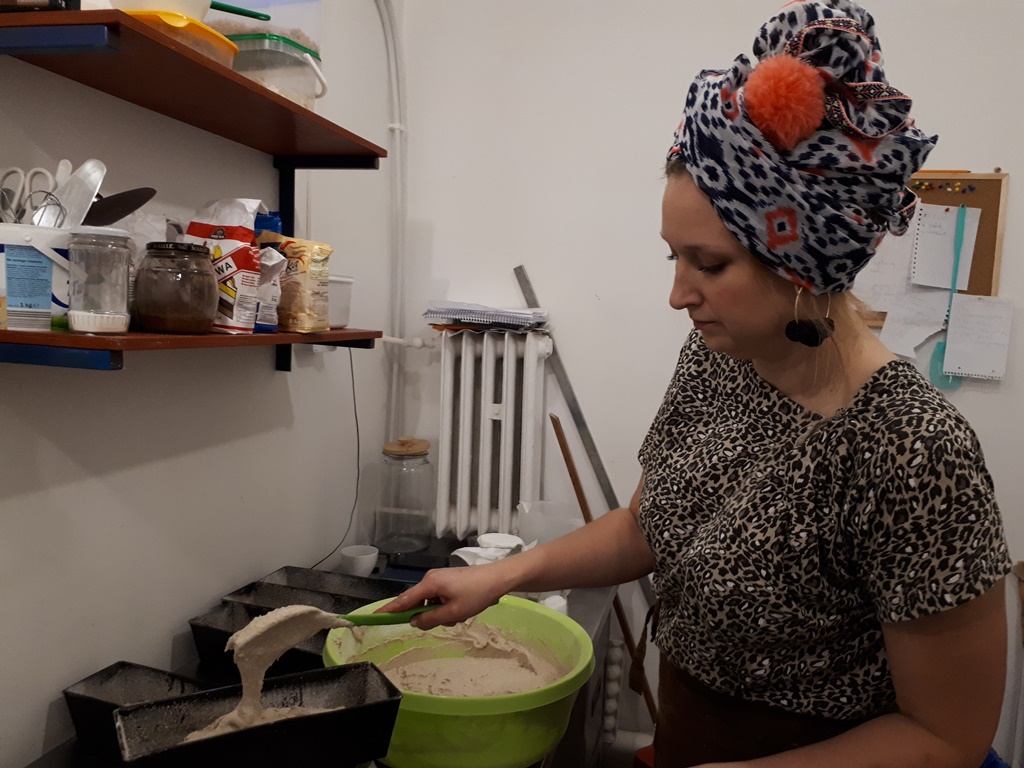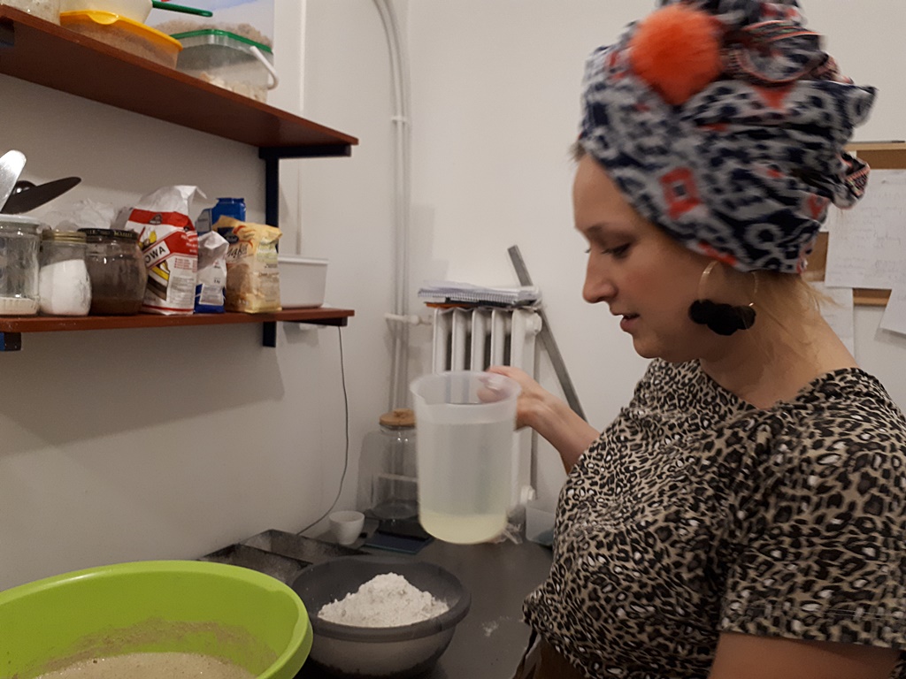 Chleb: Do 50 gram zakwasu dodajemy 150 gram mąki żytniej jasnej, i do tego 150 gram wody. Zaczyn musi odczekać przynajmniej 12 godzin, żeby urósł. Następnie dodajemy 400 gram wody, 400 gram mąki i 2 łyżeczki soli. Wszystko mieszamy. Ciasto nakładamy do blaszek i posypujemy mąką. Blachę z ciastem należy zafoliować. Po 3 godzinach, kiedy ciasto wyrośnie, chleb wkładamy do rozgrzanego pieca. Pieczemy ok. 40 minut w temperaturze 210 stopni.