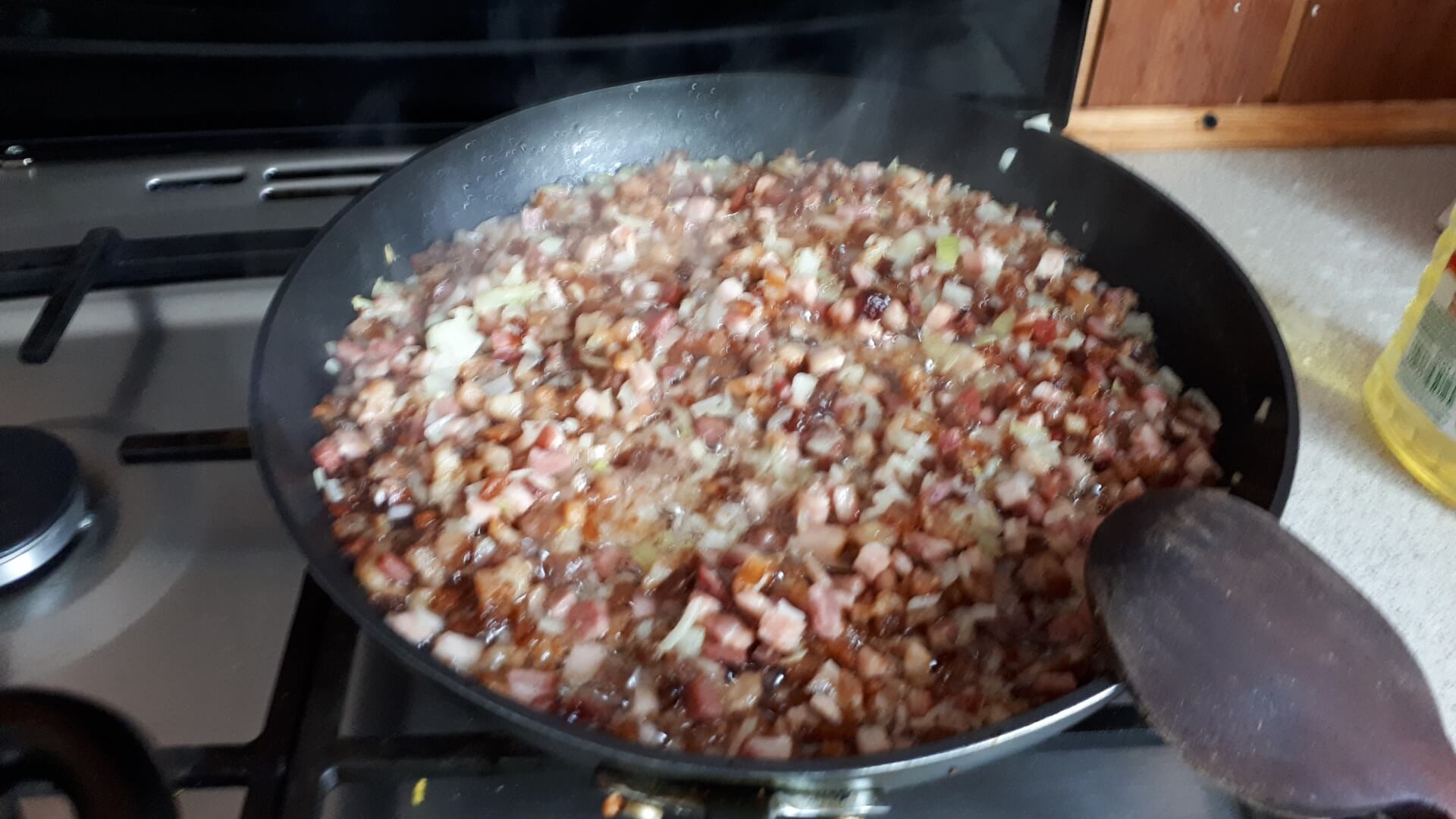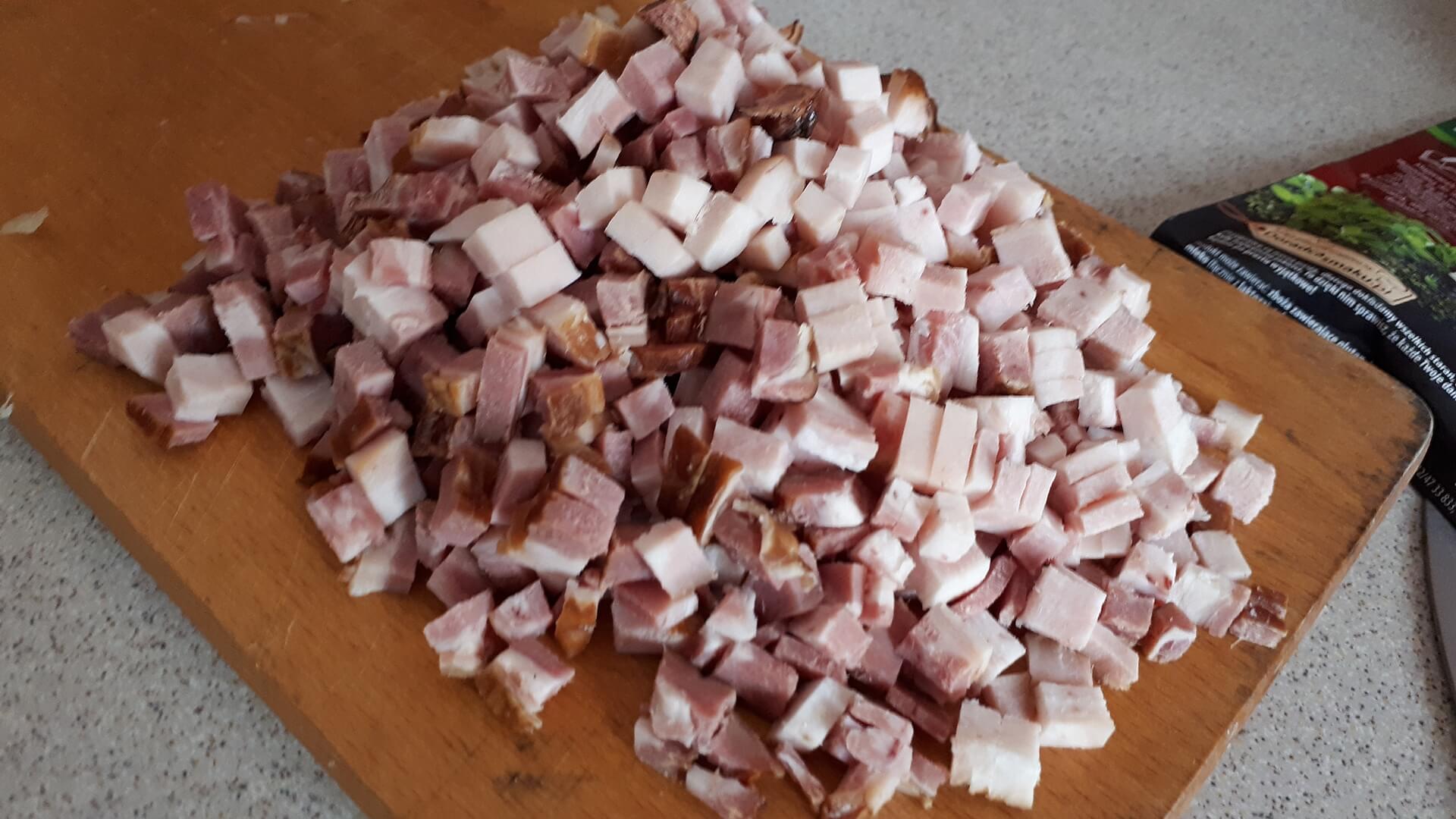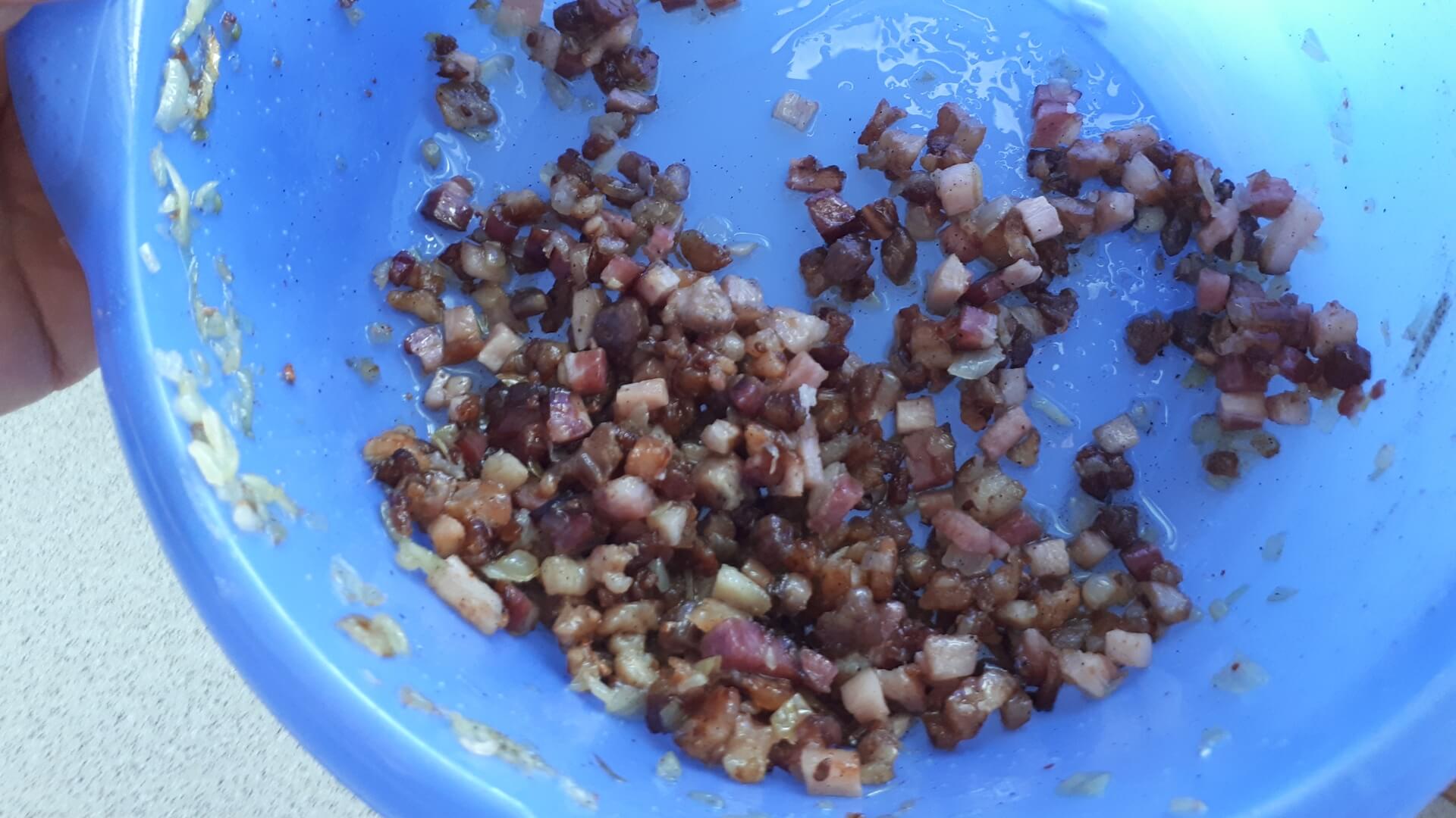 Pokrojony w drobną kostkę boczek podsmażamy na patelni (najpierw surowy, potem dodajemy wędzony, potem cebulkę), przyprawiamy solą i pieprzem.