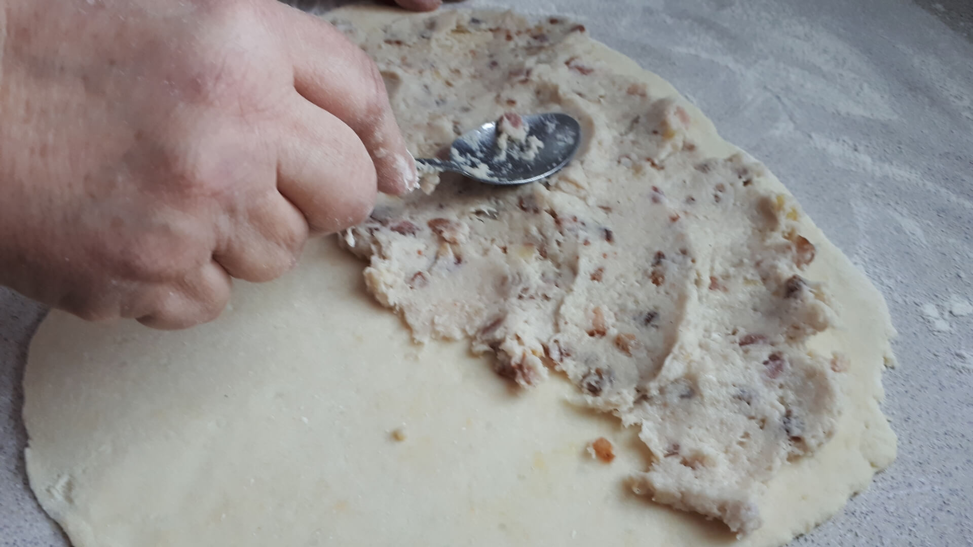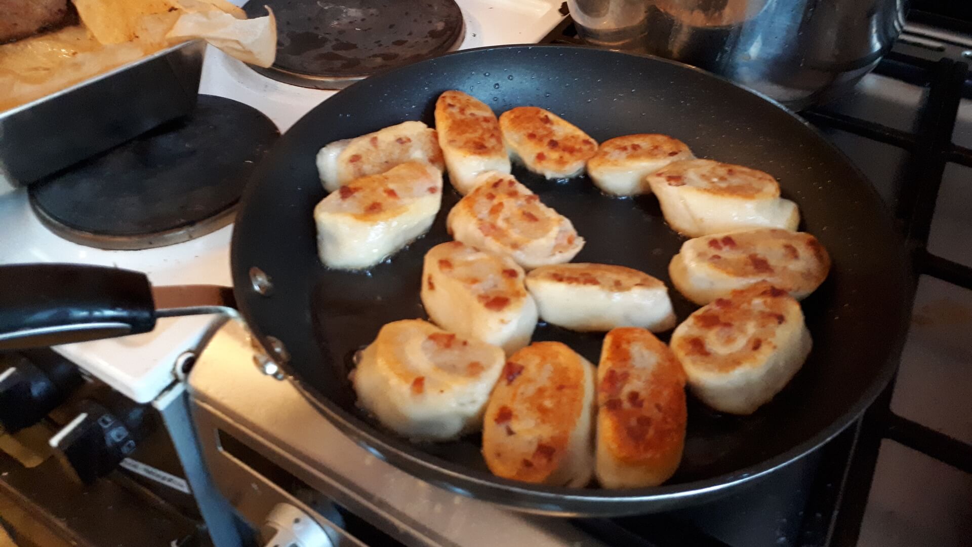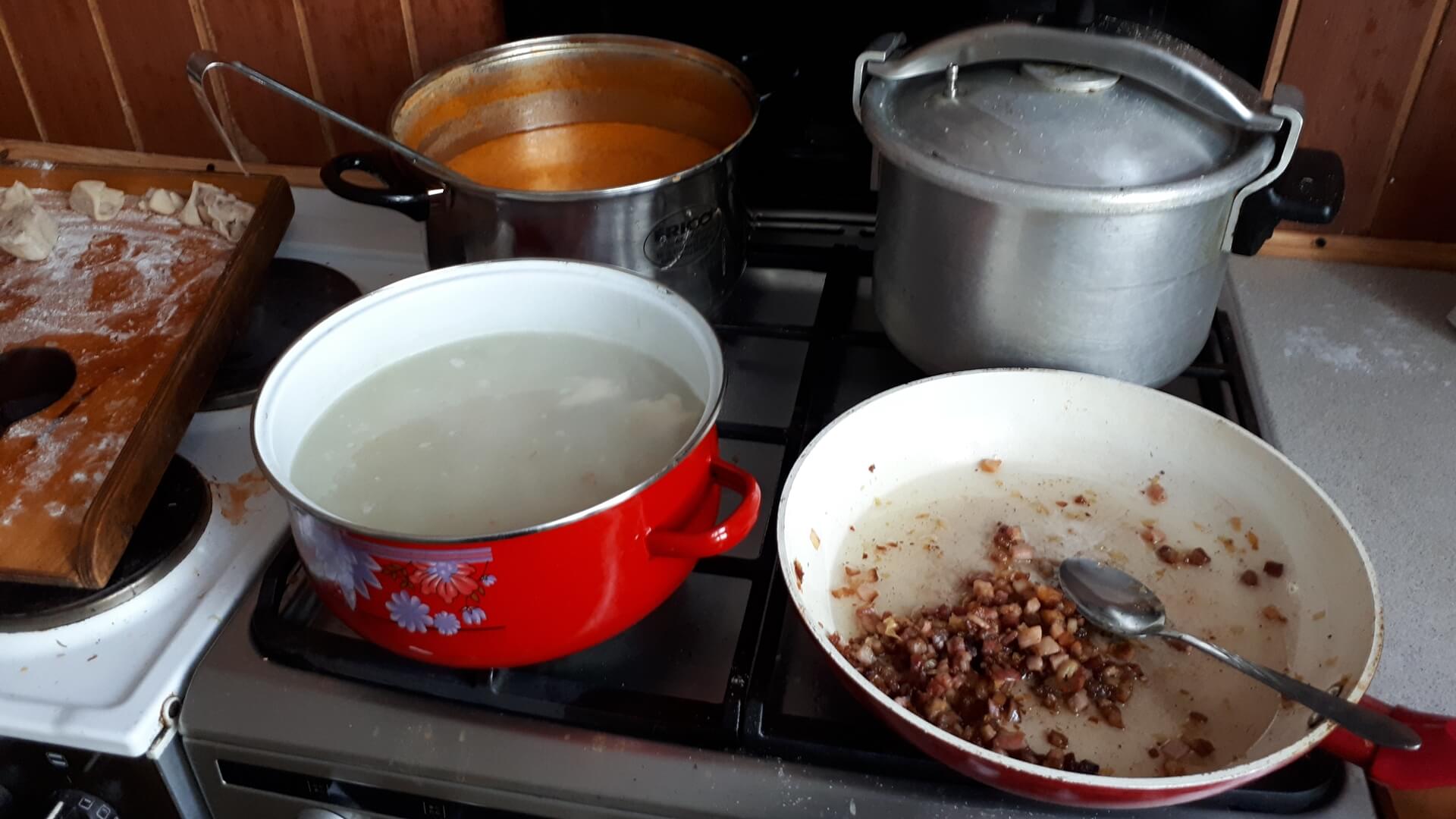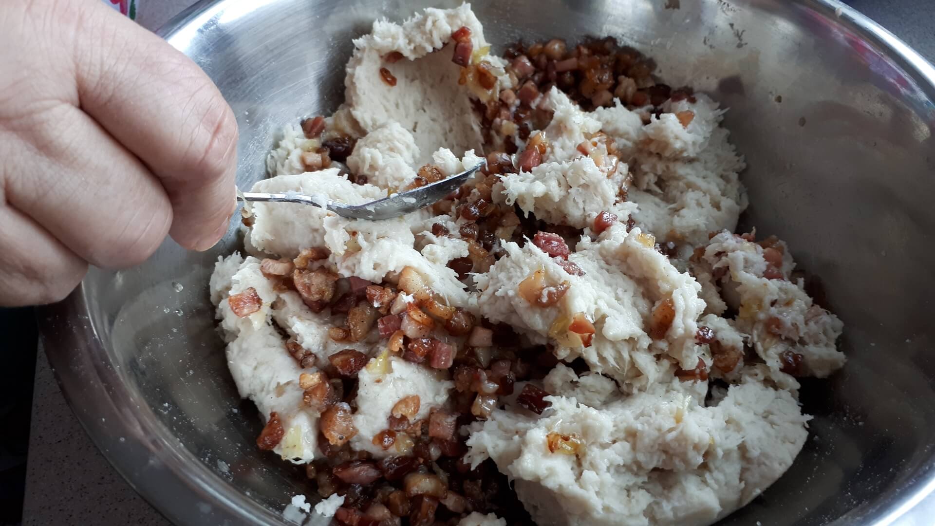 Pokrojony w drobną kostkę boczek podsmażamy na patelni (najpierw surowy, potem dodajemy wędzony, potem cebulkę), przyprawiamy solą i pieprzem.