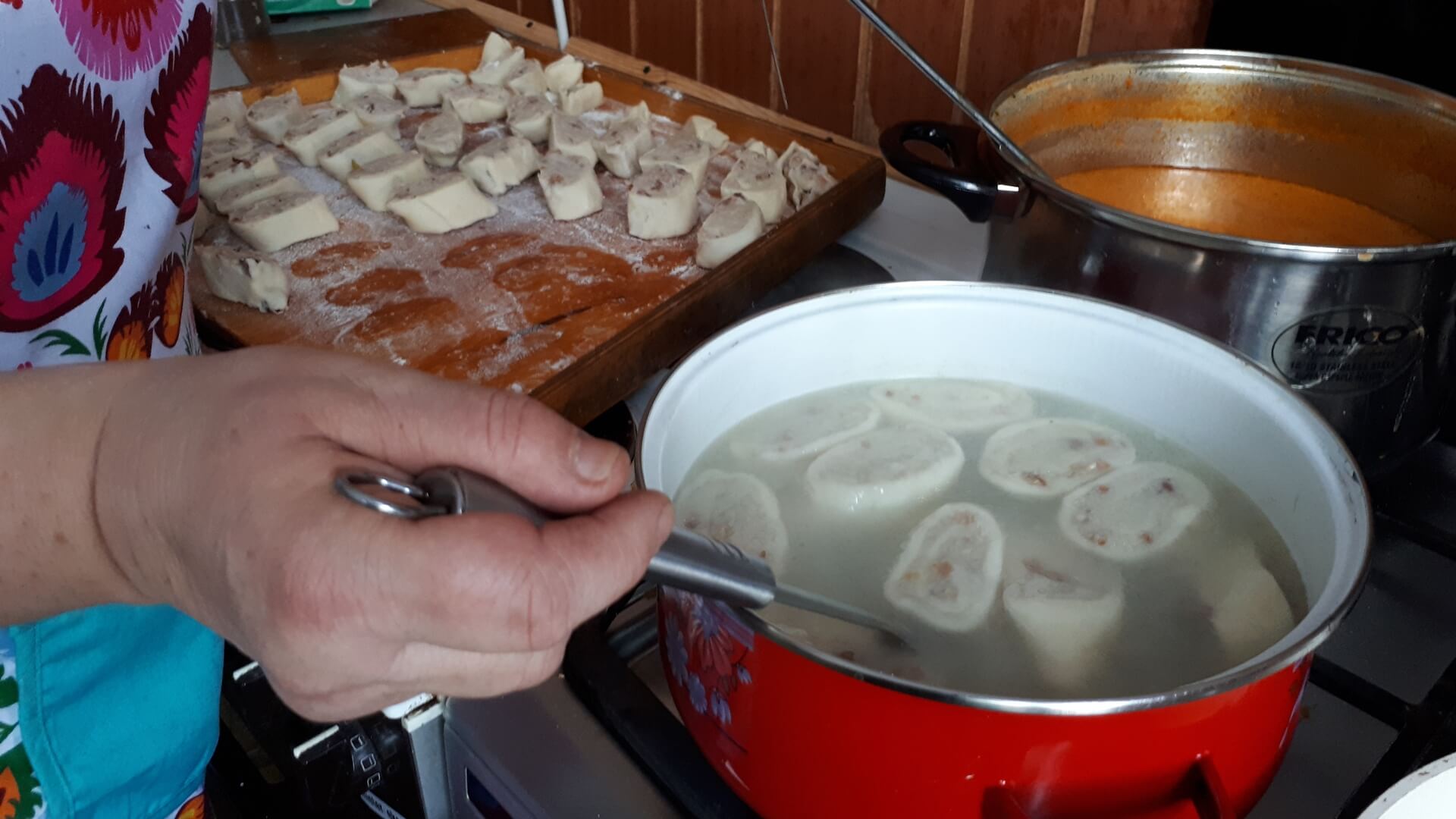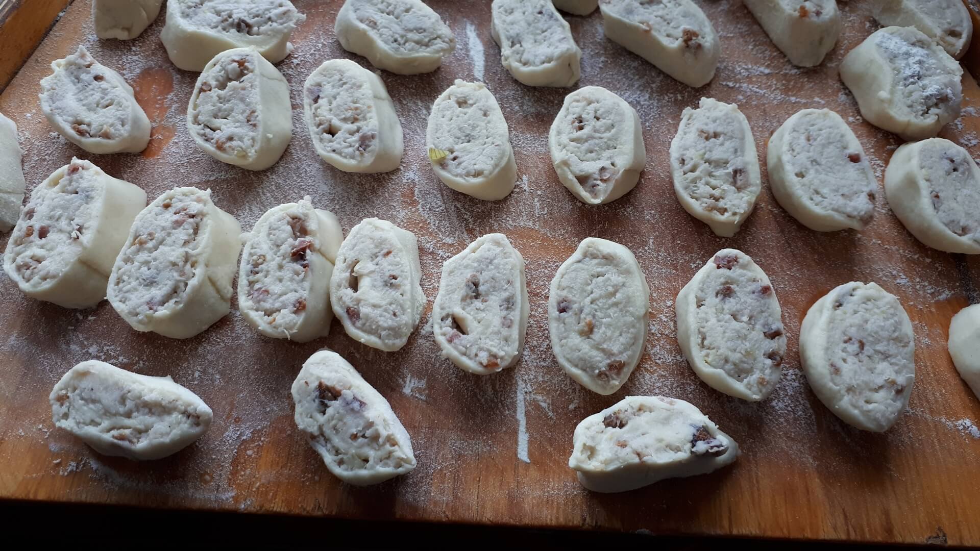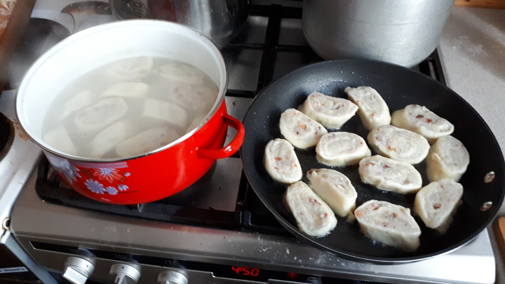 Ugotowane w osolonej wodzie ziemniaki przeciskamy przez praskę. Surowe ziemniaki ścieramy i wyciskamy przez szmatkę, by pozbyć się wody. Z wody na dnie naczynia zbierze się skrobia, którą dodajemy do wyciśniętych ziemniaków, do tego dodajemy też zmielone ziemniaki ugotowane (w proporcjach około 2:1), dodajemy też jajko, 2 łyżki mąki pszennej, 2 łyżki mąki ziemniaczanej, a potem podsmażony boczek z cebulą. Robimy drugie ciasto - kopytkowe (na 1 kg ugotowanych ziemniaków około pół kilograma mąki pszennej), dajemy 2 łyżki mąki ziemniaczanej, jajko i żółtko, i sól. Wyrabiamy ciasto kopytkowe, wałkujemy formując cienki prostokąt, który następnie smarujemy ciastem pyzowym z boczkiem. Zwijamy roladę, którą tniemy na skośne paski (o grubości około 2 cm). Takie krążki gotujemy w osolonej wodzie, delikatnie mieszając, by nie przywarły do dna garnka i nie rozkleiły się (około 10 minut). Po wyjęciu z wody, po chwili obsmażamy zaguby na oleju, by ładnie się przyrumieniły. Podajemy je posypane podsmażonym boczkiem.