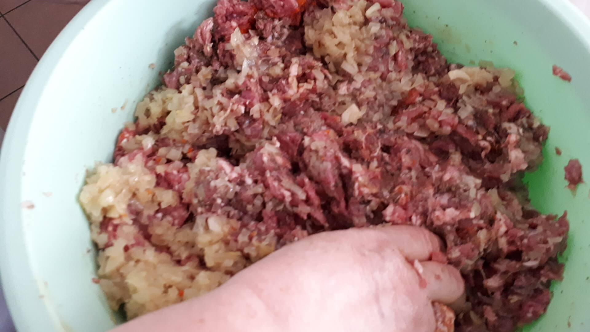 Mięso mielimy przez grube oczka jak na kiełbasę. Siekamy czosnek, który uciskamy z solą i dodajemy do mięsa. Pokrojoną cebulę podsmażamy, dodajemy ją do mięsa po ostudzeniu. Przyprawiamy farsz solą, pieprzem i majerankiem. Dość długo wyrabiamy mięso dodając też ponad szklankę przegotowanej (lub mineralnej) wody. Tak przygotowane mięso odstawiamy na kilkanaście minut do lodówki.