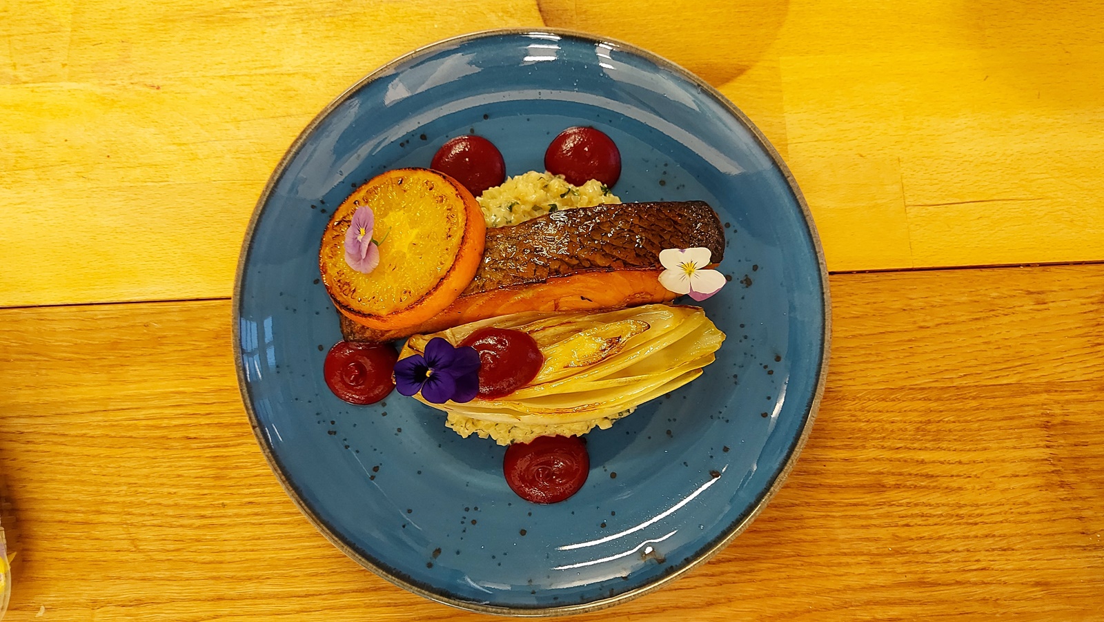 Łososia (grubość około 2 cm) smażymy na maśle, najpierw od strony skórki, delikatnie przyciskając, by mięso zachowało kształt. Po 2-3 minutach kładziemy na patelnię połowę cykorii i plaster pomarańczy. Dodajemy łyżkę miodu i chwilę jeszcze podsmażamy.
