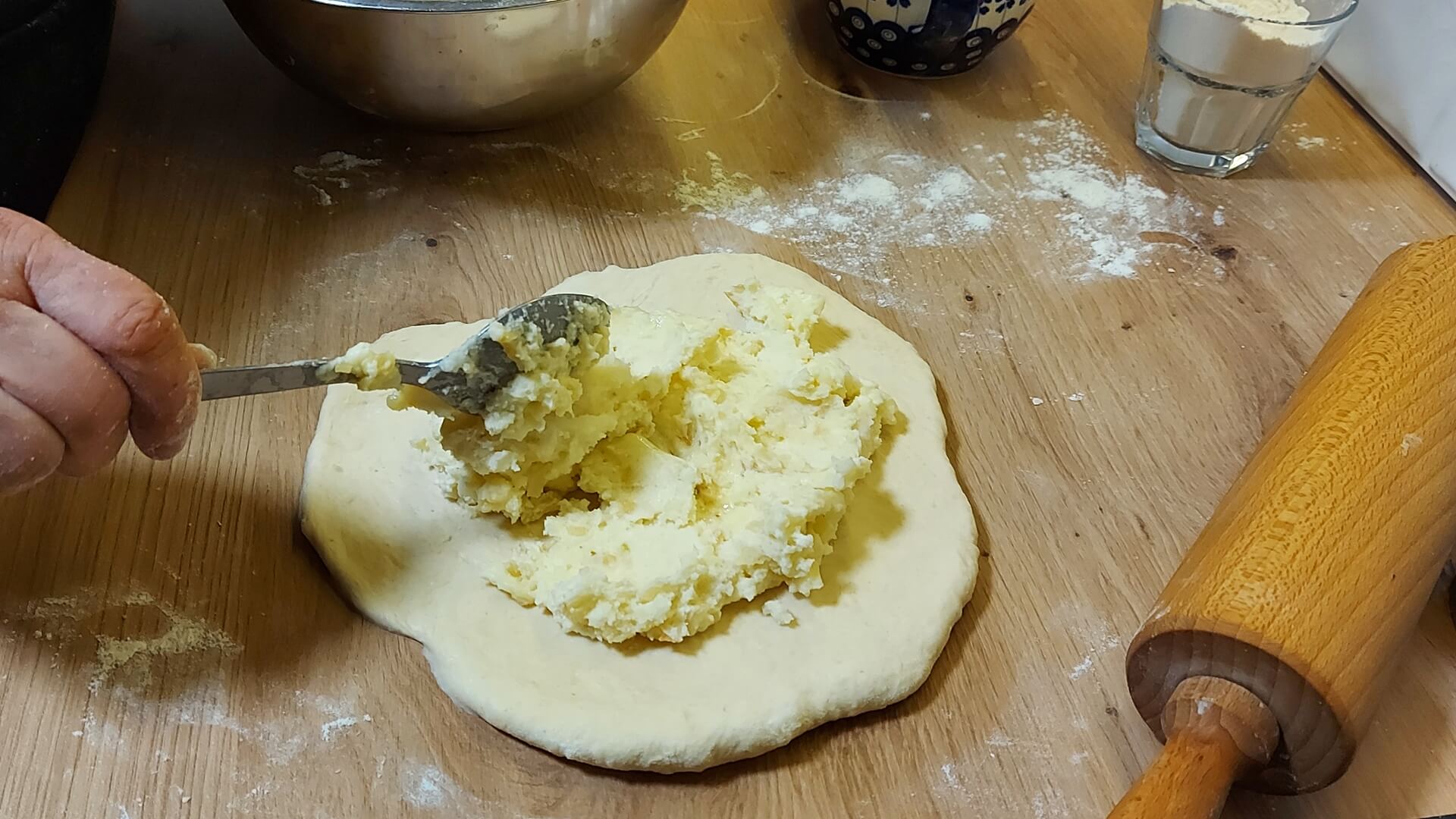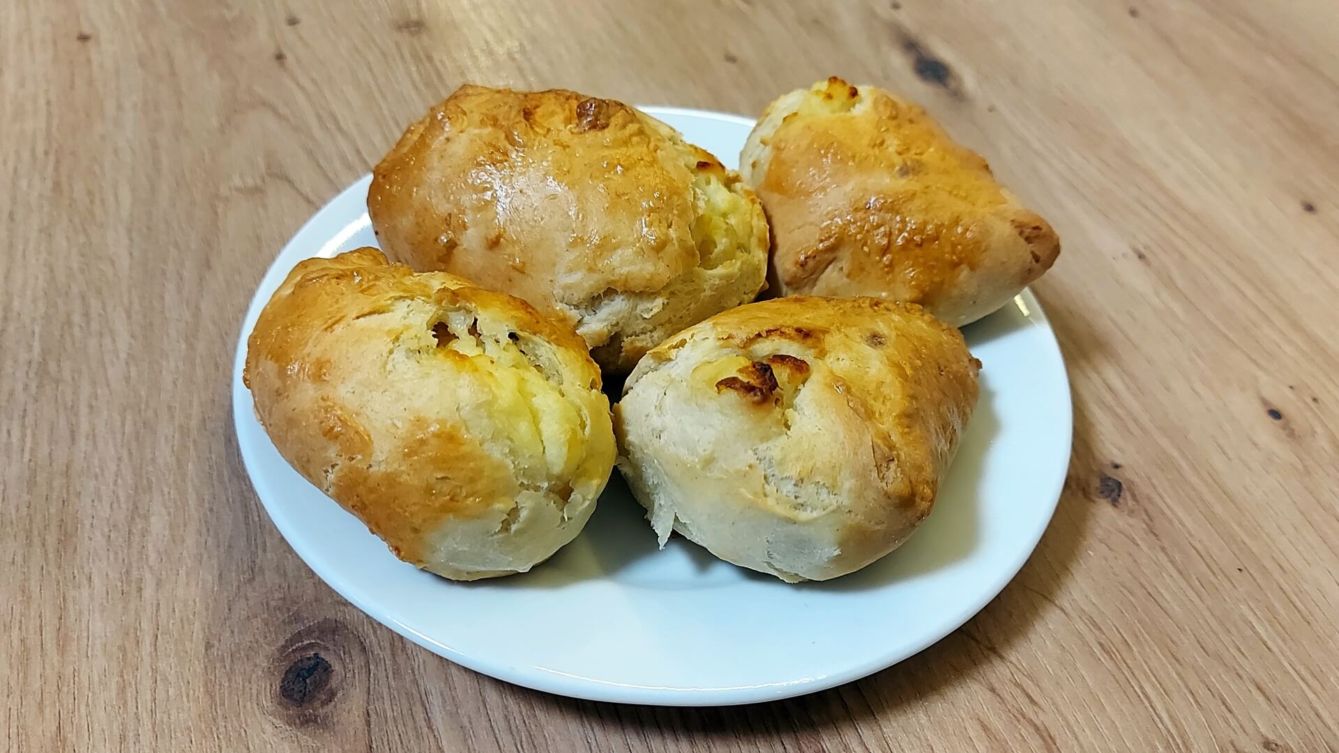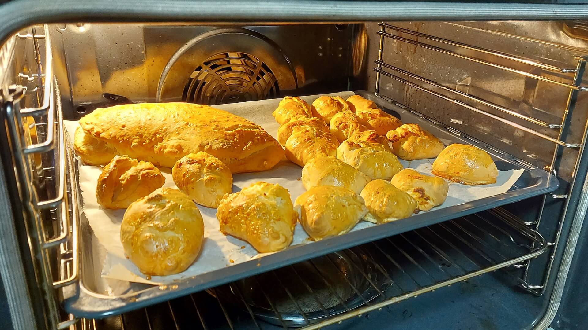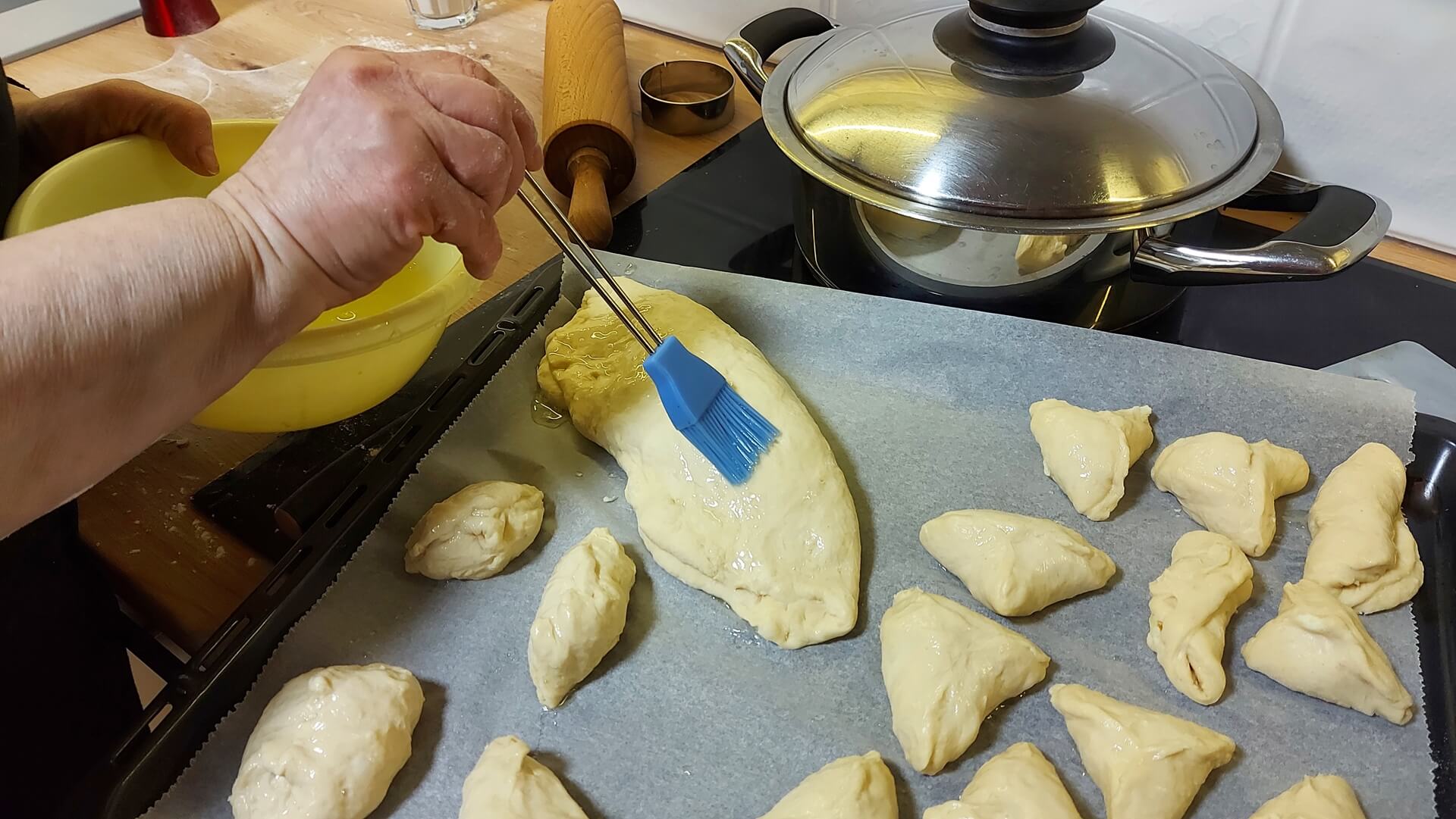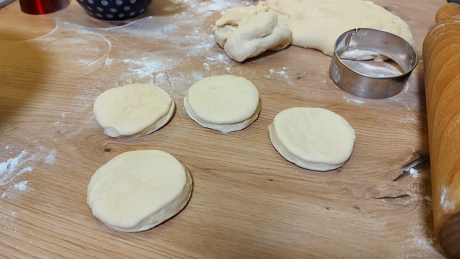 Z mąki, mleka, masła i drożdży wyrabiamy ciasto i odstawiamy je do wyrośnięcia. Ciasto rozwałkowujemy na grubość około 1 cm, wycinamy koła, które nadziewamy farszem i sklejamy. Układamy na blasze wyłożonej papierem do pieczenia, smarujemy roztrzepanym jajkiem. Pieczemy 25 minut w piekarniku rozgrzanym do 180 stopni Celsjusza.