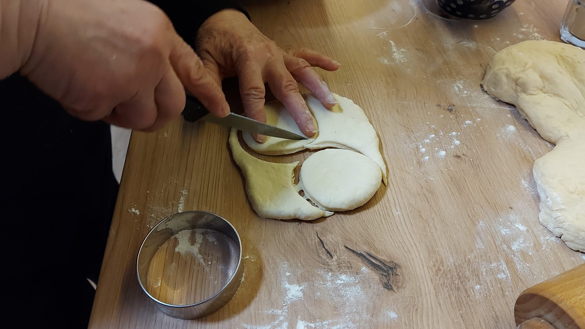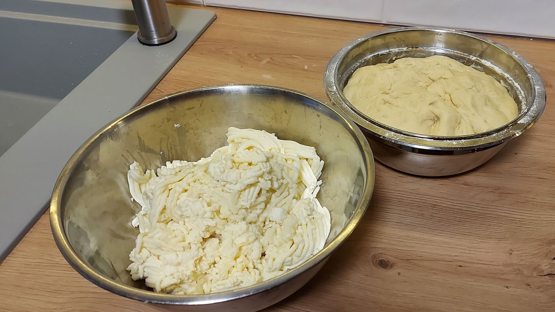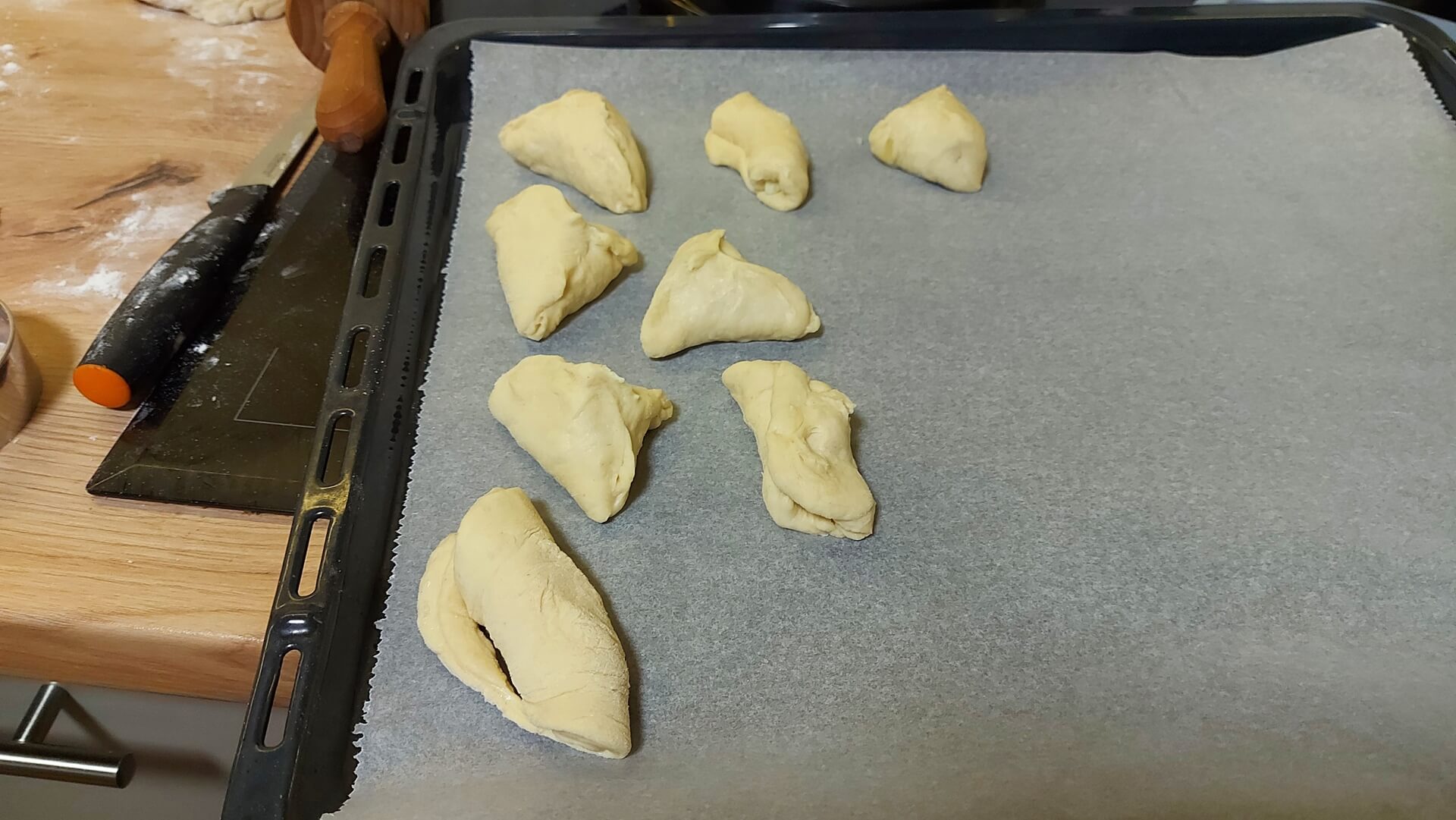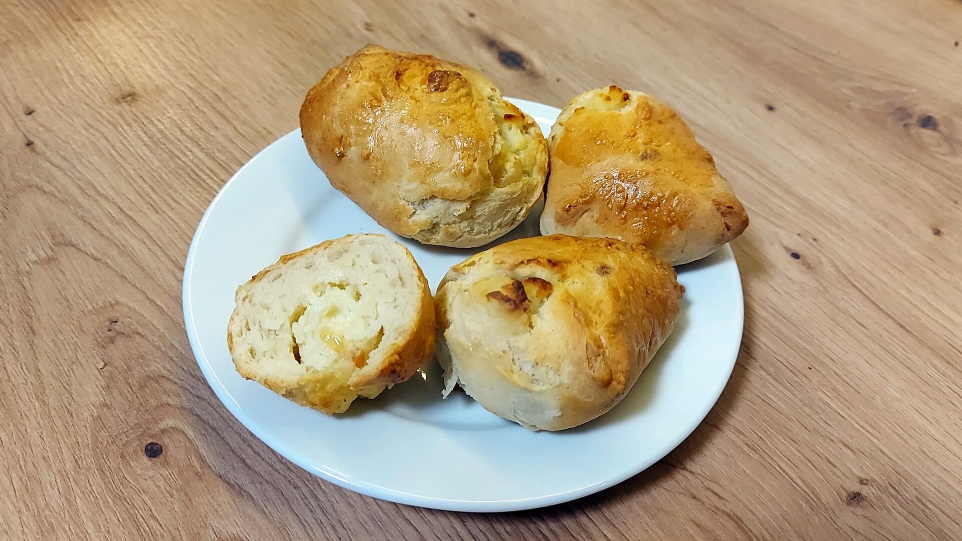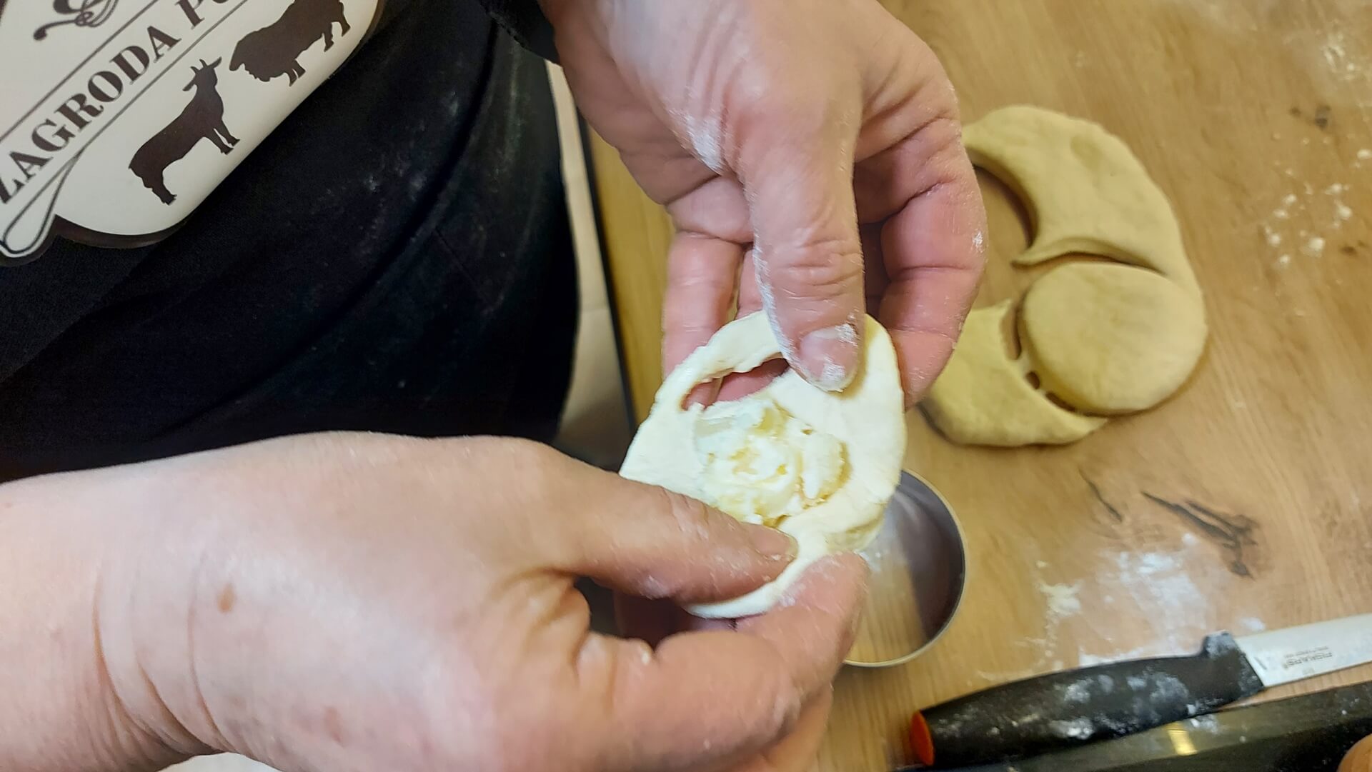 Z mąki, mleka, masła i drożdży wyrabiamy ciasto i odstawiamy je do wyrośnięcia. Ciasto rozwałkowujemy na grubość około 1 cm, wycinamy koła, które nadziewamy farszem i sklejamy. Układamy na blasze wyłożonej papierem do pieczenia, smarujemy roztrzepanym jajkiem. Pieczemy 25 minut w piekarniku rozgrzanym do 180 stopni Celsjusza.
