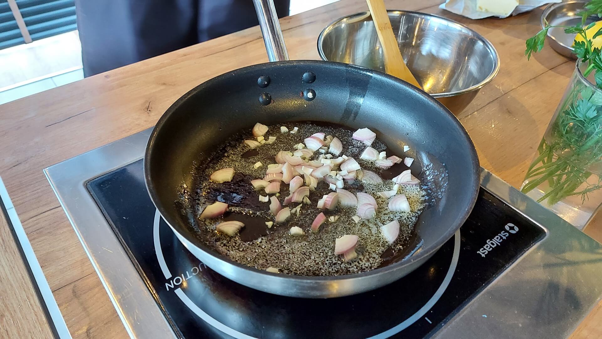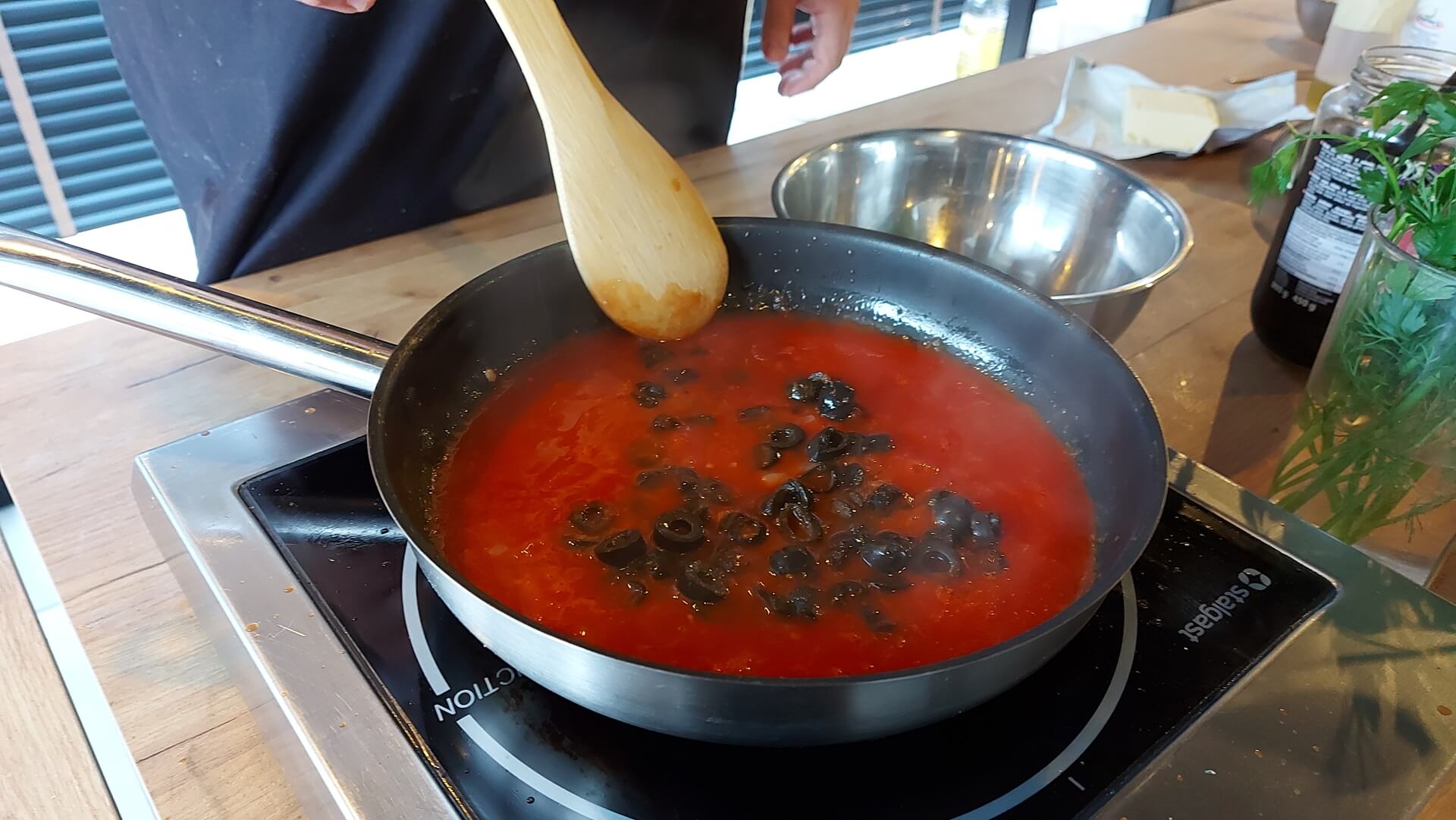 Pomidory miksujemy, dodajemy do nich czarne oliwki i podsmażone połówki szalotki (jeszcze chwilę gotujemy i przyprawiamy). Na tak przygotowany sos pomidorowy kładziemy dorsza i gotujemy pod przykrywką około 20 minut na małym ogniu.
