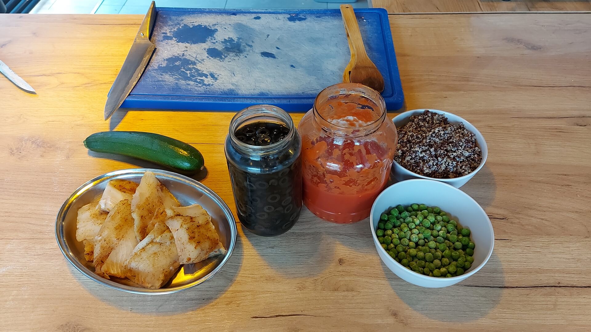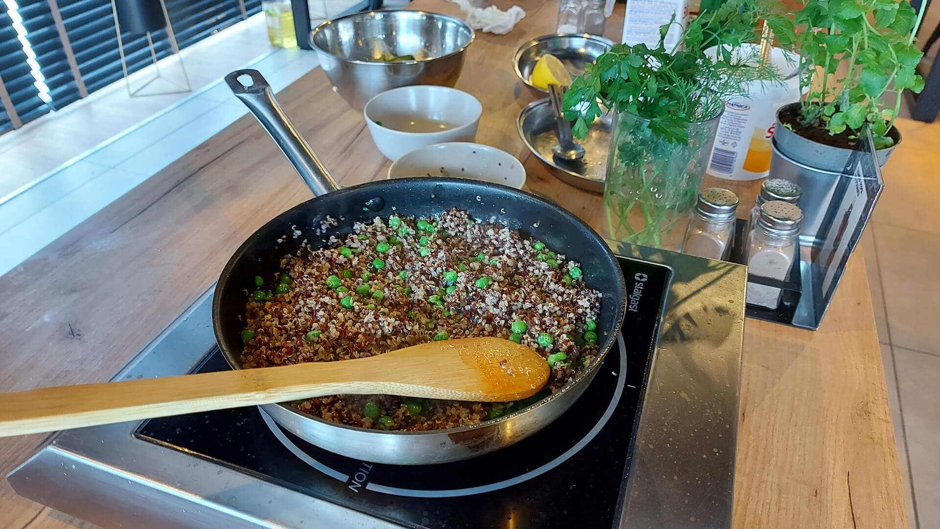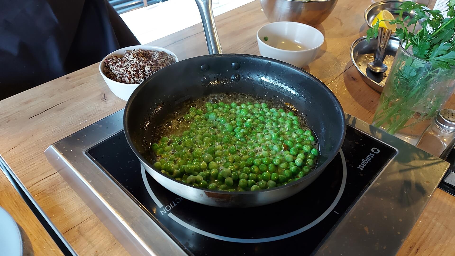 Komosę dokładnie płuczemy pod bieżącą wodą i odcedzamy na sicie. Następnie gotujemy ją w bulionie warzywnym (na 100 gramów kaszy dajemy 200 ml bulionu). Gotujemy, aż woda odparuje, zdejmujemy z palnika i dostawiamy, by kasza wchłonęła resztę bulionu. Na patelni rozgrzewamy masło i wrzucamy mrożony groszek, po chwili dodajemy ugotowaną komosę.
