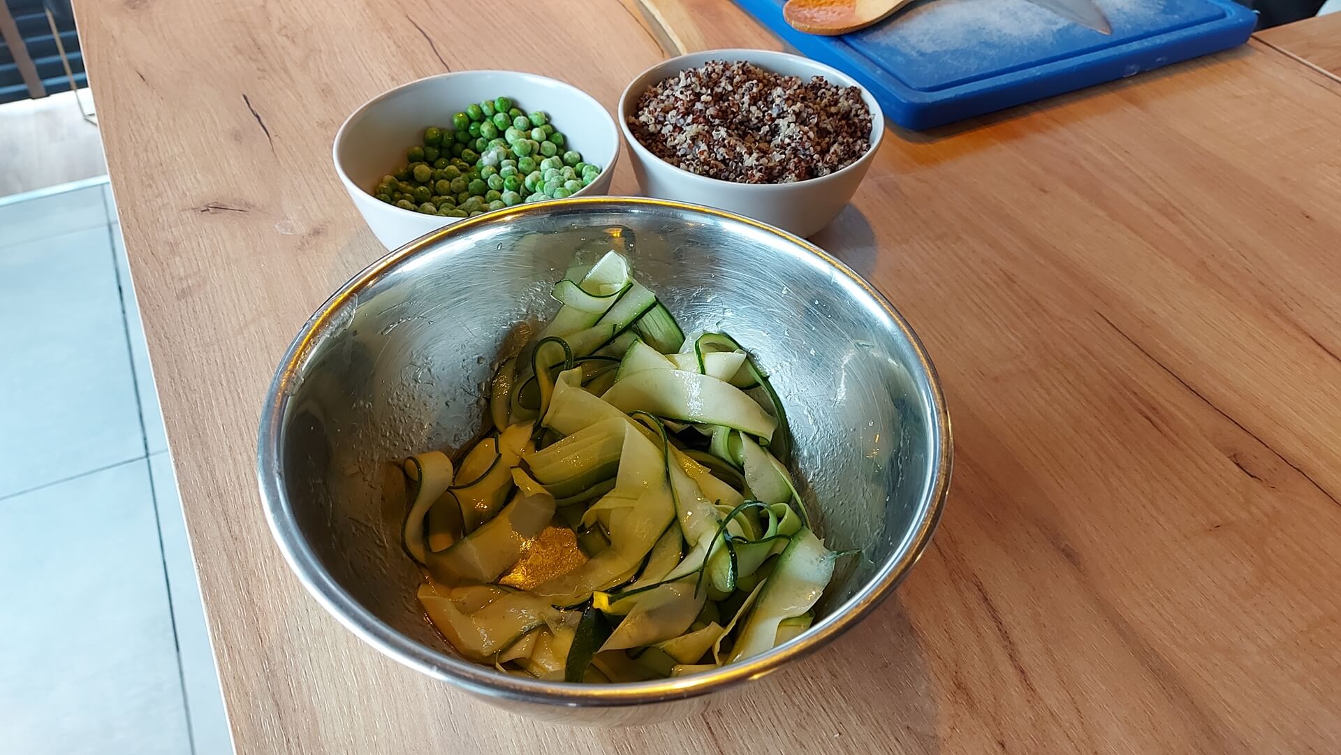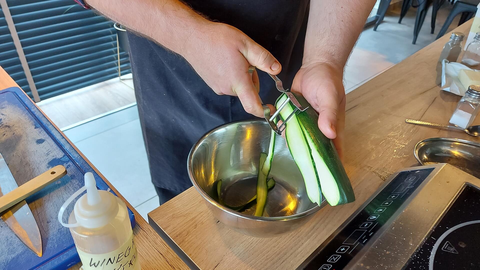 Cukinię tniemy obieraczką do warzyw na cieniutkie plasterki (żeby na jednym boku była skórka) i mieszamy ją z sosem - cytrynowym winegret.
