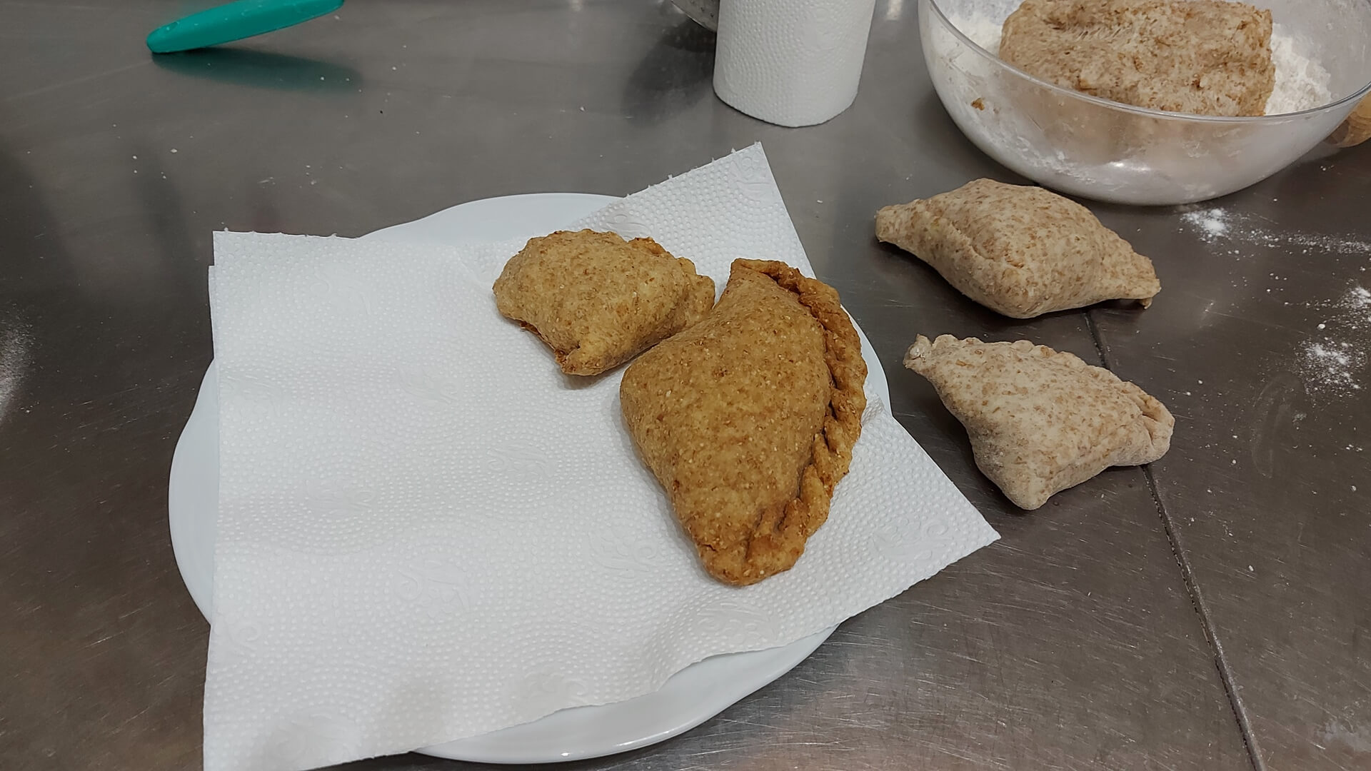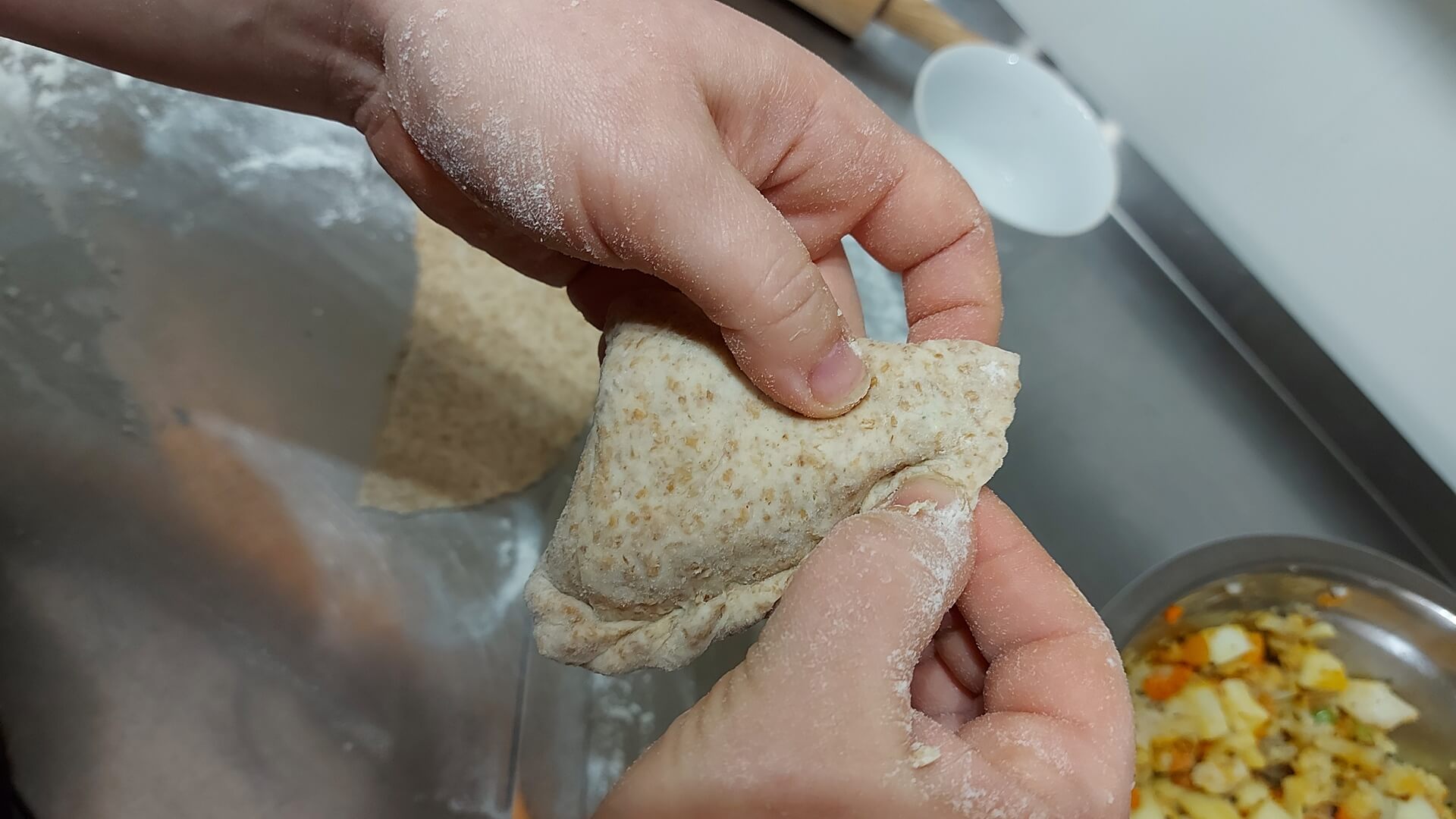 Półksiężyc sklejamy w stożek, który nadziewamy farszem. Następnie sklejamy (smarując bok wodą), robimy warkocz, formujemy pieróg.