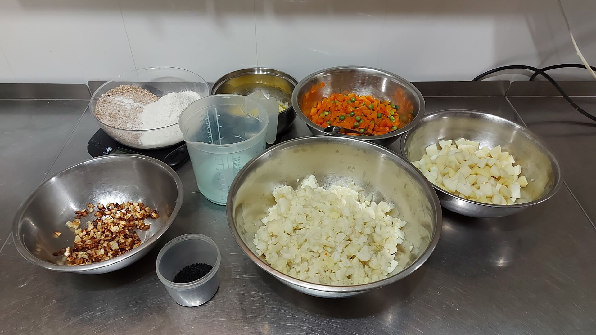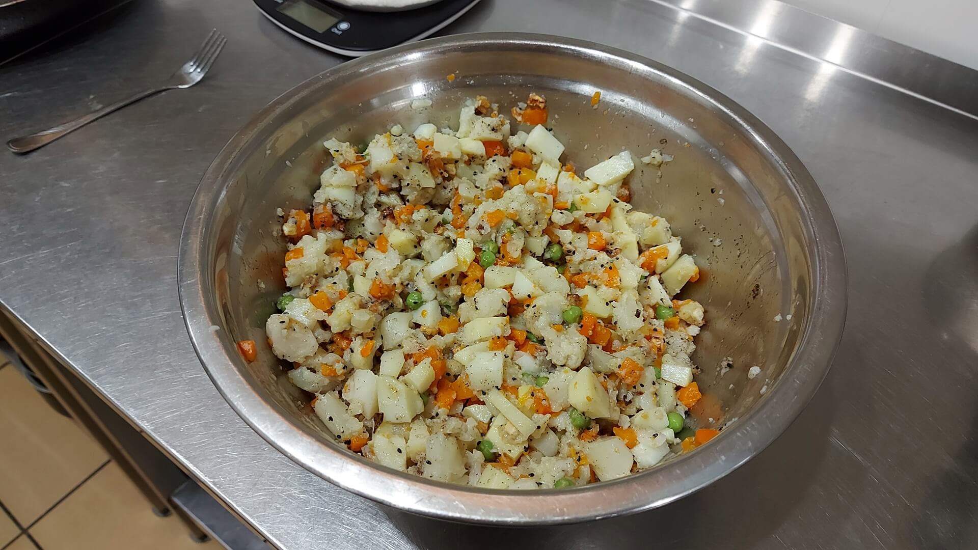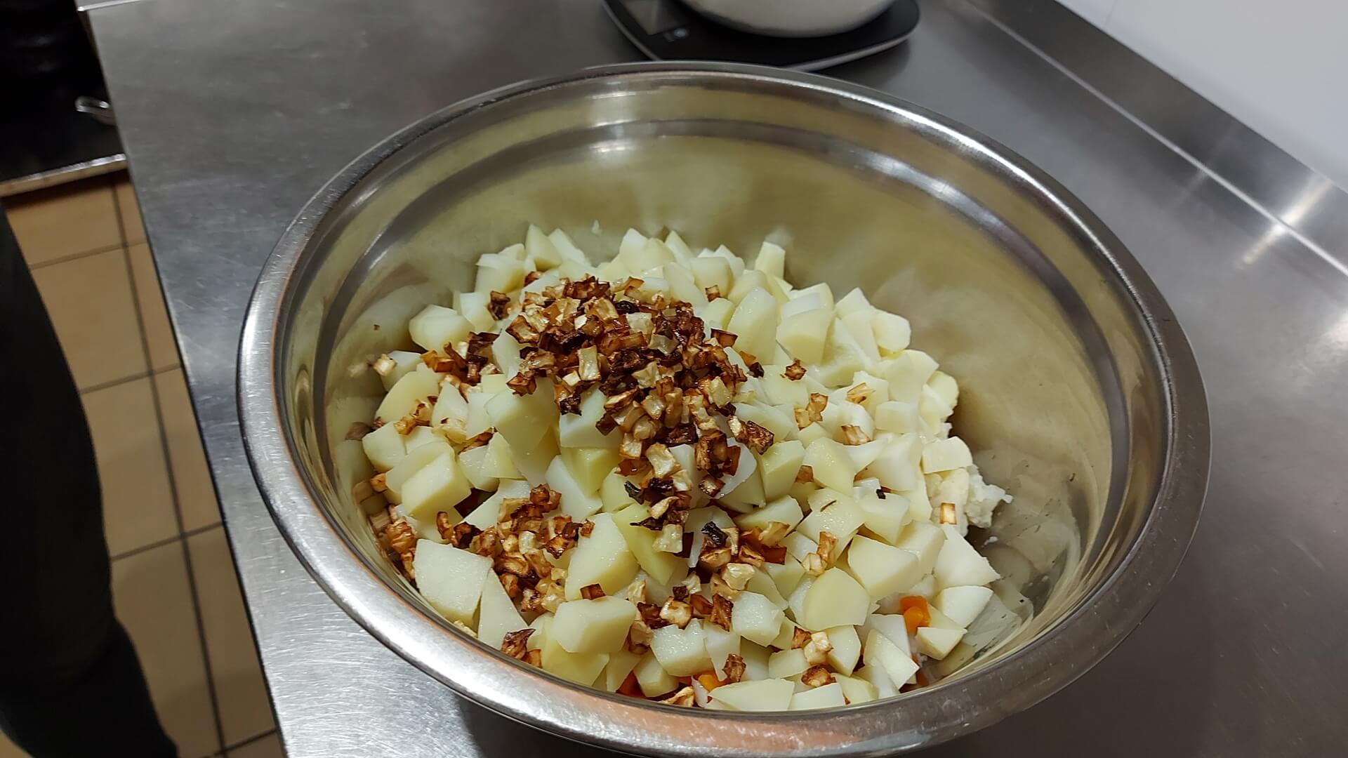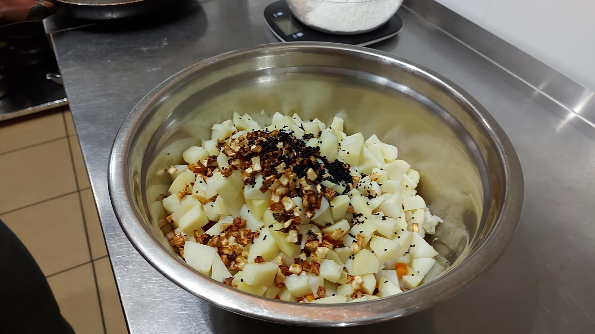 farsz: ugotowane ziemniaki, marchew z groszkiem zielonym, kalafior i podsmażony seler (pokrojony w kostkę), czarnuszka, sól, pieprz