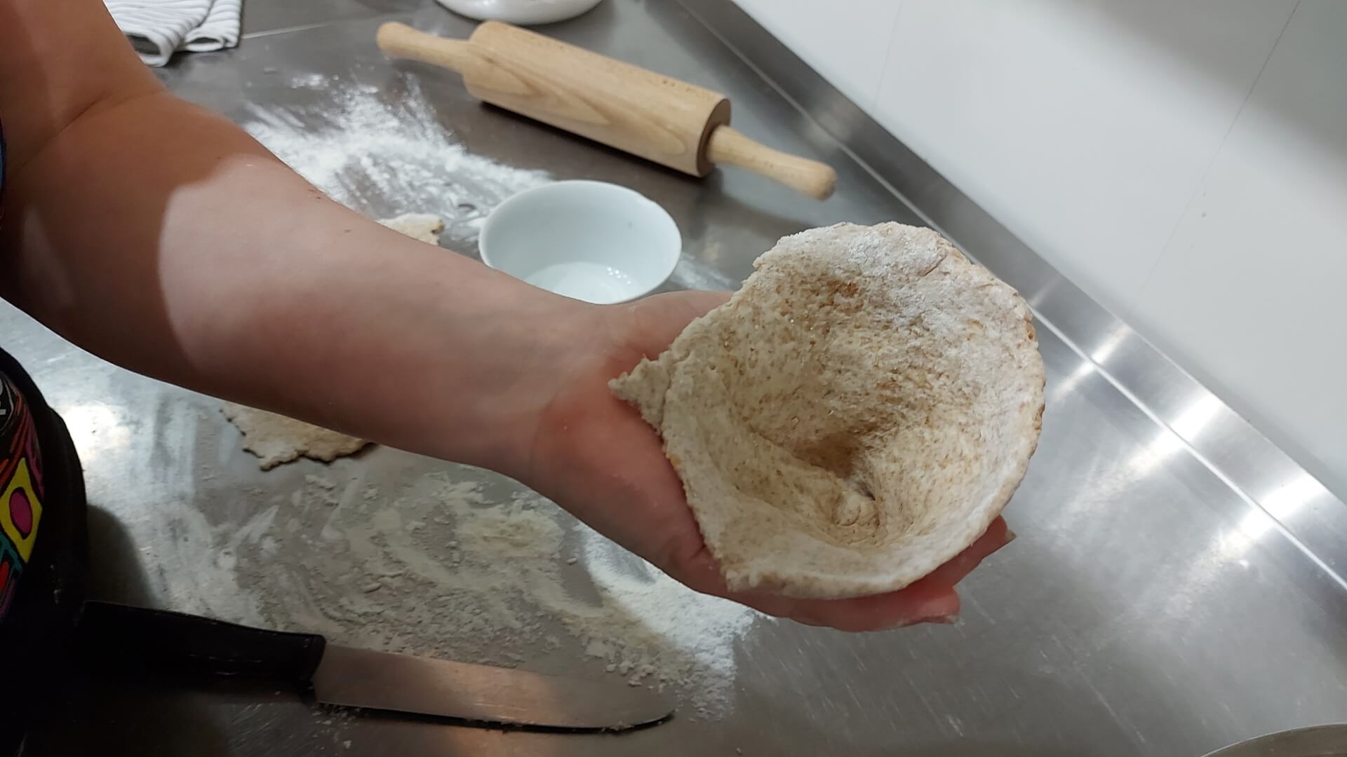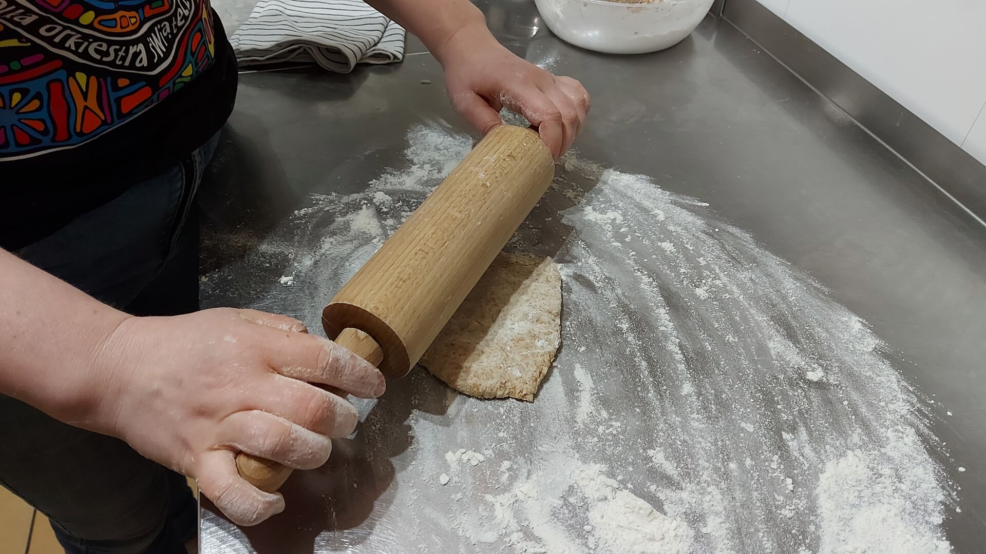 Zagniatamy ciasto, które następnie rozwałkowujemy na okrągły placek o grubości około 3 milimetrów. Placek kroimy na połowę.