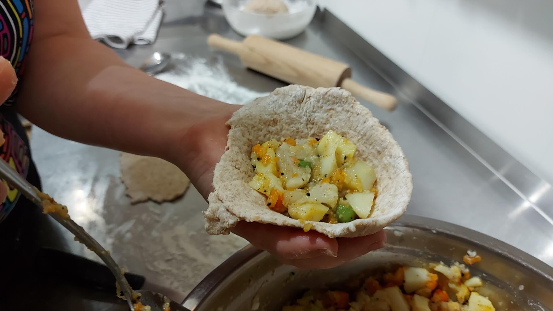 Ugotowane warzywa kroimy w kostkę (wielkość groszku zielonego). Do farszu można też dodać ugotowane pokrojone mięso (na przykład z kurczaka), przyprawiamy solą, pieprzem i czarnuszką podsmażoną na patelni (bez tłuszczu).