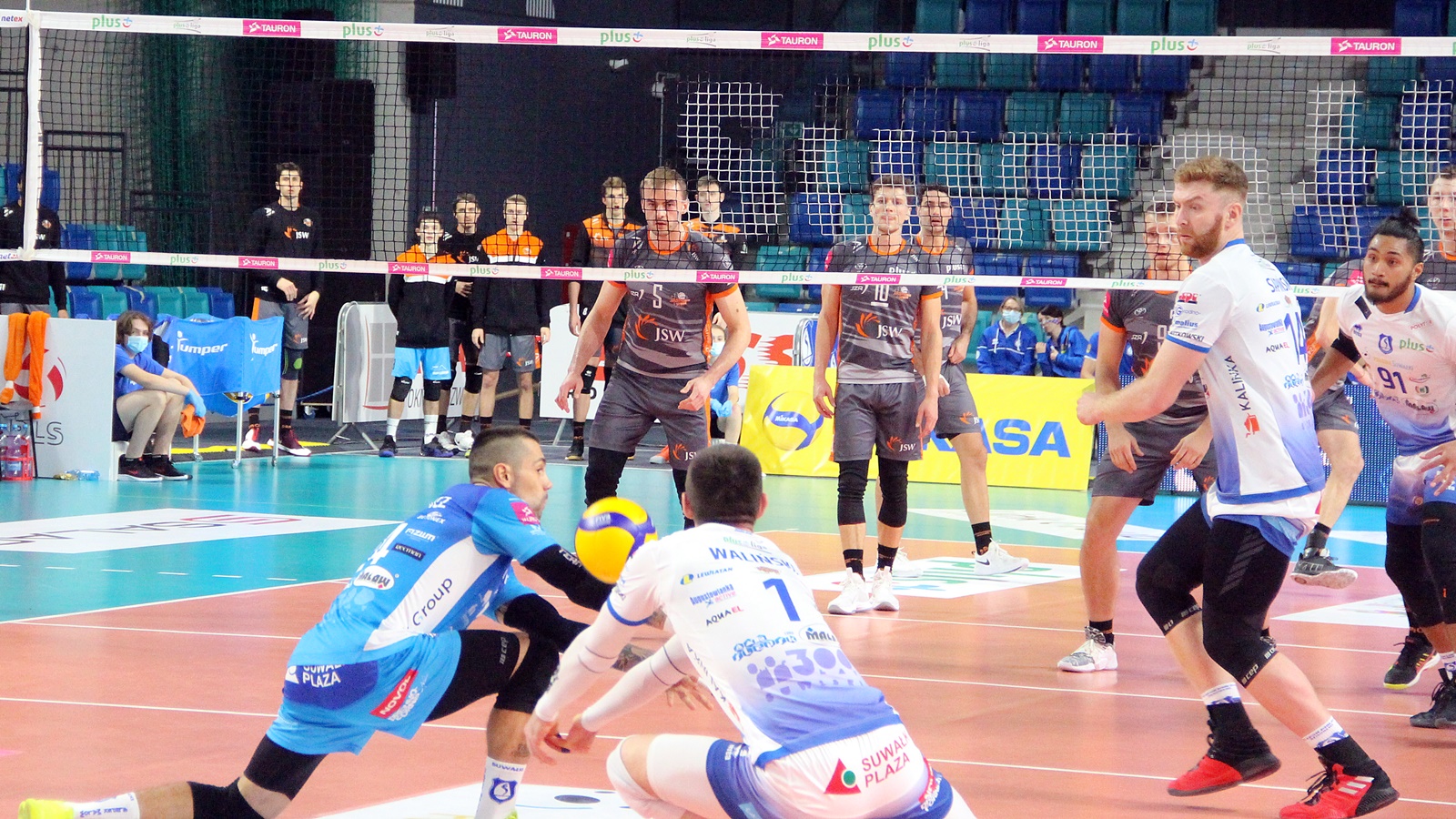 Pierwszy punkt w meczu zdobywa dla gości Jakub Bucki. Odpowiada kapitan suwalczan - Łukasz Rudzewicz. Zagrywką nęka biało-niebieskich Lukas Kampa. Jastrzębianie odskakują na 7:4, o czas prosi trener Kowal. Zespół ze Śląska podwyższa prowadzenie. Na parkiecie pojawiają się Kacper Gonciarz i Łukasz Kaczorowski, ale wyniku pierwszego seta nie udaje się już uratować - 17:25 dla Jastrzębskiego Węgla.