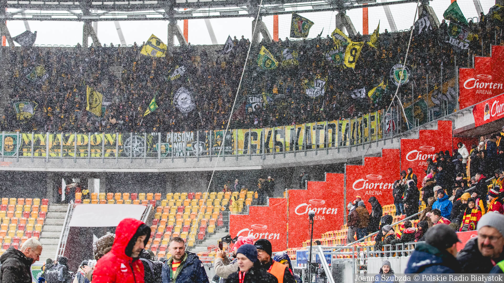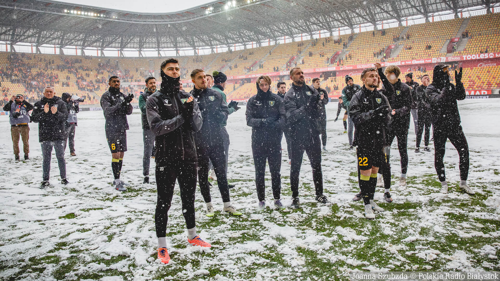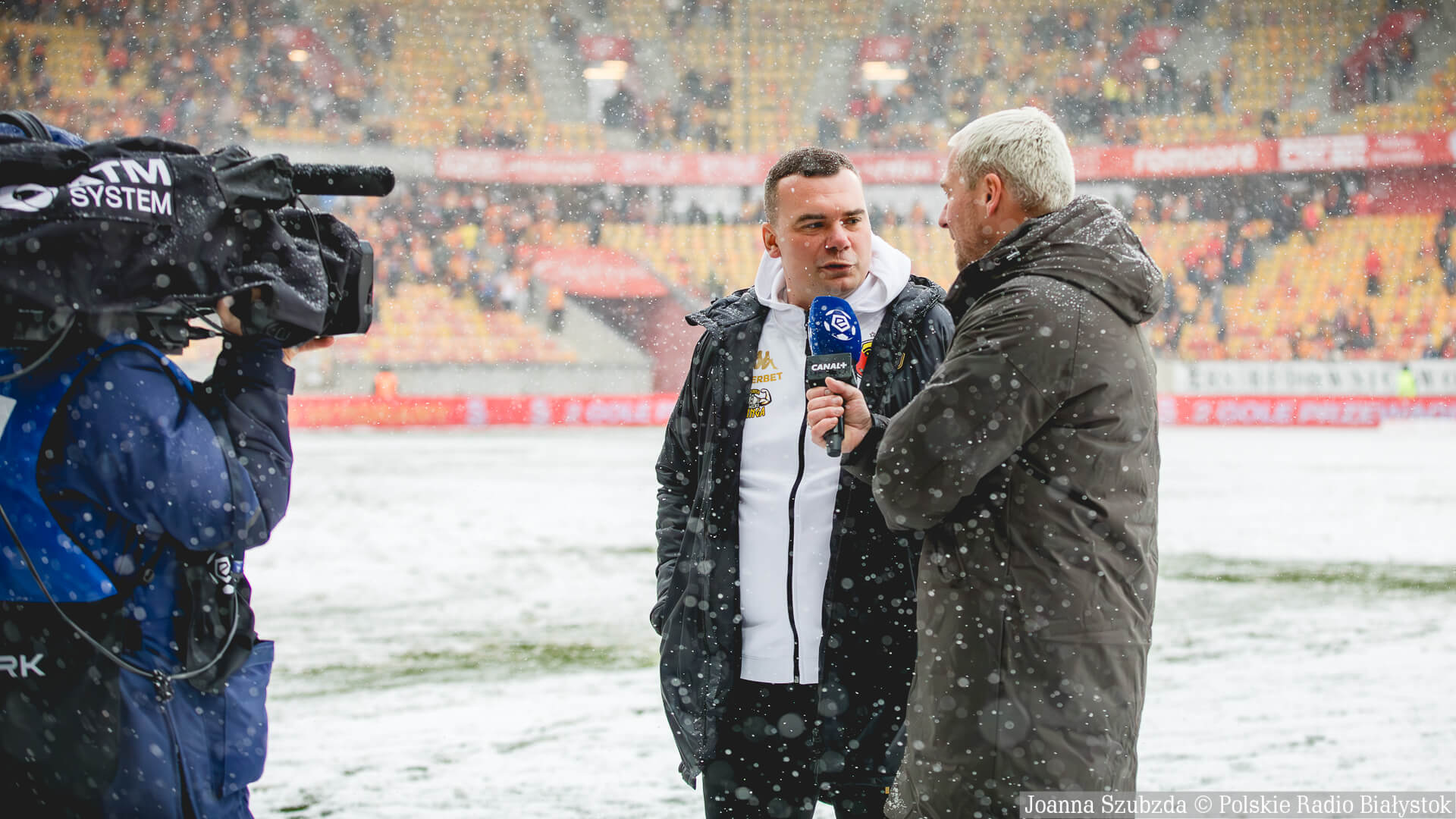Ludzie byli w gotowości od nas z łopatami, siedem osób. Również osoby z Jagiellonii były chętni do tego, żeby wziąć łopaty i odśnieżać. Jakby była decyzja, że mecz ma być rozegrany i trzeba odśnieżać, to oczywiście ekipa bierze i odśnieża. My byliśmy w gotowości - mówił po meczu dziennikarzom Cezary Mielko.