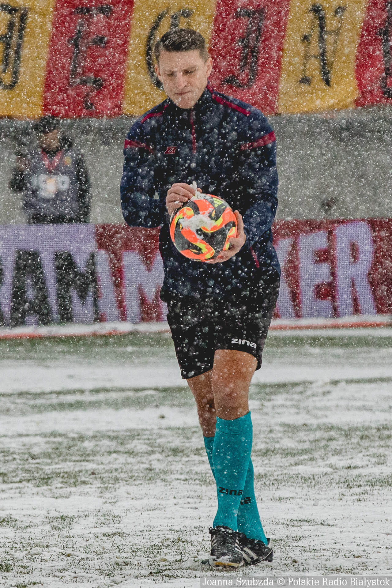 Piłka zbiera śnieg, mimo że jest koloru pomarańczowego i te warunki zagrażają zdrowiu i bezpieczeństwu zawodników. A to jest dla nas najważniejsze, żebyśmy ten mecz zagrali w normalnych warunkach. Żeby obie drużyny miały takie samo prawo do gry w piłkę nożną, a nie żebyśmy się kierowali przypadkiem - mówił arbiter.