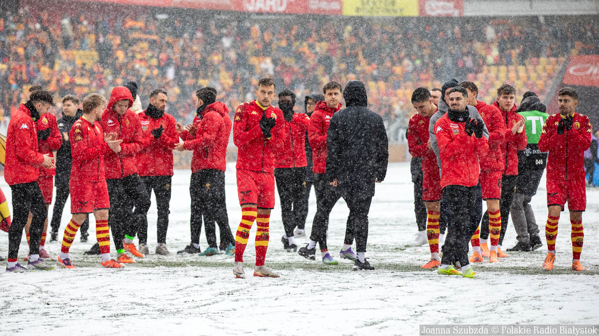Ponad godzinę przed meczem zaczął w Białymstoku padać gęsty śnieg i w krótkim czasie boisko było już białe.