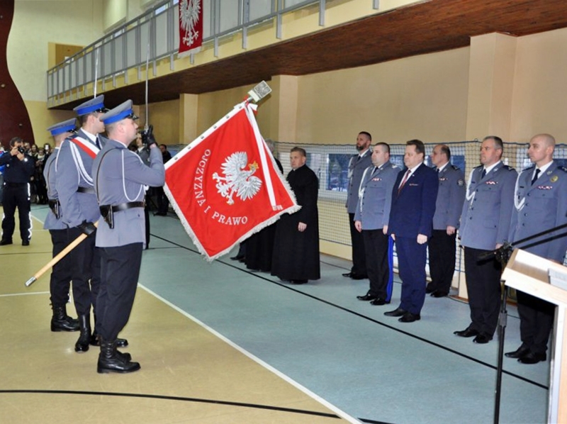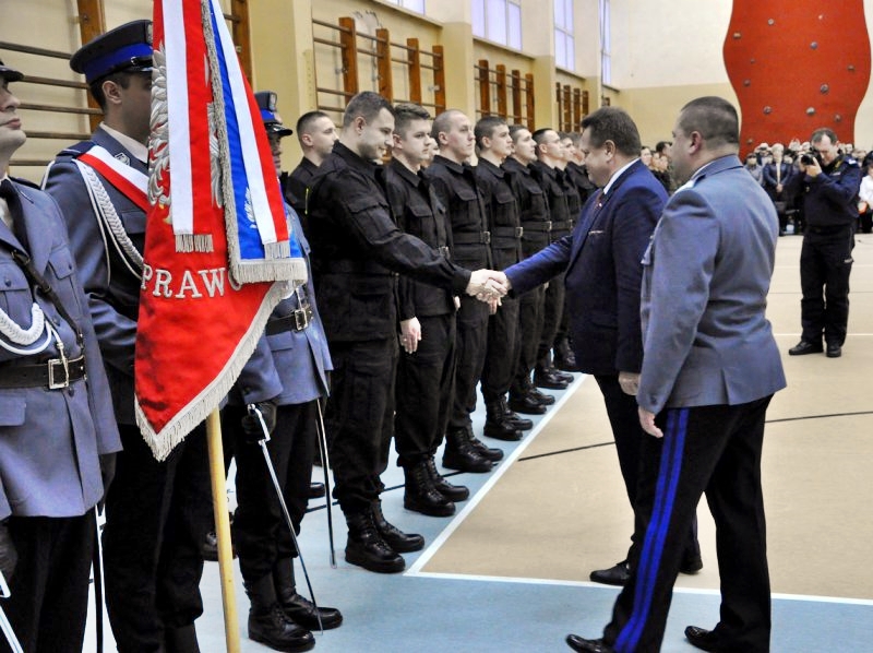 36 nowych policjantów złożyło w poniedziałek (9.1) w Białymstoku ślubowanie. W uroczystości wzięli udział sekretarz stanu w ministerstwie spraw wewnętrznych i administracji Jarosław Zieliński oraz Komendant Wojewódzki Policji w Białymstoku nadinspektor Daniel Kołnierowicz.