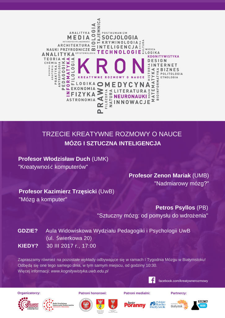 Wykłady białostockich naukowców i gości z innych uczelni w kraju będą w czwartek (30.03) od 10:30 do 16:30 w auli przy ul. Świerkowej w Białymstoku. O 17:00 natomiast rozpoczną się tu III Kreatywne Rozmowy o Nauce pt.: "Mózg i sztuczna inteligencja". KRON to projekt popularyzujący naukę, zainicjowany w lutym 2016 roku przez studentów i doktorantów na Uniwersytecie w Białymstoku. Od początku cieszy się dużą popularnością wśród studentów, uczniów i mieszkańców miasta.