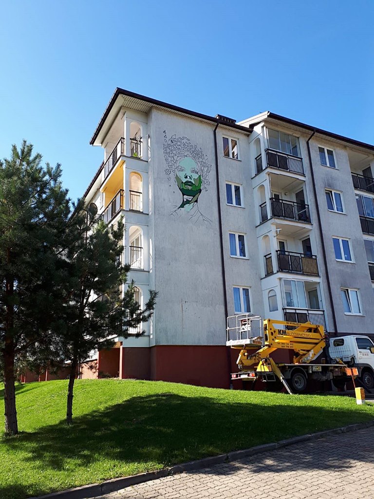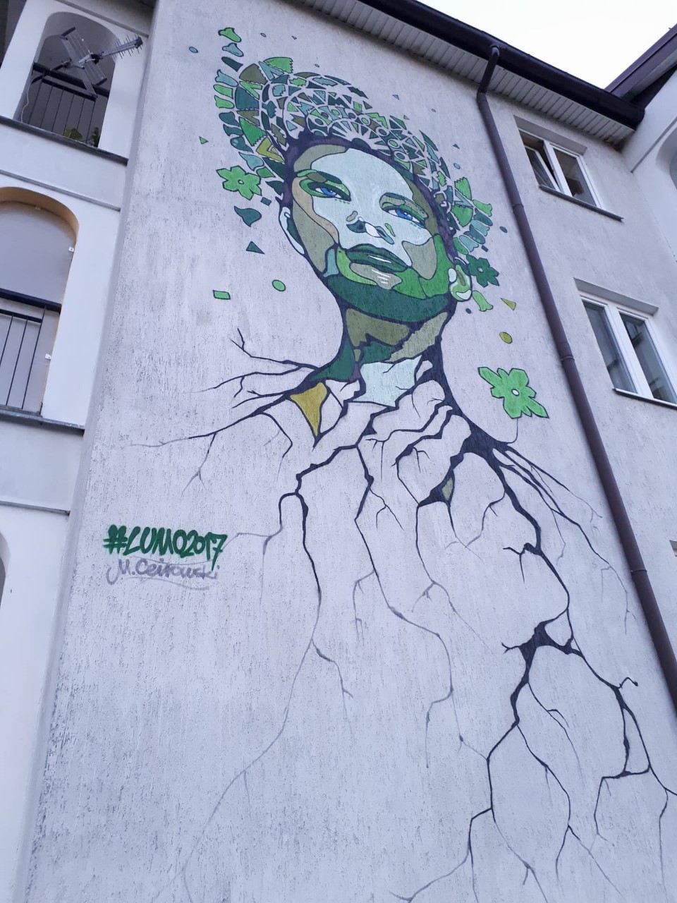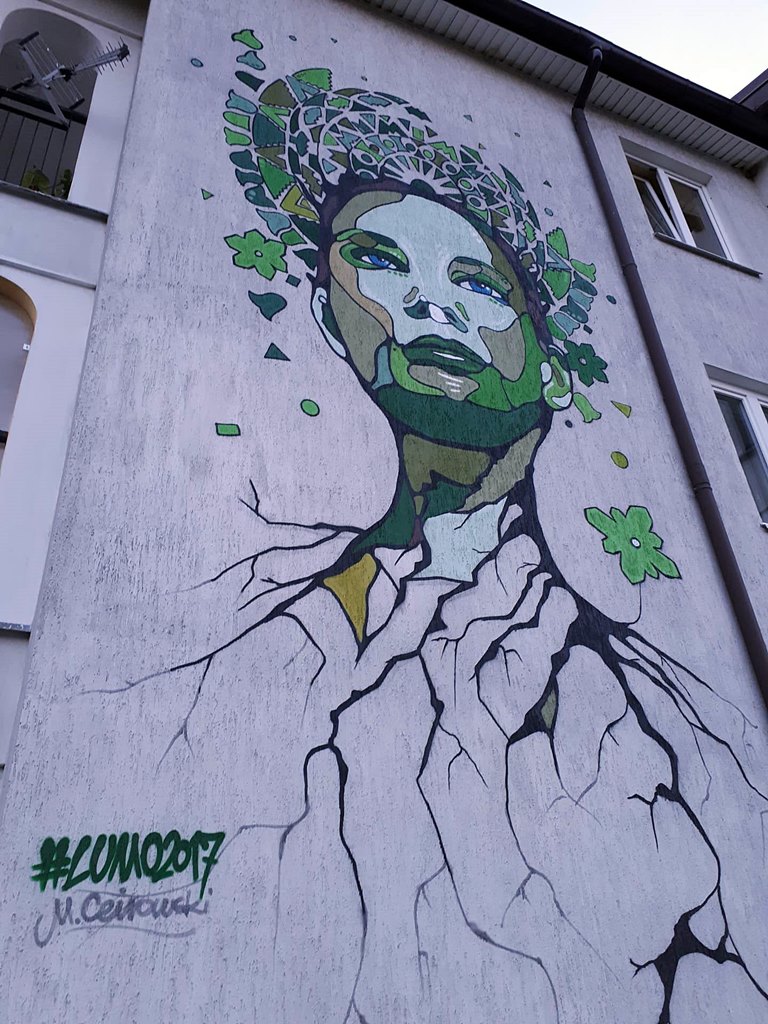 Mural przedstawia twarz Matki Natury. Jest kilkumetrowy, a dominującym kolorem jest zieleń. Kolorystycznie nawiązuje do okolicy.