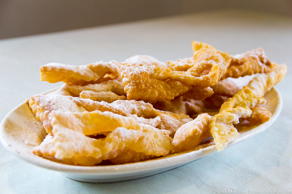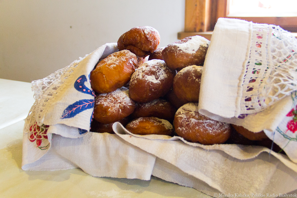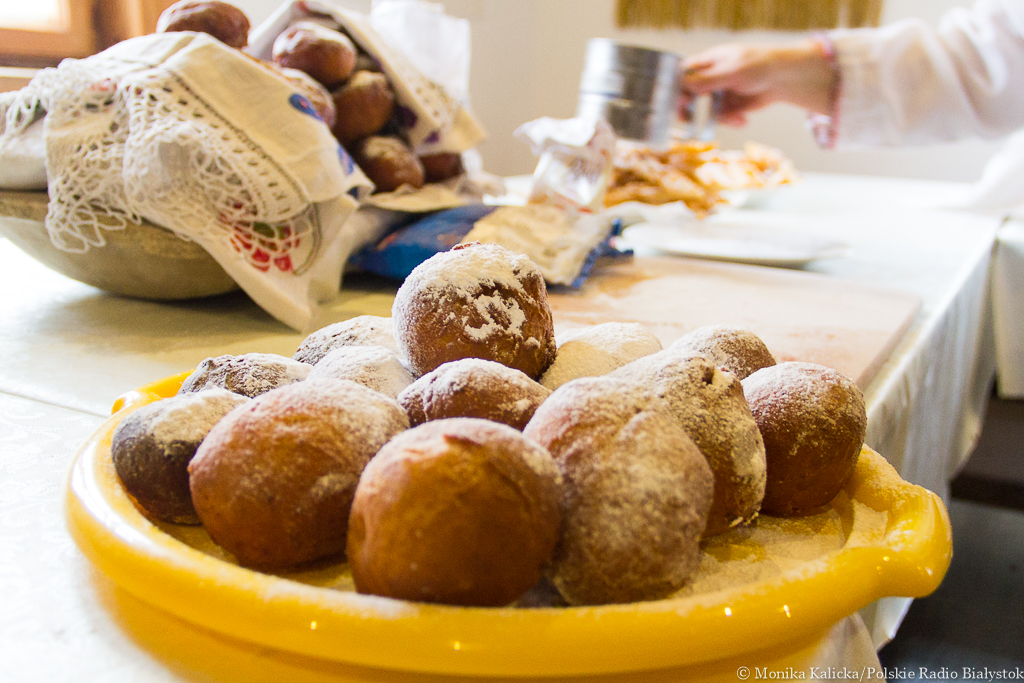 Podczas festynu można też było spróbować przygotowywanych na miejscu faworków i pączków, którymi "objadano się" od tłustego czwartku. Kiedyś pączków nie nadziewano dżemem, a np. boczkiem albo posypywano skwarkami i tak jedzono. Na wsiach - jak pisze Gaweł w swojej książce "Rok obrzędowy na Podlasiu" - popularne były też smażone na wieprzowym tłuszczu placki z mąki pytlowej z drożdżami, zwane pampuchami oraz oładki, czyli placki ziemniaczane, które posypywano mąką pszenną.