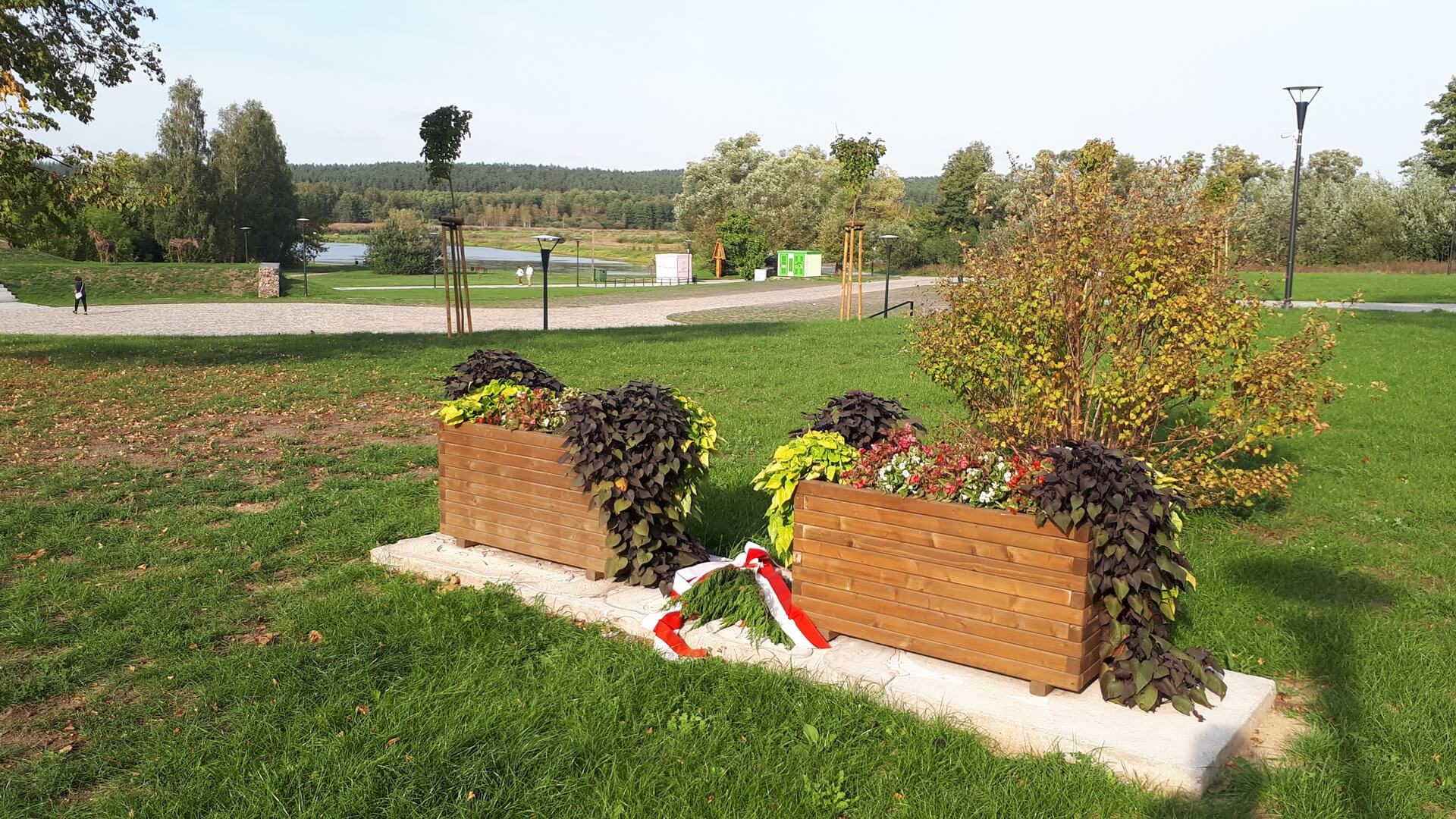 W starym miejscu, gdzie wcześniej stał pomnik teraz stoją dwie duże donice z kwiatami.