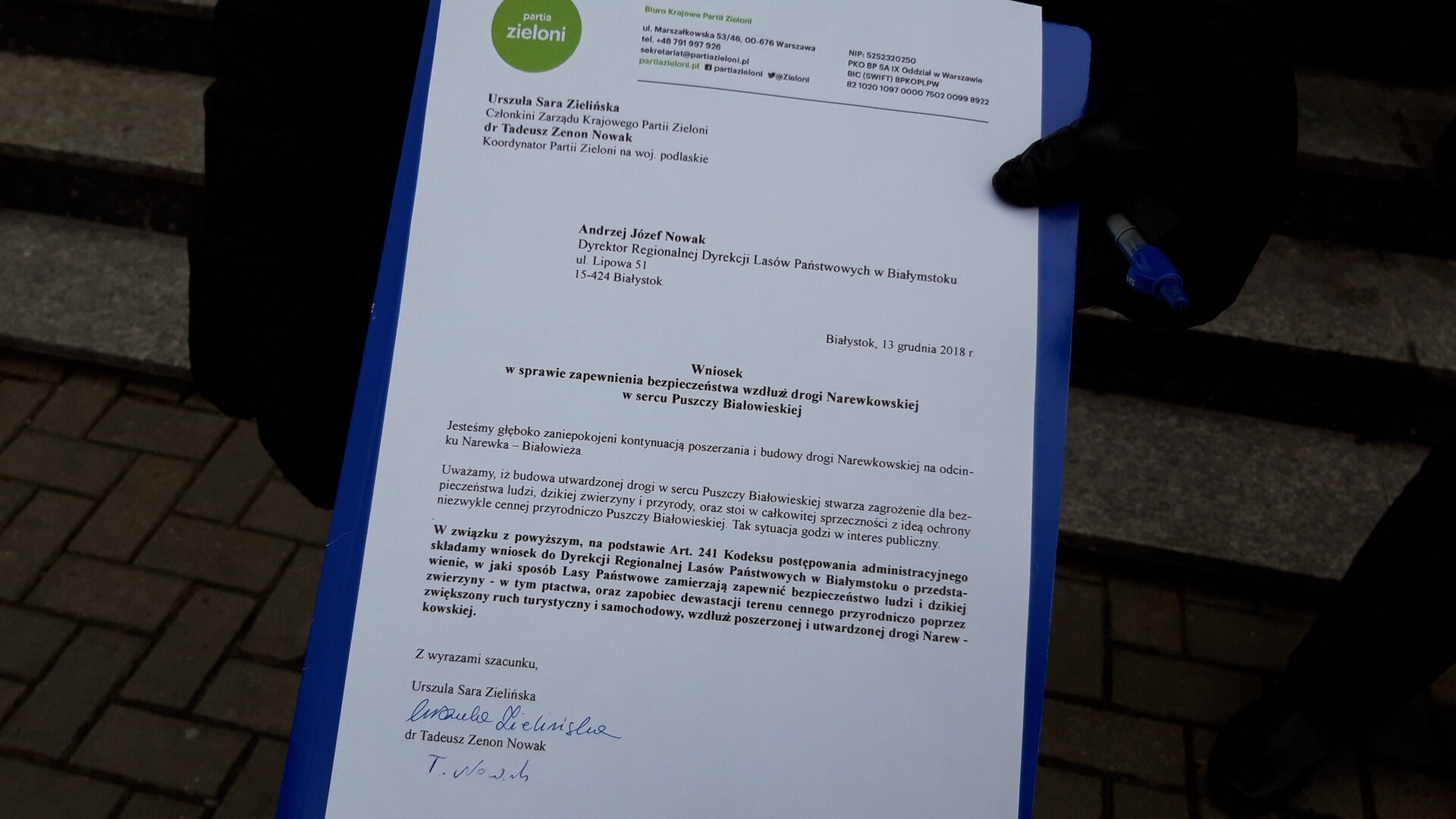 W jaki sposób Lasy Państwowe zapewnią bezpieczeństwo na tzw. drodze narewkowskiej w Puszczy Białowieskiej? Wniosek z takim pytaniem złożyli w czwartek (13.12) w Regionalnej Dyrekcji Lasów Państwowych w Białymstoku przedstawiciele partii Zieloni.