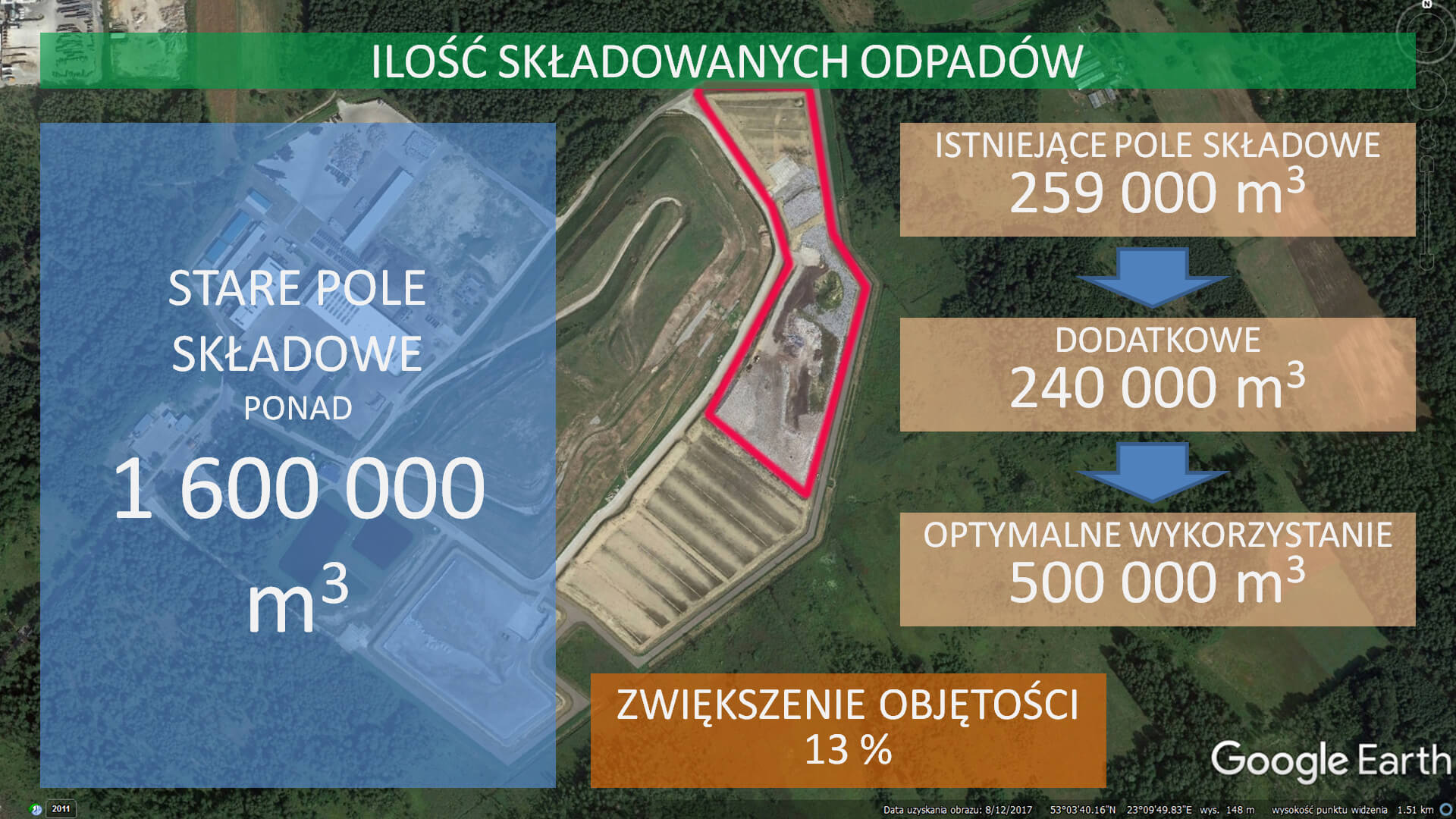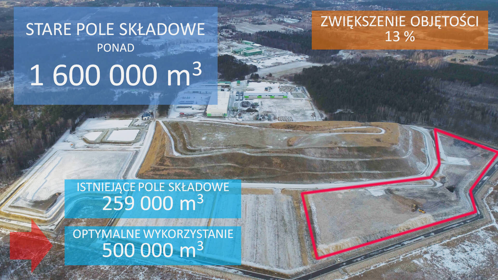 Jak poinformował na specjalnie zwołanej konferencji prasowej rzecznik  spółki zarządzającej ZUOK-iem Zbigniew Gołębiewski – zgodnie z  wnioskiem samo składowisko nie będzie się rozrastać, tylko miałaby się  zwiększyć ilość gromadzonych tam śmieci. Obecnie maksymalny limit to 260  tys. metrów sześciennych odpadów. Władze spółki chciałby, by było to  500 tys. metrów sześciennych.