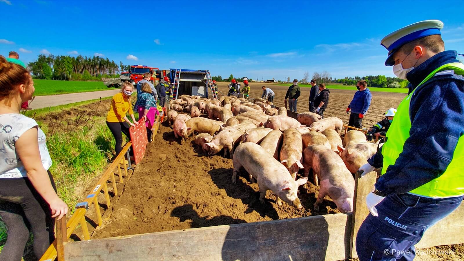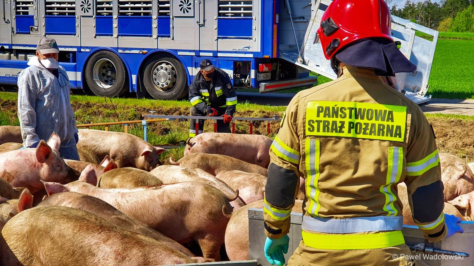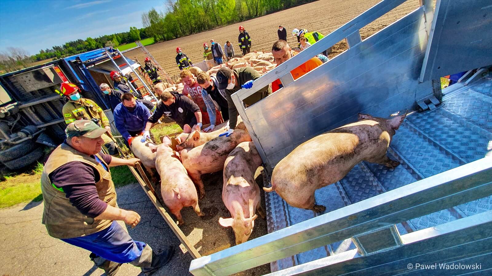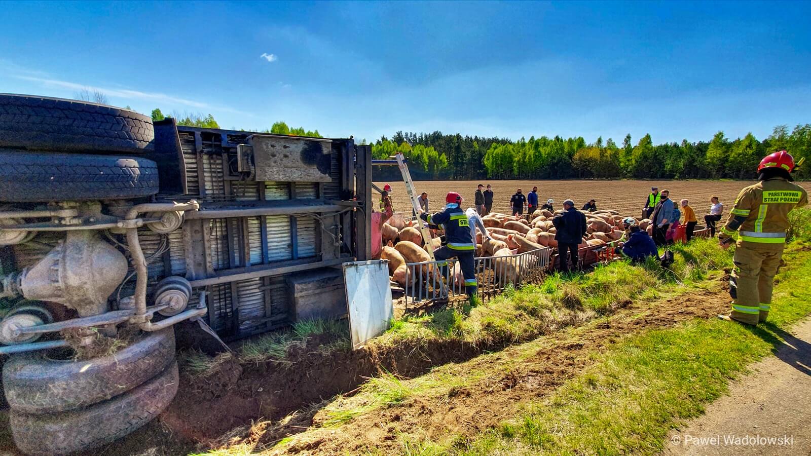 Nietypowa interwencja łomżyńskich strażaków. Koło miejscowości Łubki-Kurki, niedaleko Miastkowa przewrócił się samochód ciężarowy, który przewoził kilkadziesiąt świń.