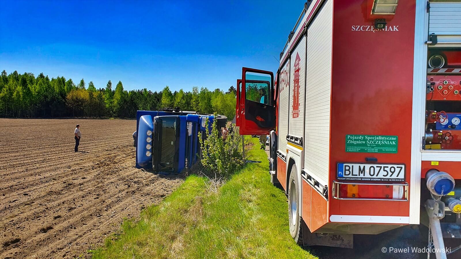Samochód zjechał z drogi na pole i przewrócił się na bok. Przewoził około 85 sztuk trzody chlewnej - mówi kapitan Jacek Zakrzewski z Komendy Miejskiej Państwowej Straży Pożarnej w Łomży