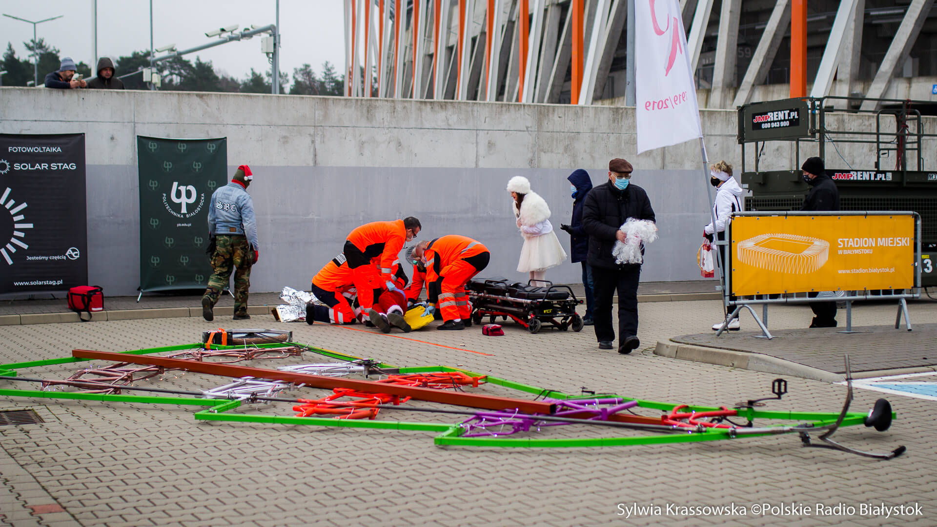 Zaraz po ruszeniu rower się przewrócił, a Adam Zdanowicz spadł na ziemię, mimo że był przyczepiony do lin asekuracyjnych. Na miejscu byli ratownicy medyczni, którzy założyli poszkodowanemu kołnierz ortopedyczny, wezwali inną załogę pogotowia, która odwiozła mężczyznę do szpitala. Na miejsce przyjechała również policja.