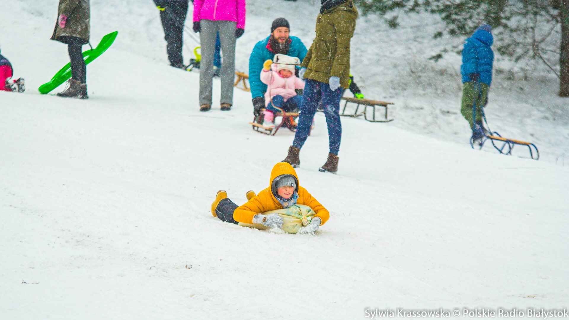 Na sanki wybrały się przede wszystkim rodziny z dziećmi. Niektórzy sami przygotowali podkładki do zjeżdżania.