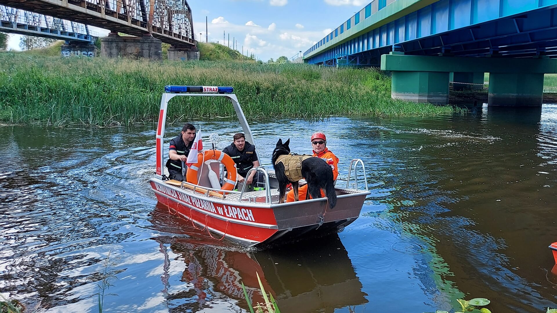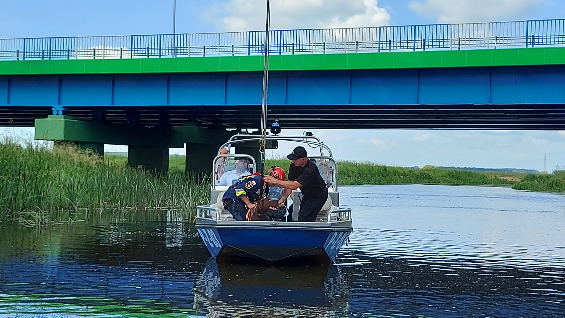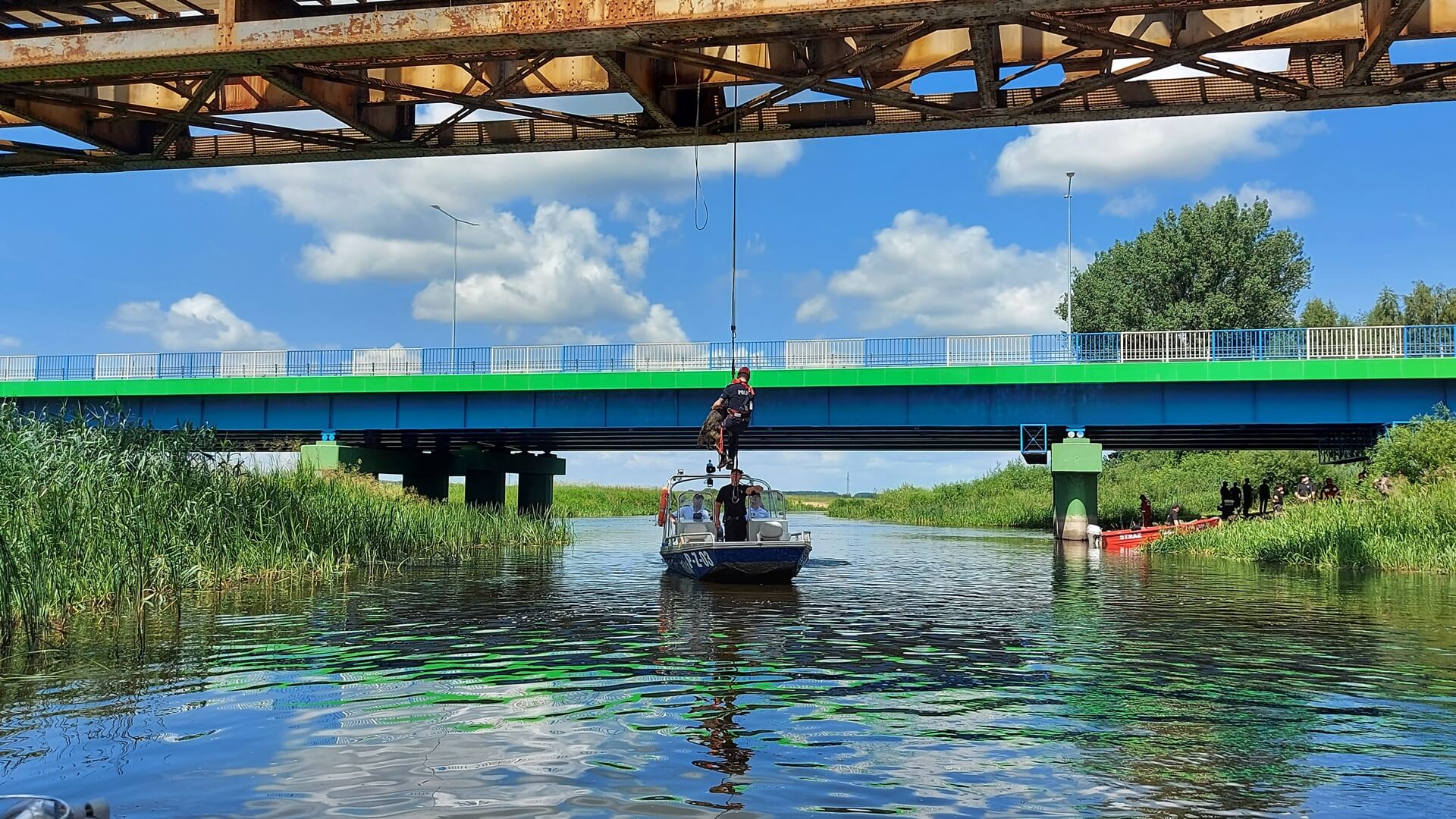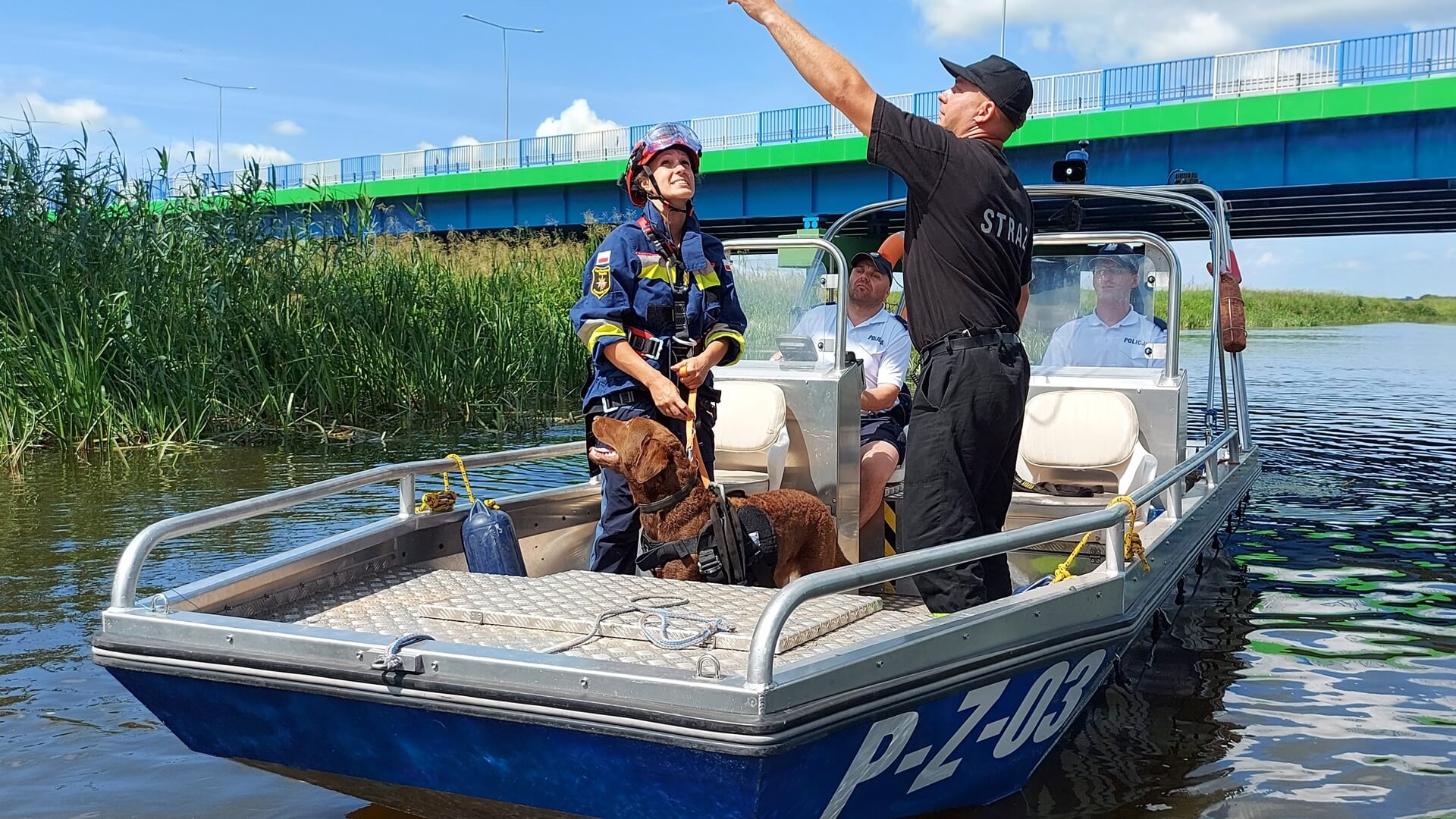 Mundurowi ze swoimi psami pokonywali niecodzienne przeszkody na lądzie, w wodzie i powietrzu. Z pokładu policyjnej łódki byli podciągani na linie zawieszonej na kolejowym moście, a w rejonie mostu drogowego ćwiczyli umiejętności obronne swoich psów.