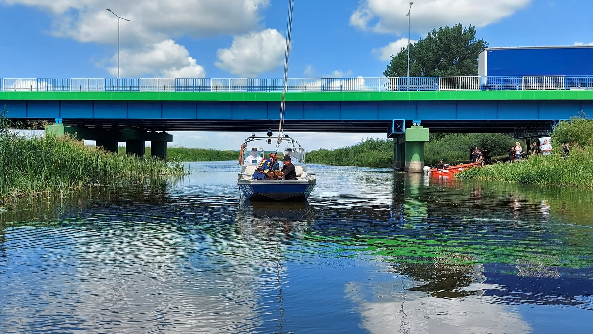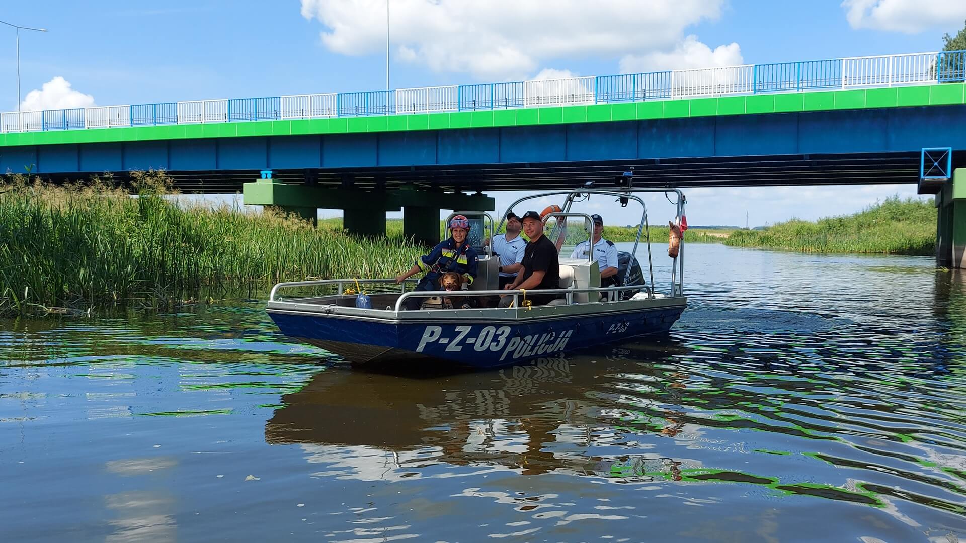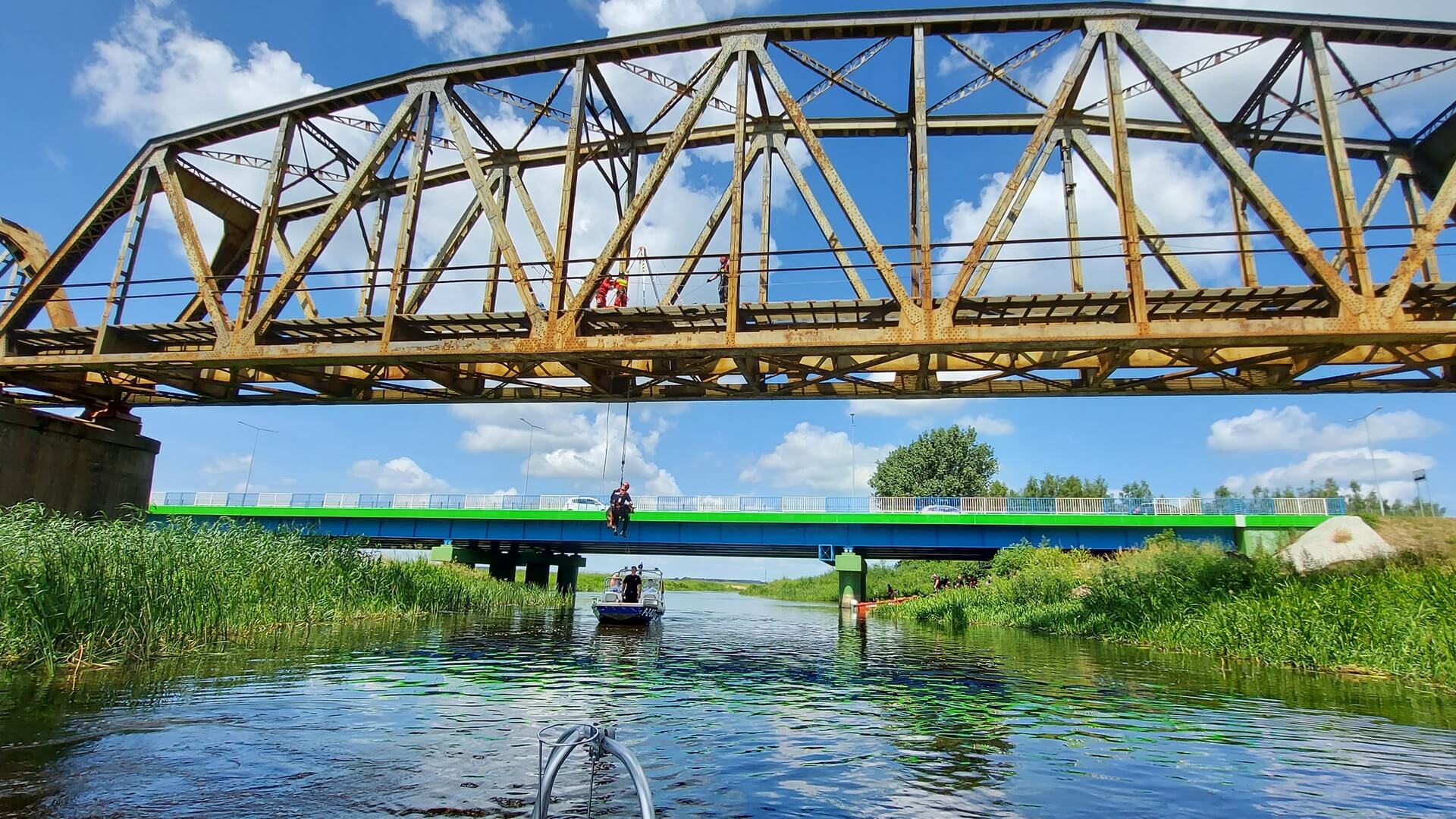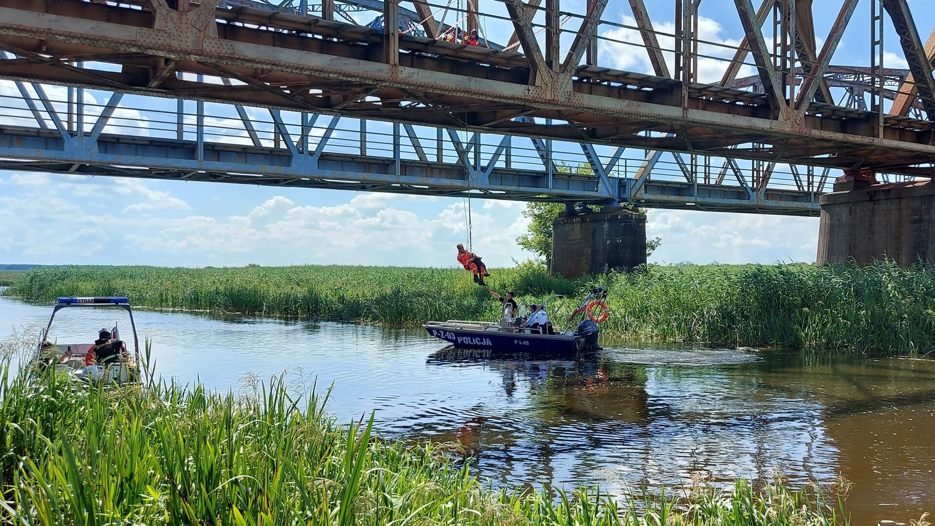 Mundurowi ze swoimi psami pokonywali niecodzienne przeszkody na lądzie, w wodzie i powietrzu. Z pokładu policyjnej łódki byli podciągani na linie zawieszonej na kolejowym moście, a w rejonie mostu drogowego ćwiczyli umiejętności obronne swoich psów.