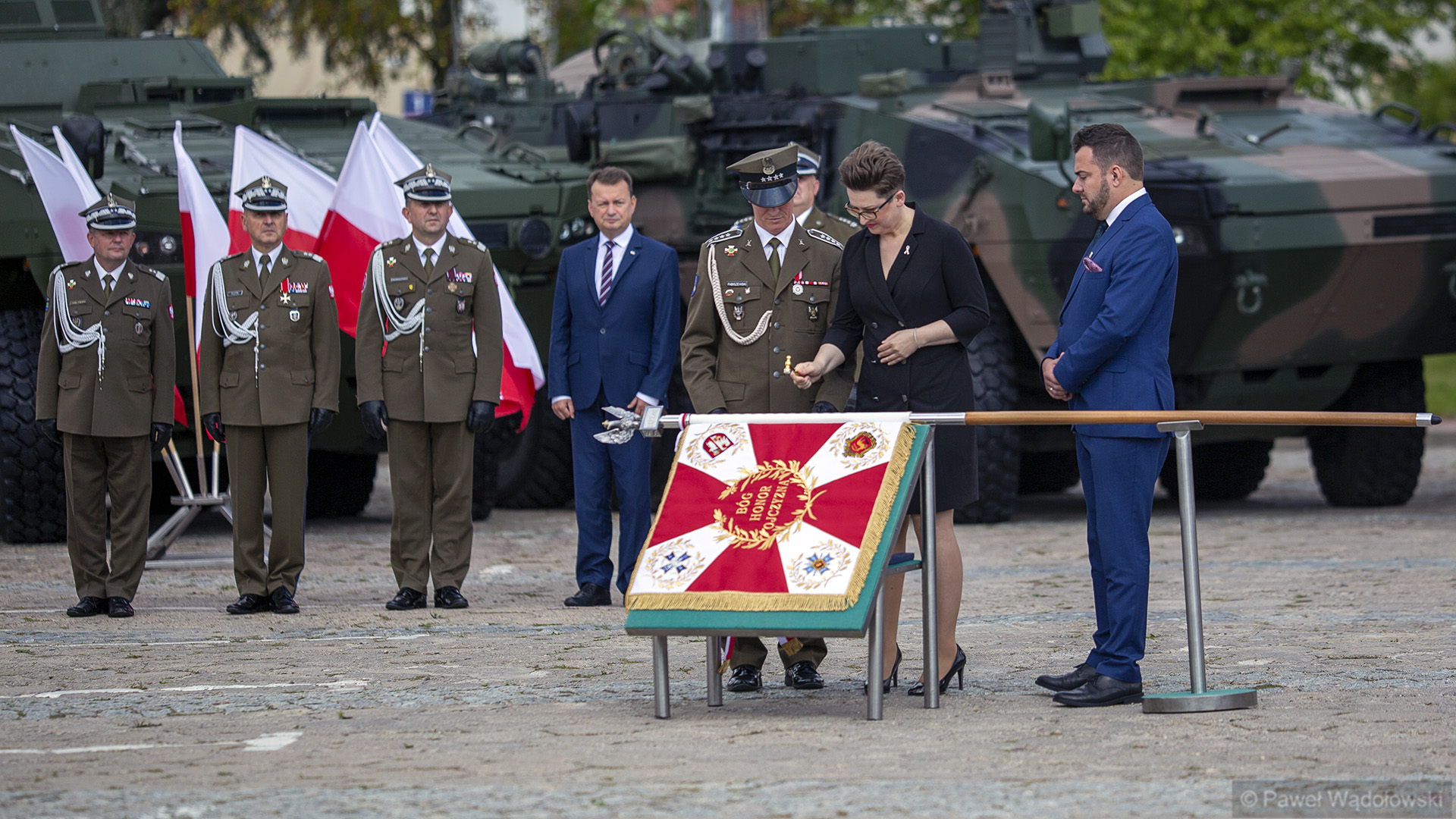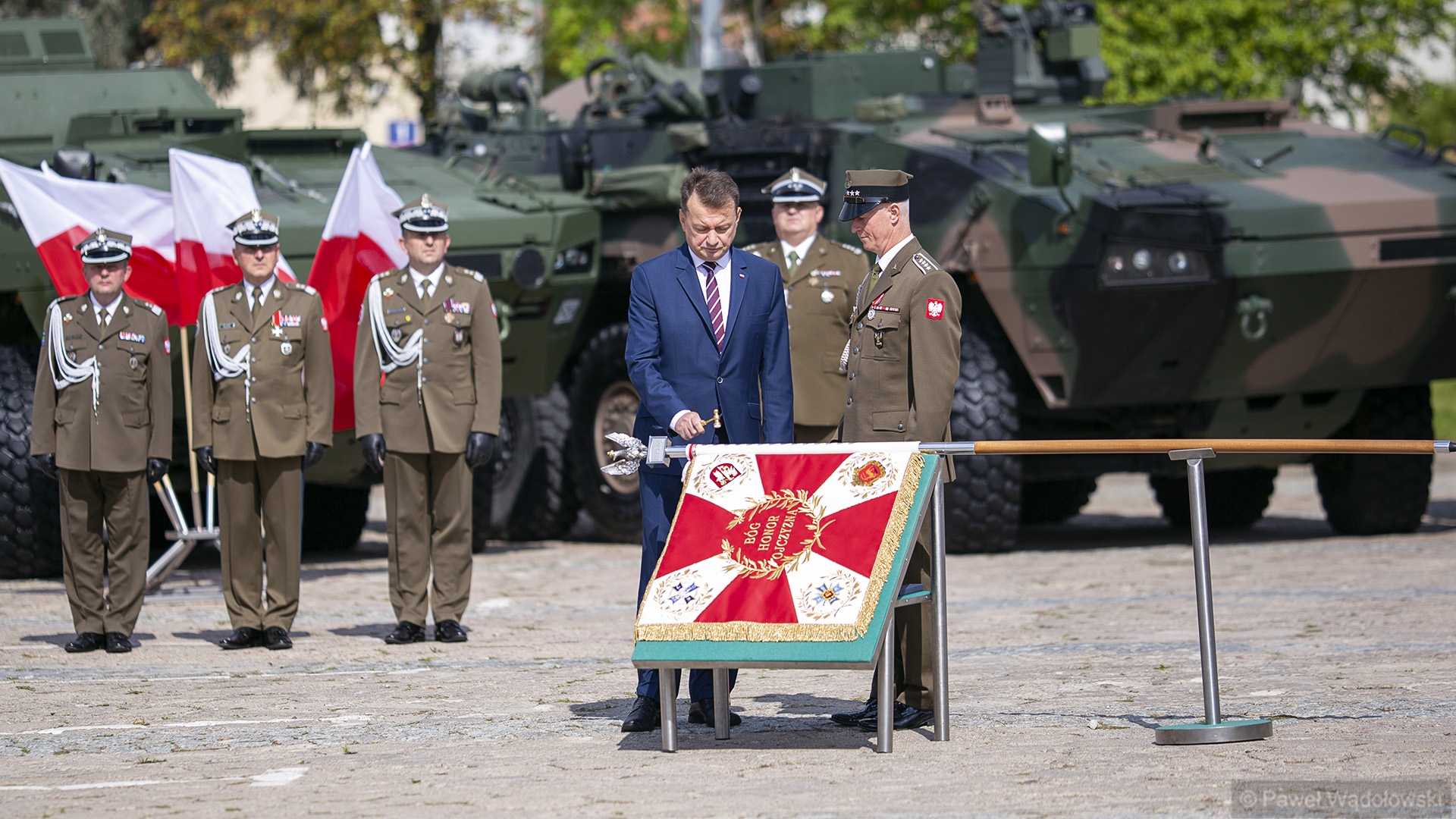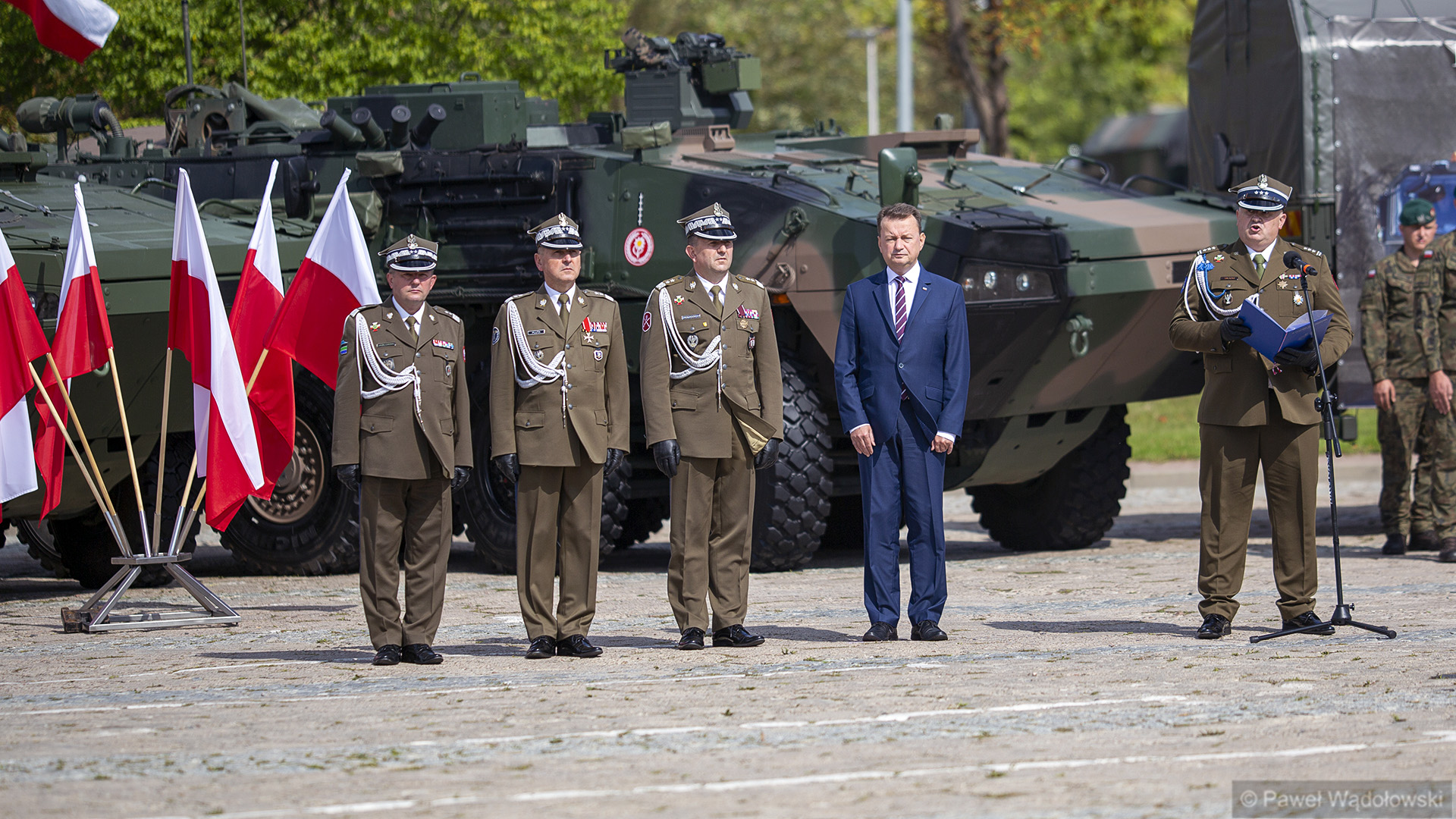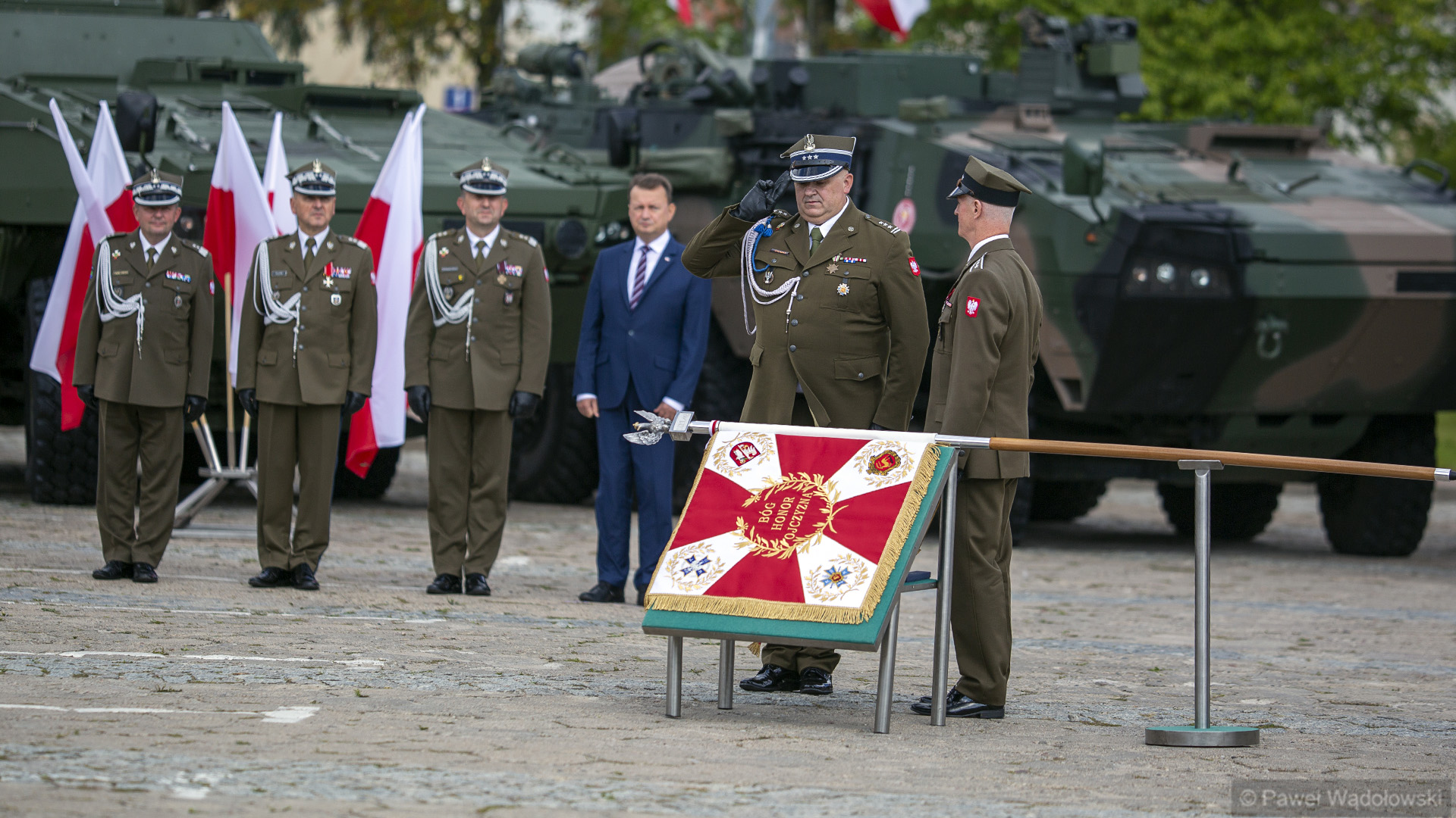 Szef MON podziękował obecnym - inspektorowi wojsk lądowych, zastępcy szefa Sztabu Generalnego, dowódcy 18. pułku. "Ten efekt nie byłby możliwy do osiągnięcia, gdyby nie panów zaangażowanie" - powiedział. W uroczystości wzięli udział generałowie dywizji Dariusz Pluta (reprezentujący Sztab Generalny WP), Maciej Jabłoński w imieniu dowództwa generalnego sił zbrojnych i dowódca 18. Brygady Zmechanizowanej Jarosław Gromadziński.