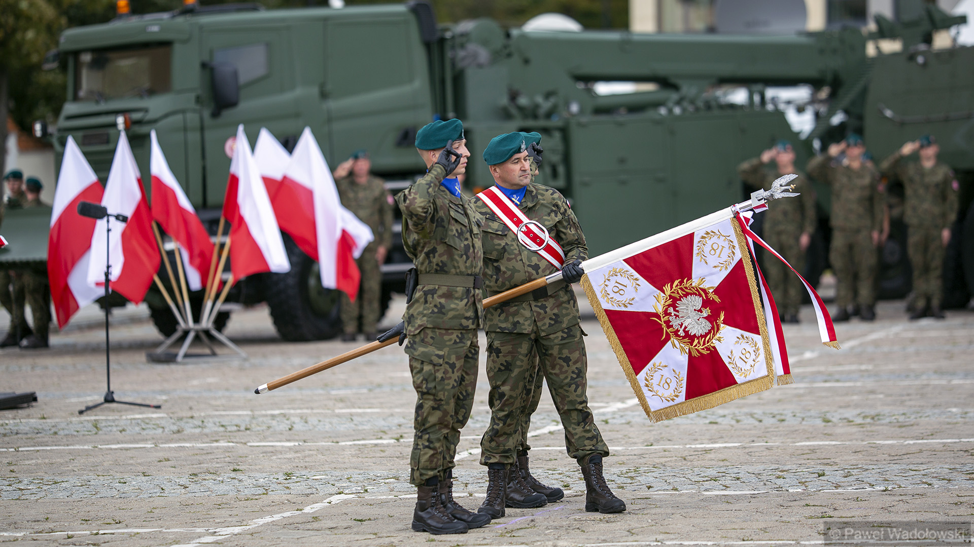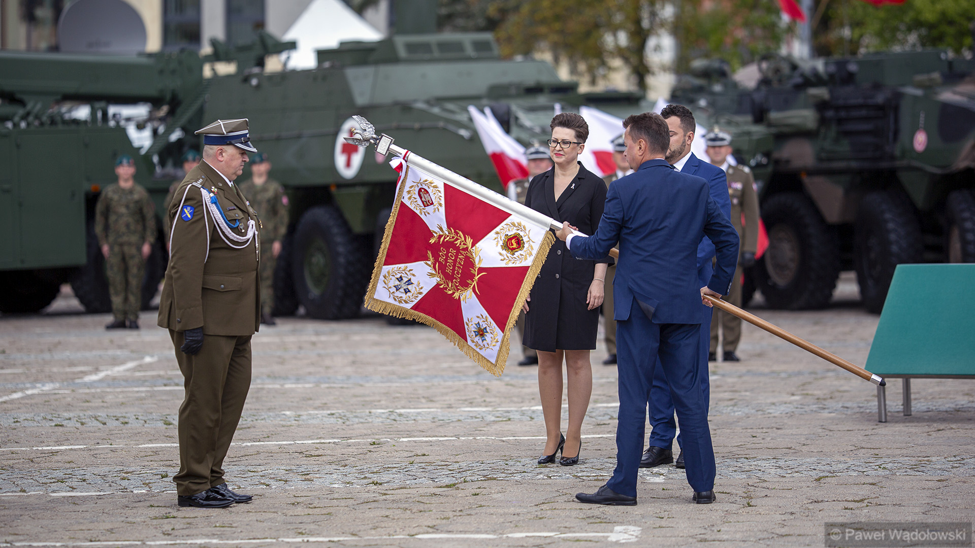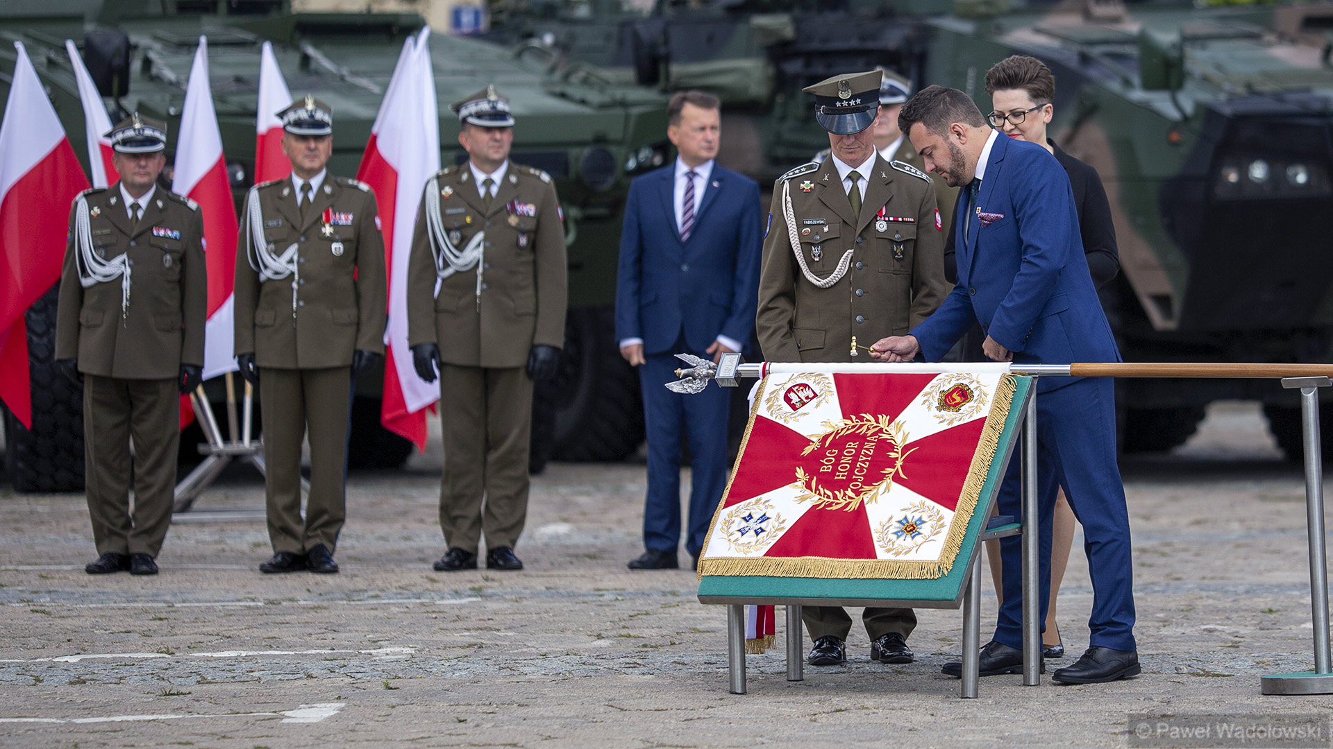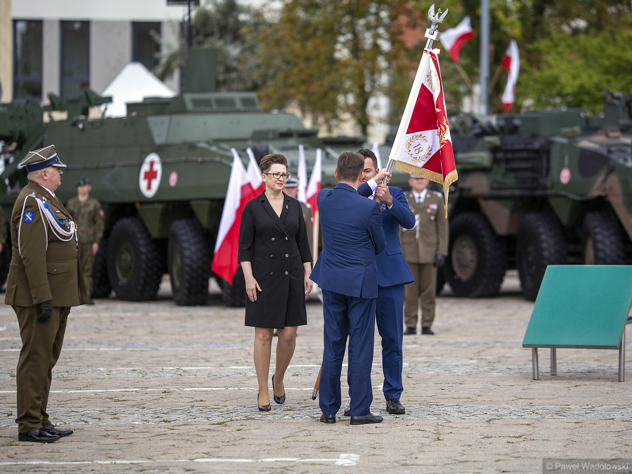 Szef MON podziękował obecnym - inspektorowi wojsk lądowych, zastępcy szefa Sztabu Generalnego, dowódcy 18. pułku. "Ten efekt nie byłby możliwy do osiągnięcia, gdyby nie panów zaangażowanie" - powiedział. W uroczystości wzięli udział generałowie dywizji Dariusz Pluta (reprezentujący Sztab Generalny WP), Maciej Jabłoński w imieniu dowództwa generalnego sił zbrojnych i dowódca 18. Brygady Zmechanizowanej Jarosław Gromadziński.