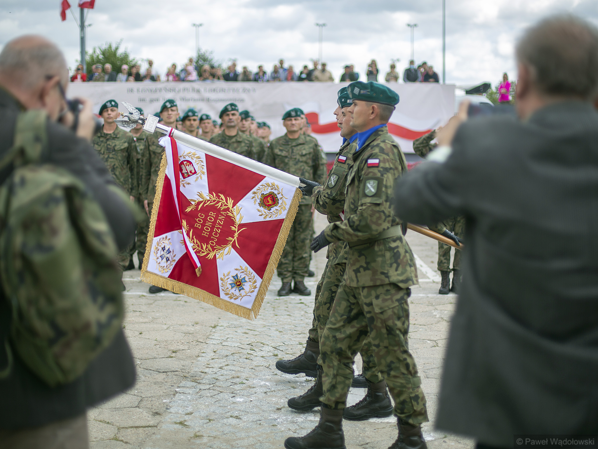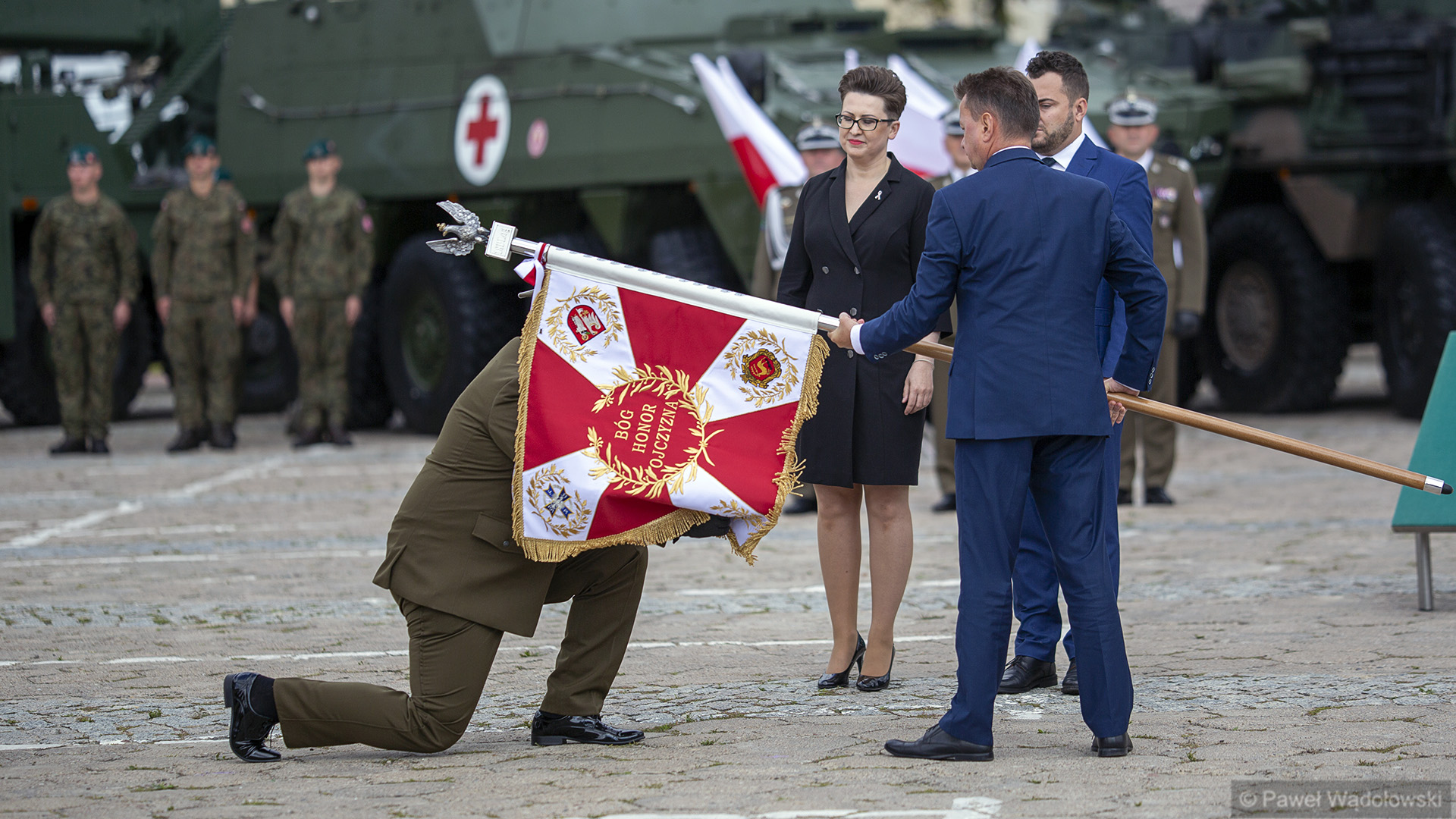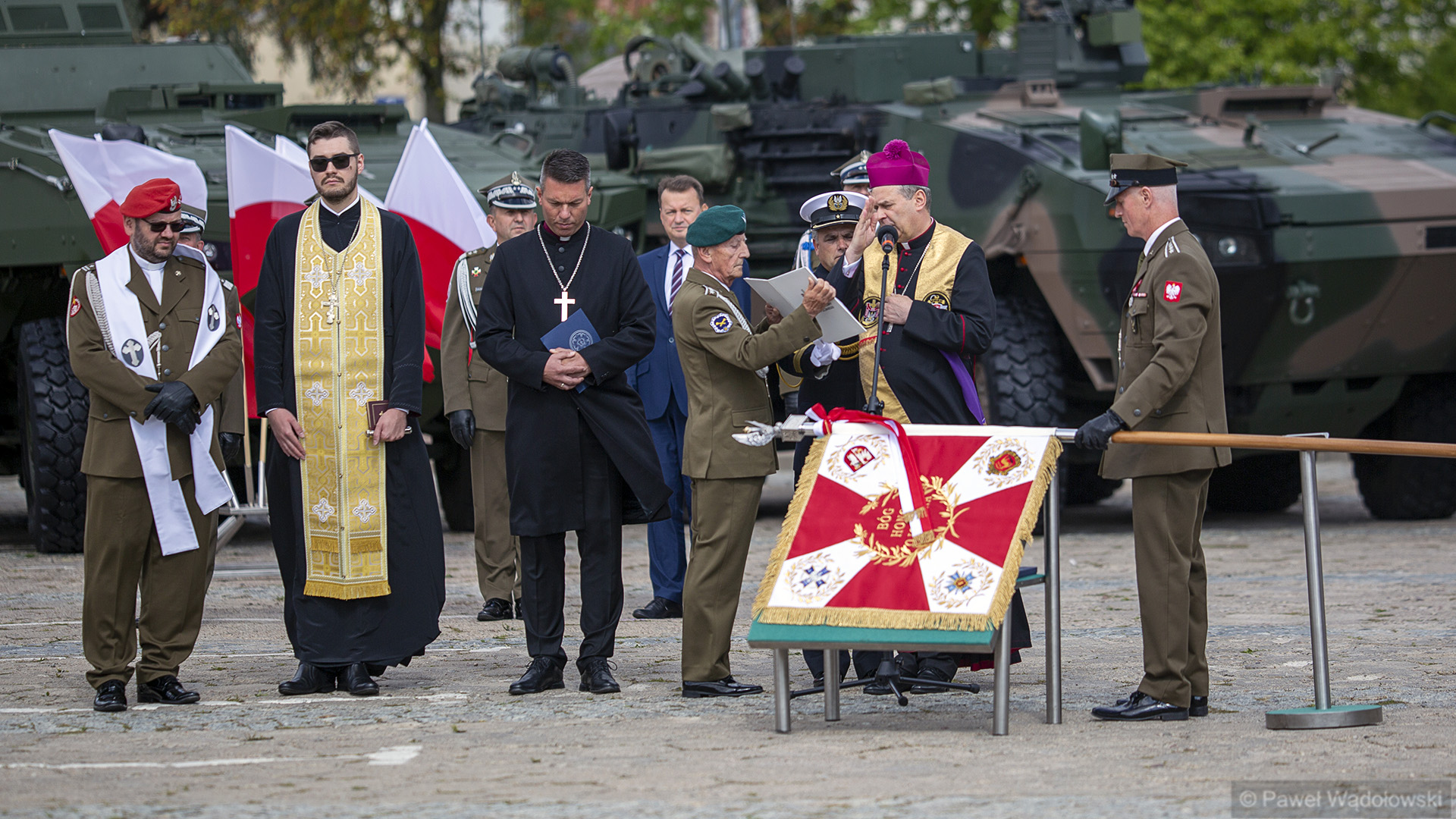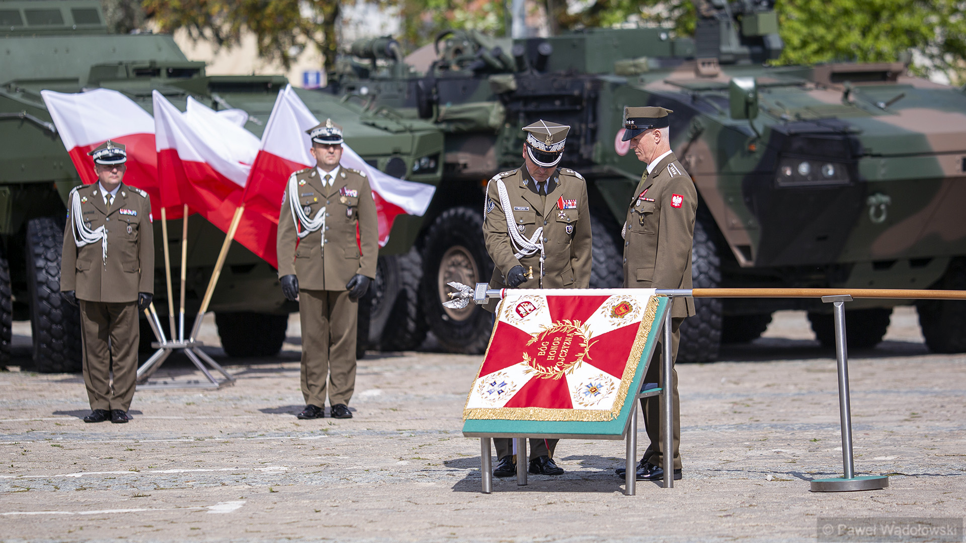 Szef MON podziękował obecnym - inspektorowi wojsk lądowych, zastępcy szefa Sztabu Generalnego, dowódcy 18. pułku. "Ten efekt nie byłby możliwy do osiągnięcia, gdyby nie panów zaangażowanie" - powiedział. W uroczystości wzięli udział generałowie dywizji Dariusz Pluta (reprezentujący Sztab Generalny WP), Maciej Jabłoński w imieniu dowództwa generalnego sił zbrojnych i dowódca 18. Brygady Zmechanizowanej Jarosław Gromadziński.