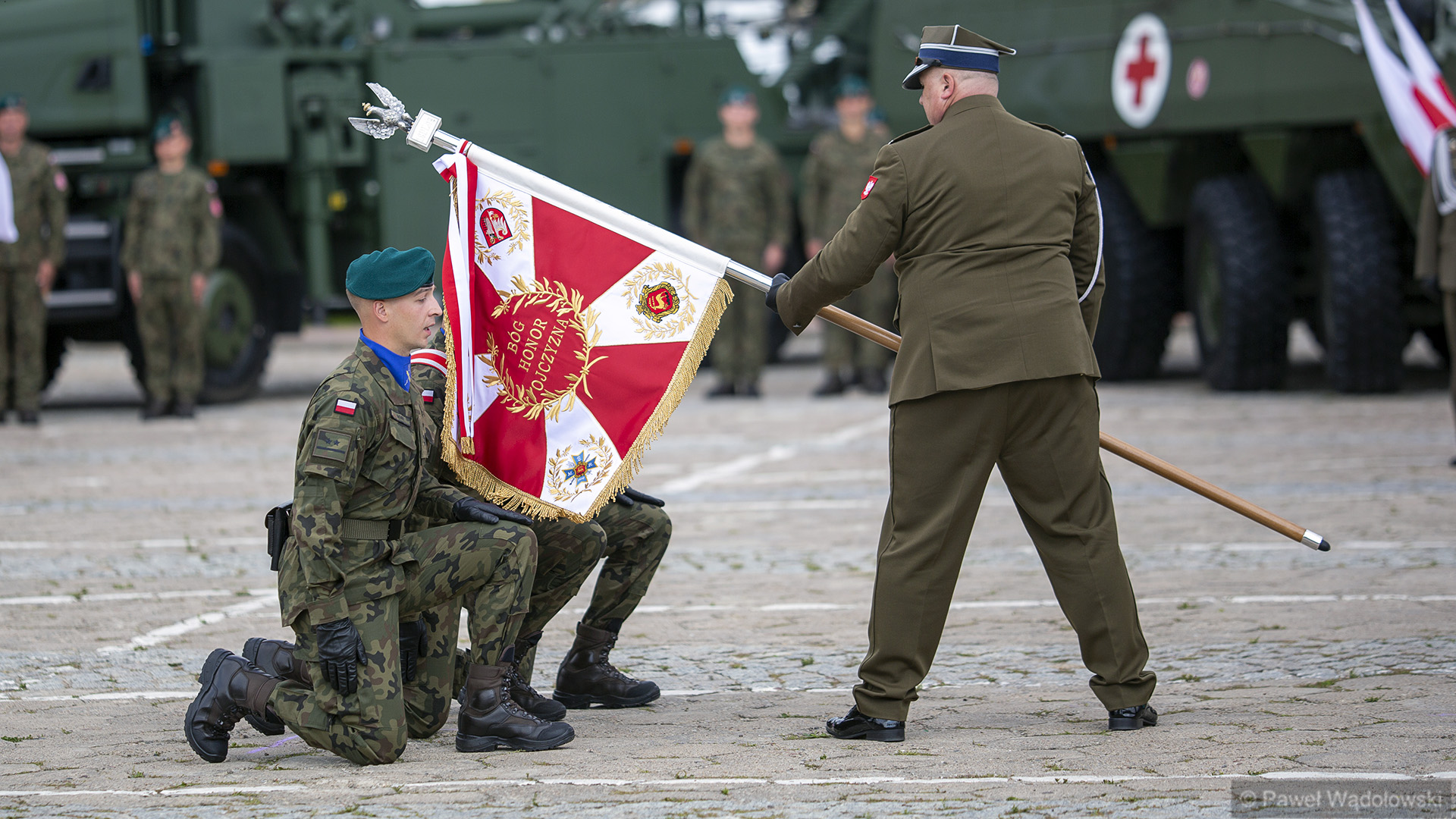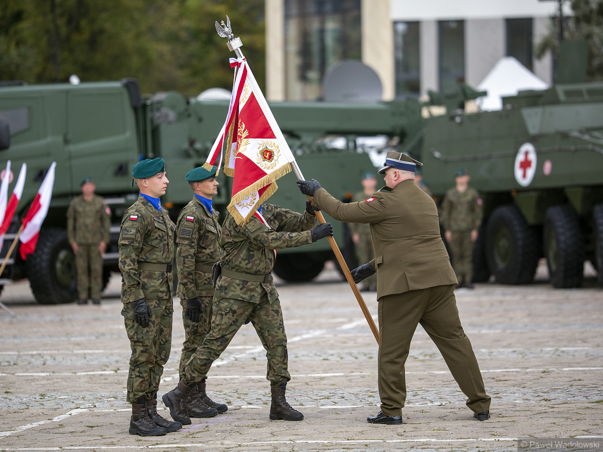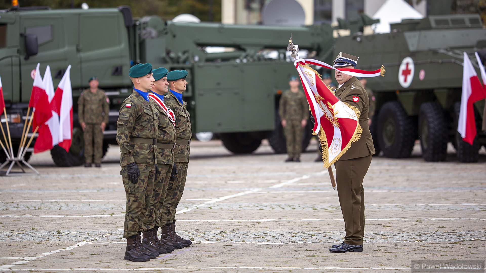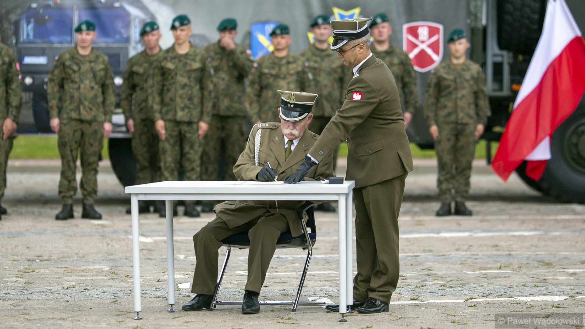 Szef MON podziękował obecnym - inspektorowi wojsk lądowych, zastępcy szefa Sztabu Generalnego, dowódcy 18. pułku. "Ten efekt nie byłby możliwy do osiągnięcia, gdyby nie panów zaangażowanie" - powiedział. W uroczystości wzięli udział generałowie dywizji Dariusz Pluta (reprezentujący Sztab Generalny WP), Maciej Jabłoński w imieniu dowództwa generalnego sił zbrojnych i dowódca 18. Brygady Zmechanizowanej Jarosław Gromadziński.