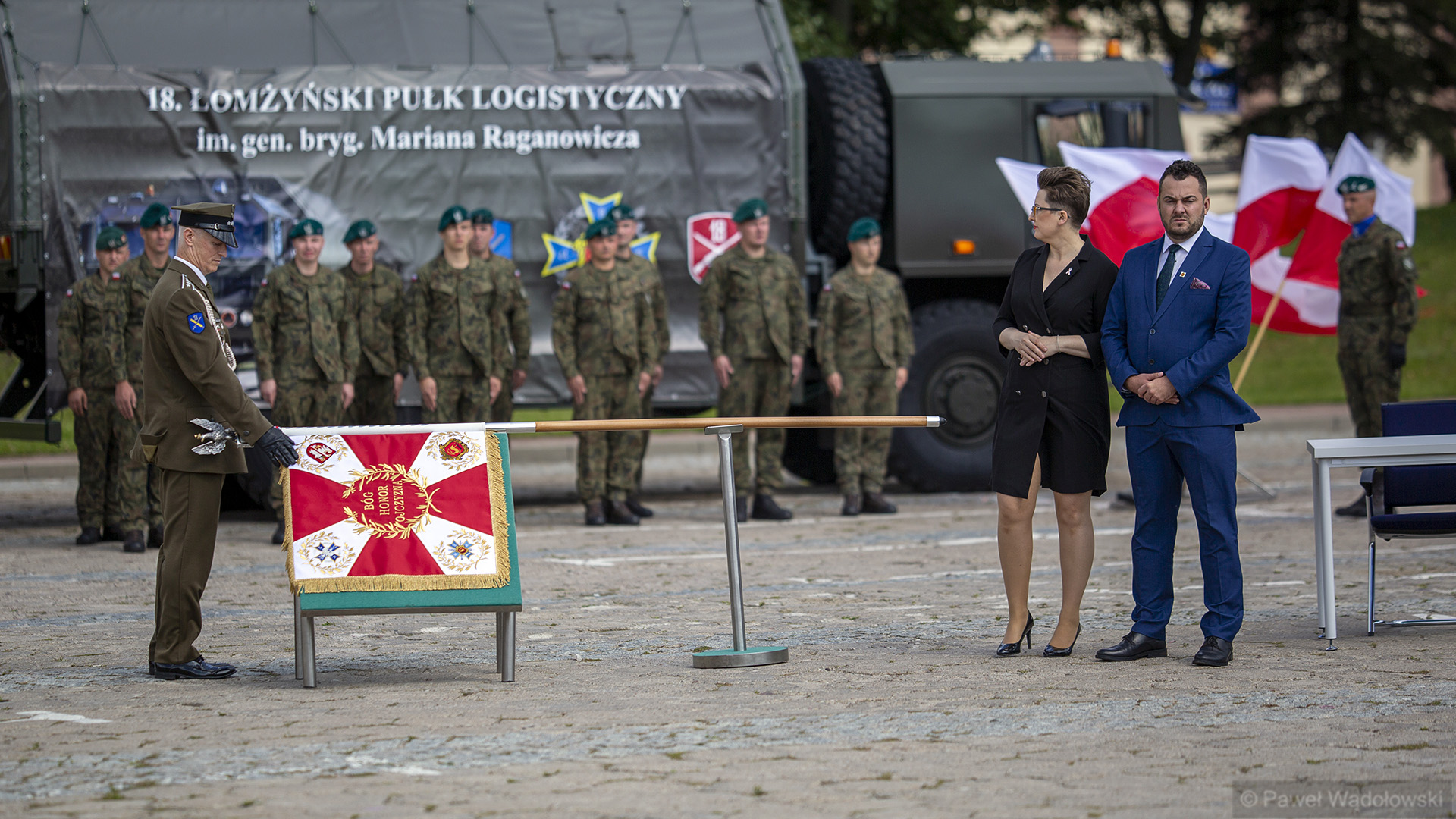 Dowódca 18. Łomżyńskiego Pułku Logistycznego płk Paweł Gałązka dodał, że dla żołnierzy sztandar jest "szczególnie wyjątkowym symbolem. "Uczynimy wszystko, aby być godnymi spadkobiercami historii i tradycji 33. Pułku Piechoty, a sztandar dzisiaj otrzymany będzie zobowiązaniem wobec społeczeństwa, że jeżeli zajdzie taka potrzeba, to krwi własnej ani życia szczędzić nie będziemy dla naszej ukochanej ojczyzny" - mówił Gałązka.