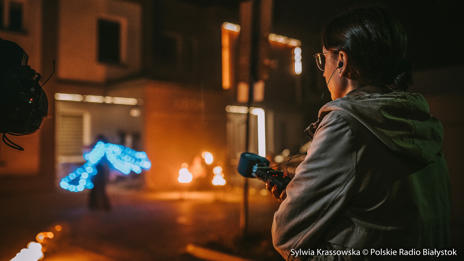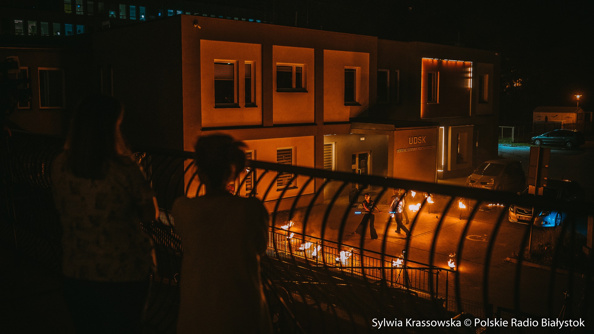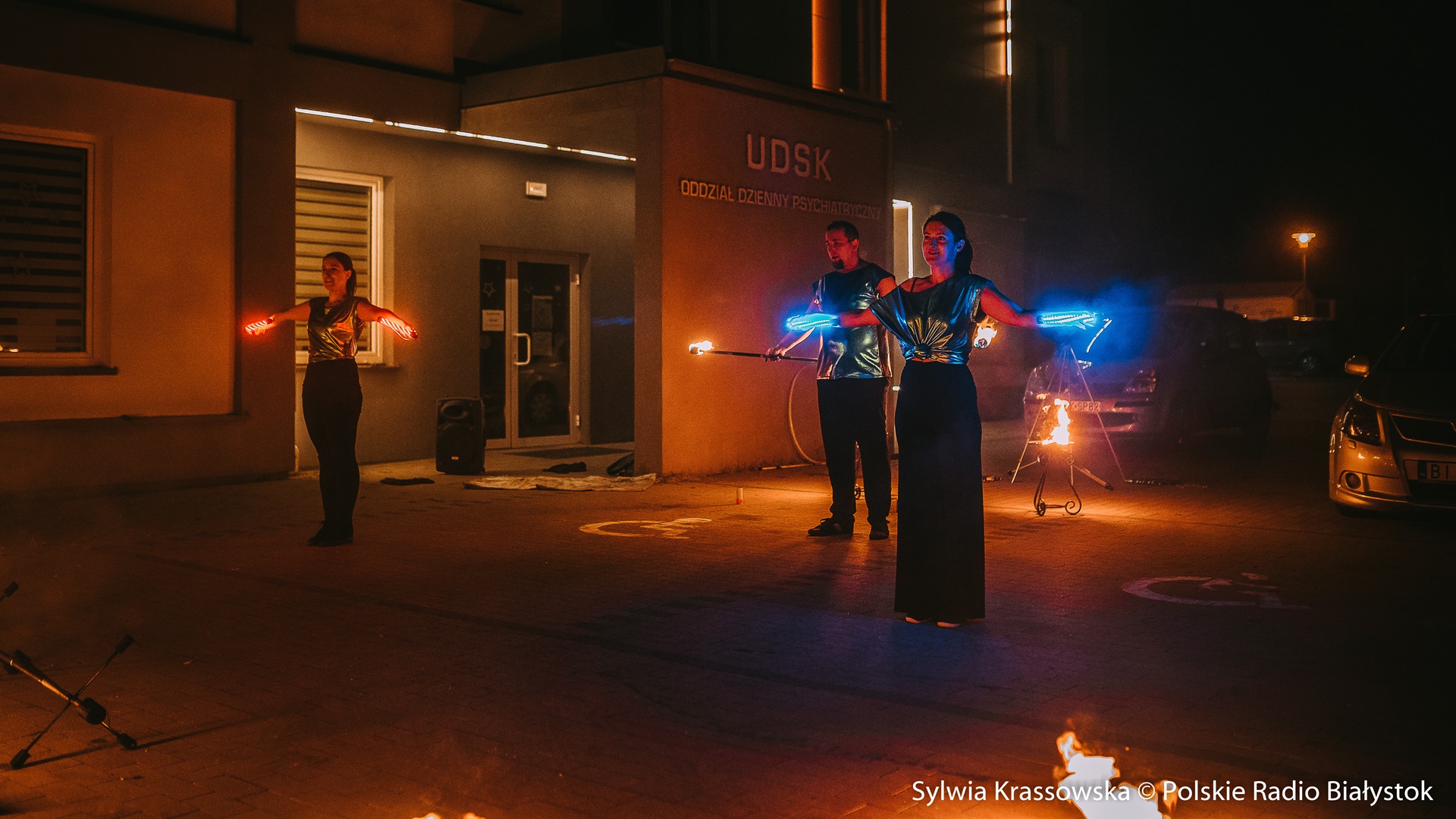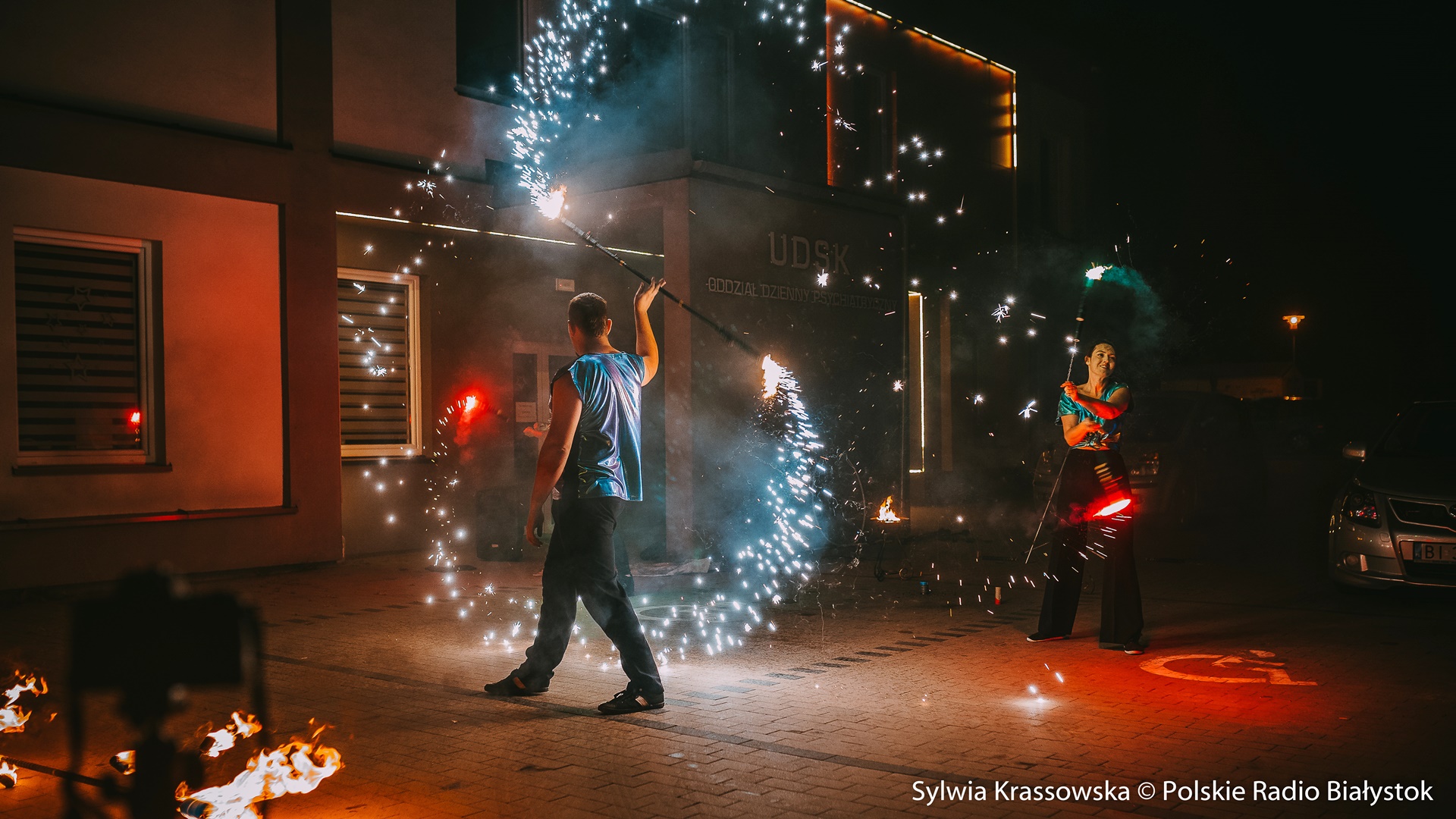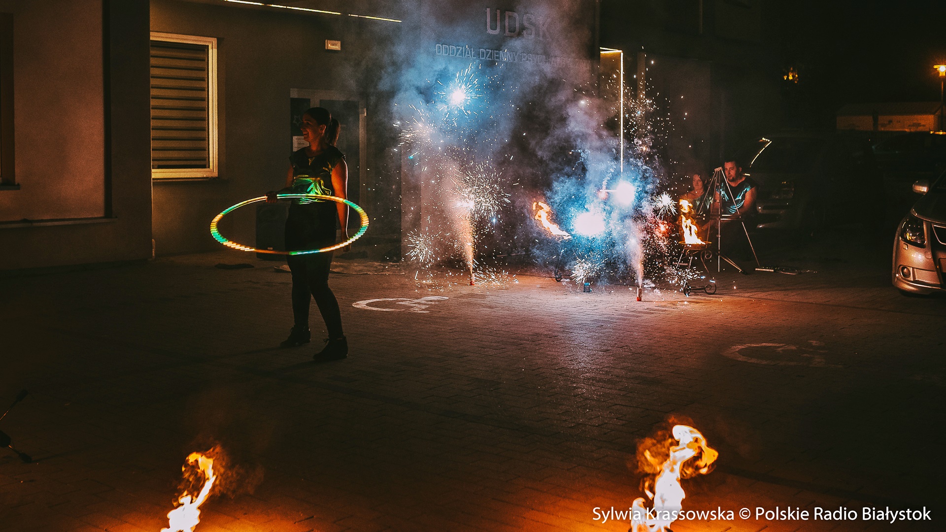 dźwięk do pobraniaWidowiskowy pokaz ognia przed UDSK w Białymstoku - relacja Marceliny Markowskiej | Pobierz plik.