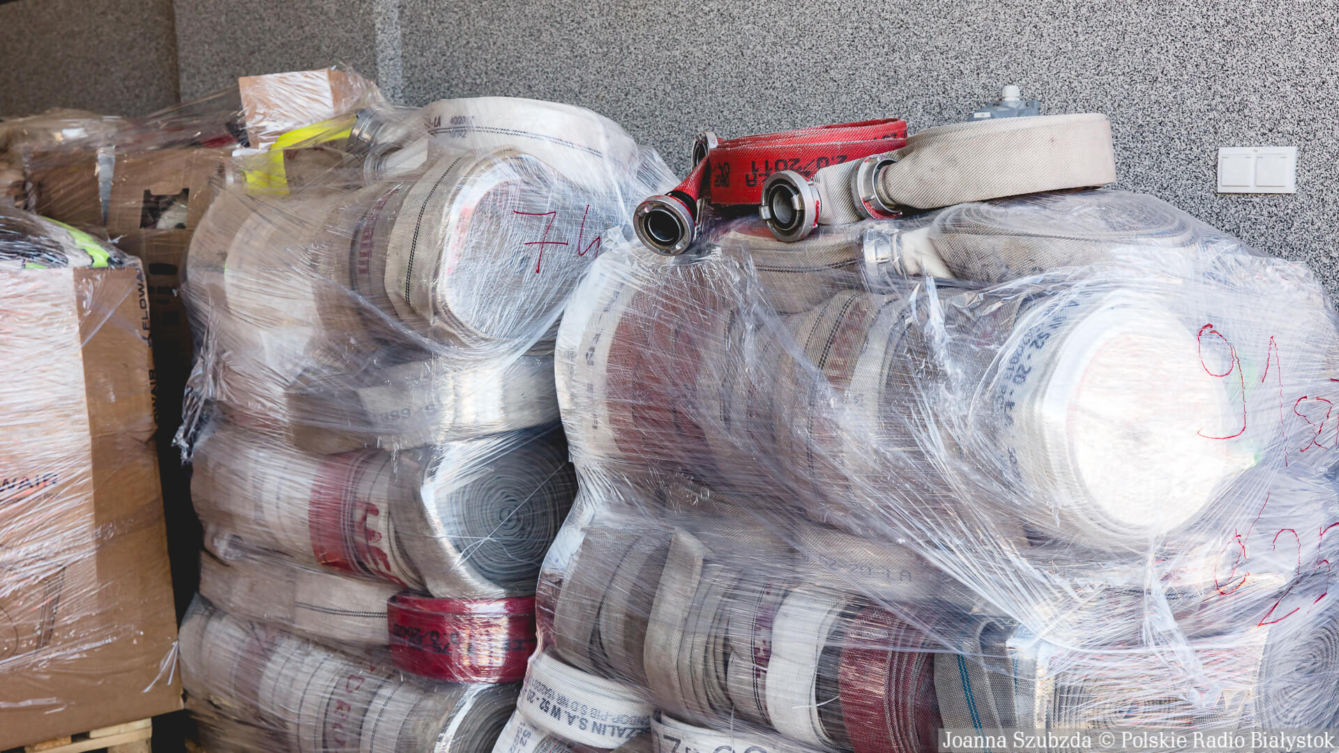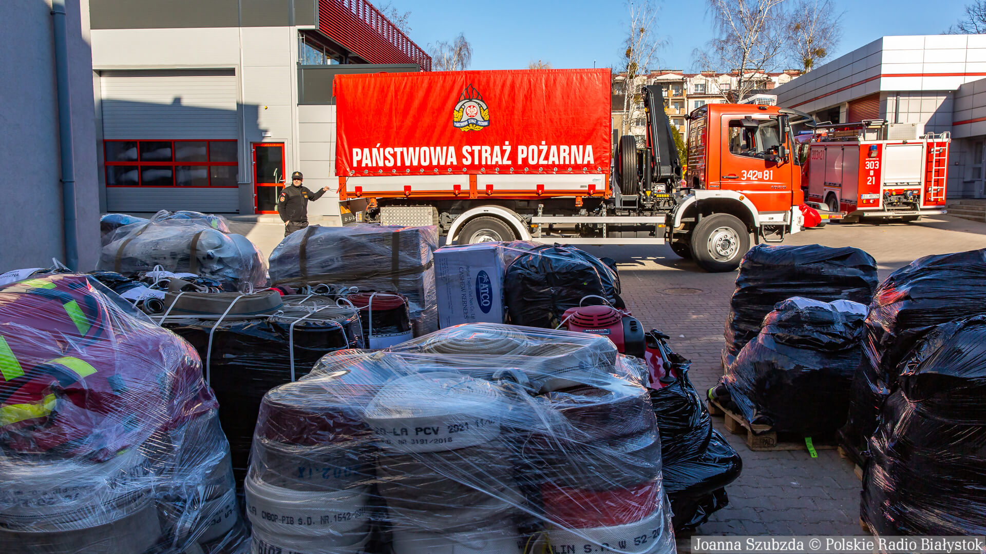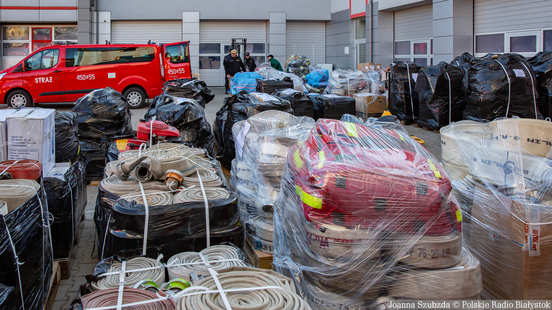 Sprzęt jest oczywiście całkowicie sprawny. Są to m.in. węże, kamery termowizyjne, ubrania specjalne, rękawice, odzież ochronna. To wszystko z całego województwa trafia do Komendy Wojewódzkiej w Białymstoku i będziemy to przewozić do punktu w Zamościu. Stamtąd będzie przewożony do naszych kolegów, strażaków z Ukrainy - mówi mł. bryg. Piotr Chojnowski.