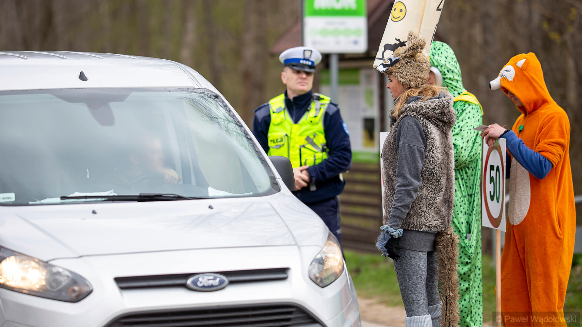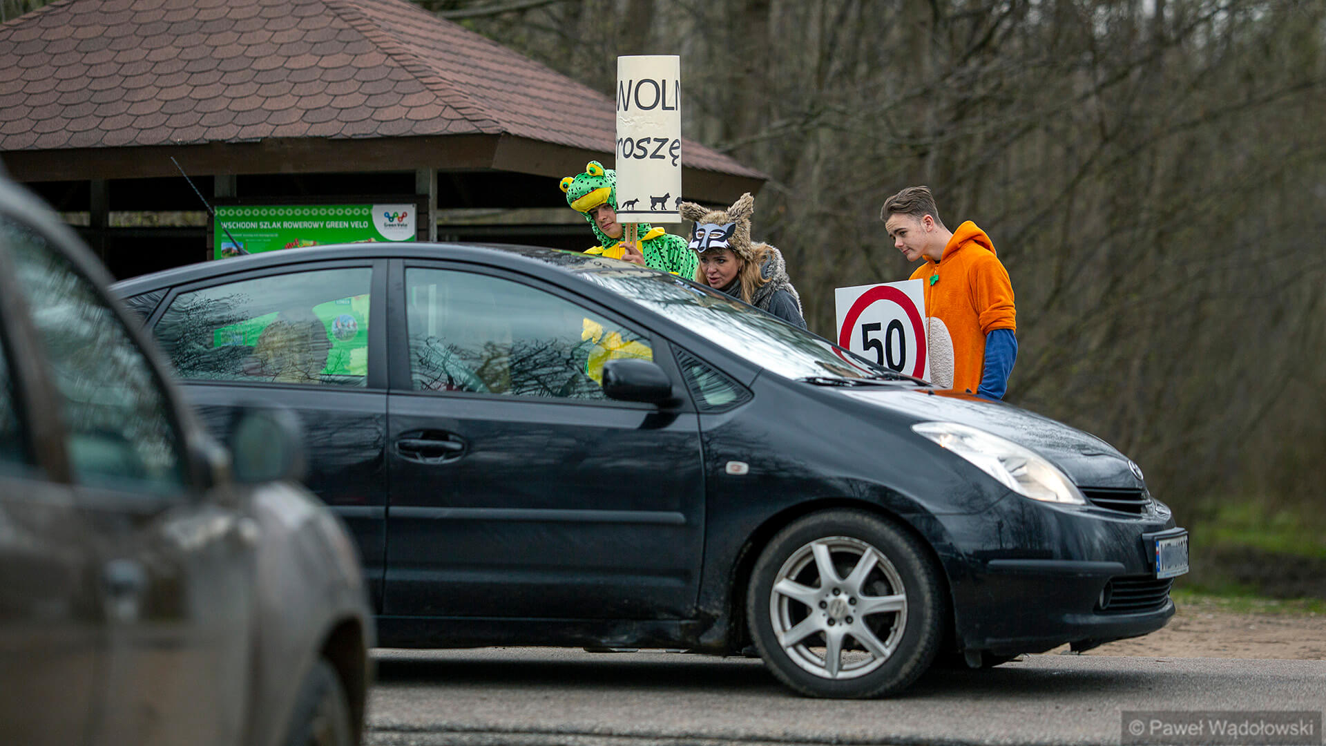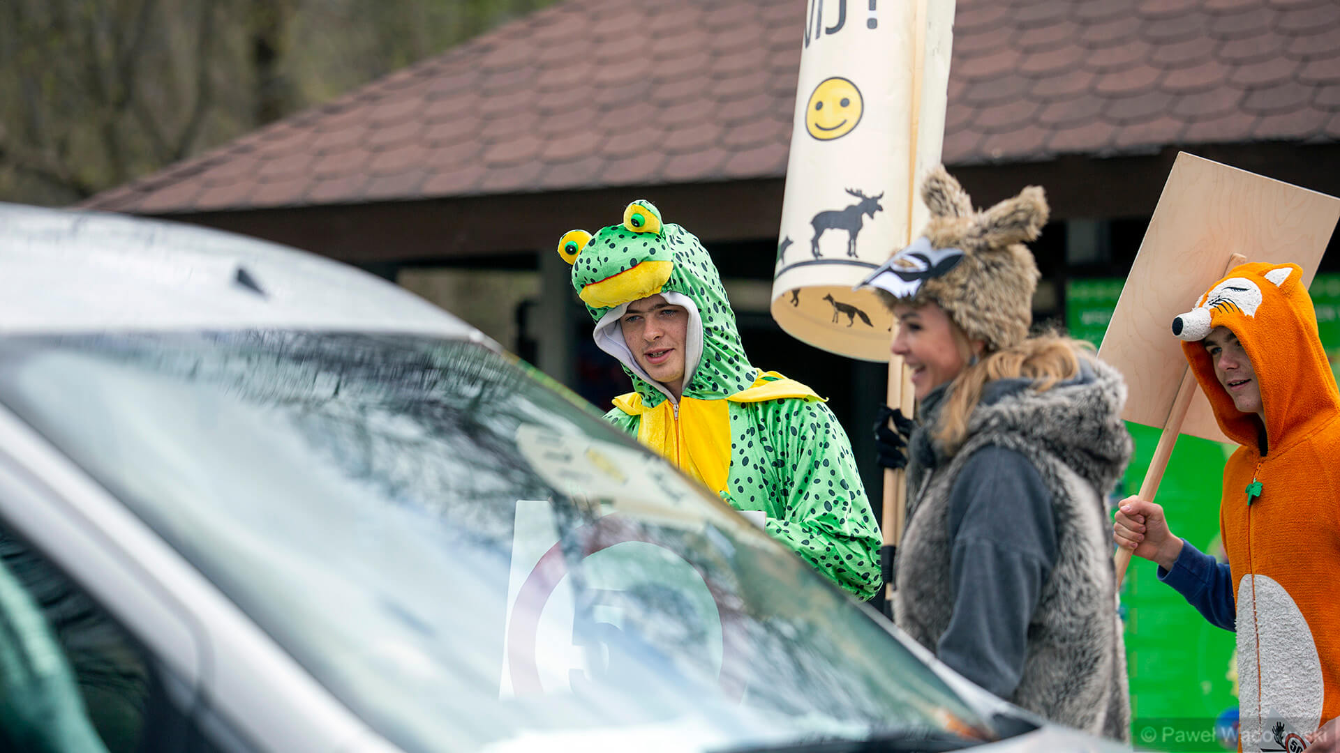 Przebrani w stroje zwierząt członkowie Towarzystwa Biebrzańskiego stoją w najpopularniejszych miejscach Carskiej Drogi i przypominają kierowcom, że na całej trasie obowiązuje ograniczenie prędkości do pięćdziesięciu kilometrów na godzinę.