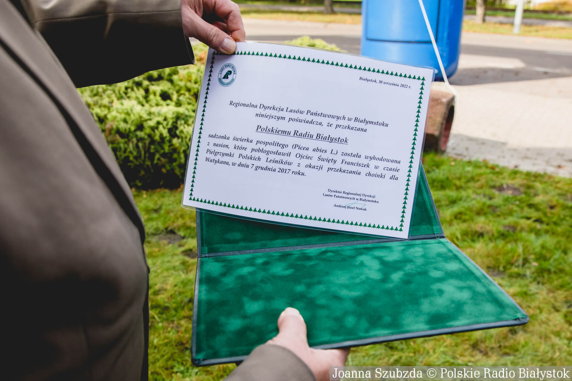 Jesteśmy otoczeni zielenią. Rozgłośnia mieści się przy ul. Świerkowej, więc nie może być innej sadzonki niż świerk. Po drugiej stronie alejki jest również zasadzony świerk - nasiona były pobłogosławione przez papieża Benedykta XVI, więc będzie cała aleja papieska - mówi prezes Polskiego Radia Białystok Mirosław Bielawski.