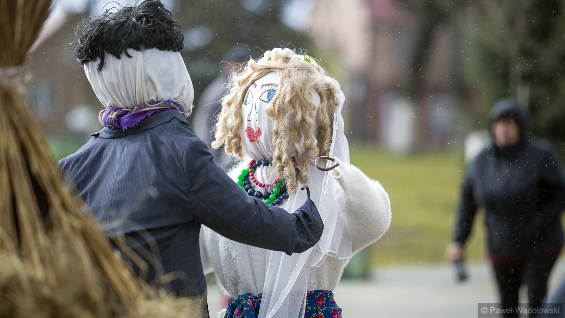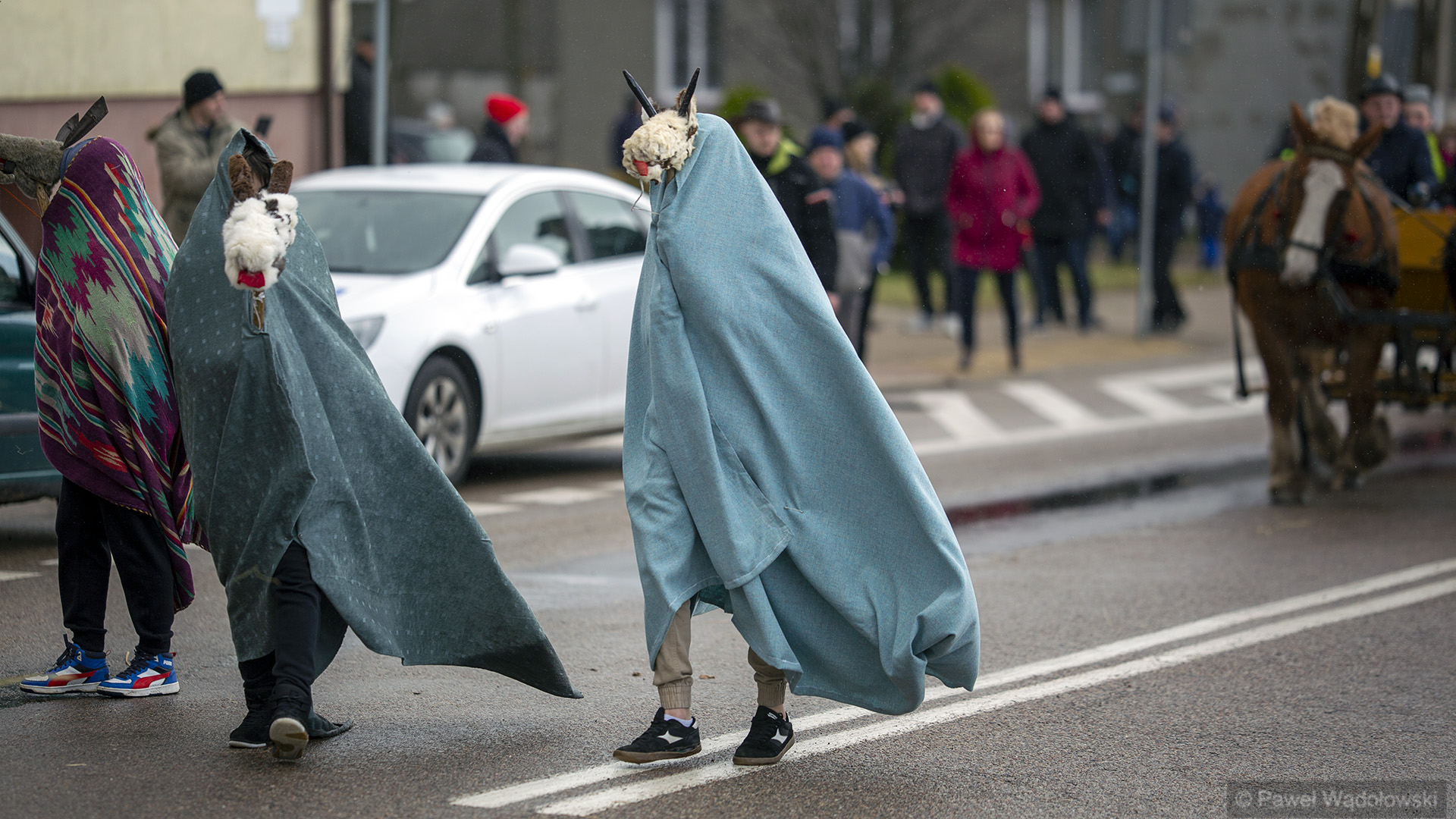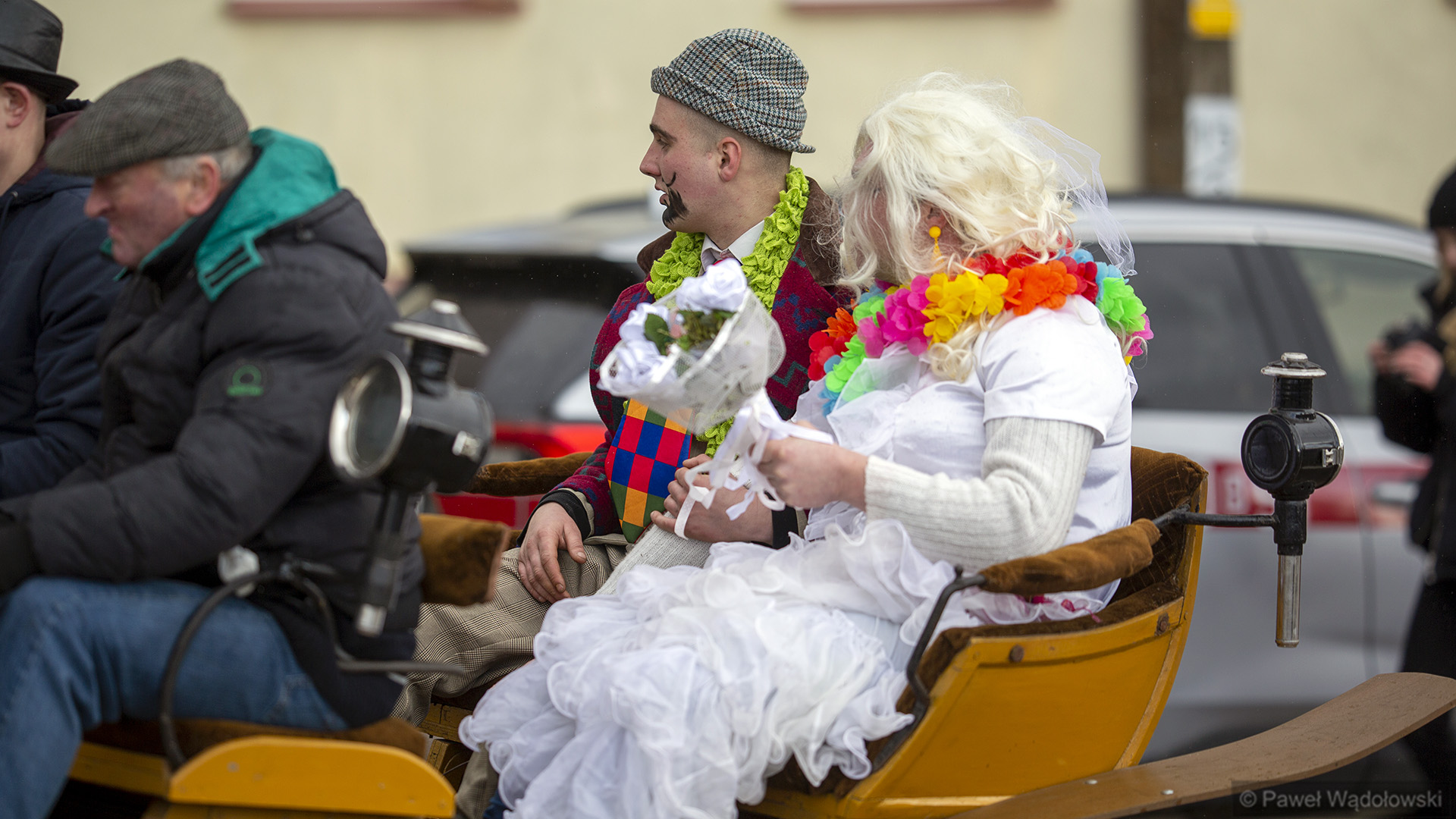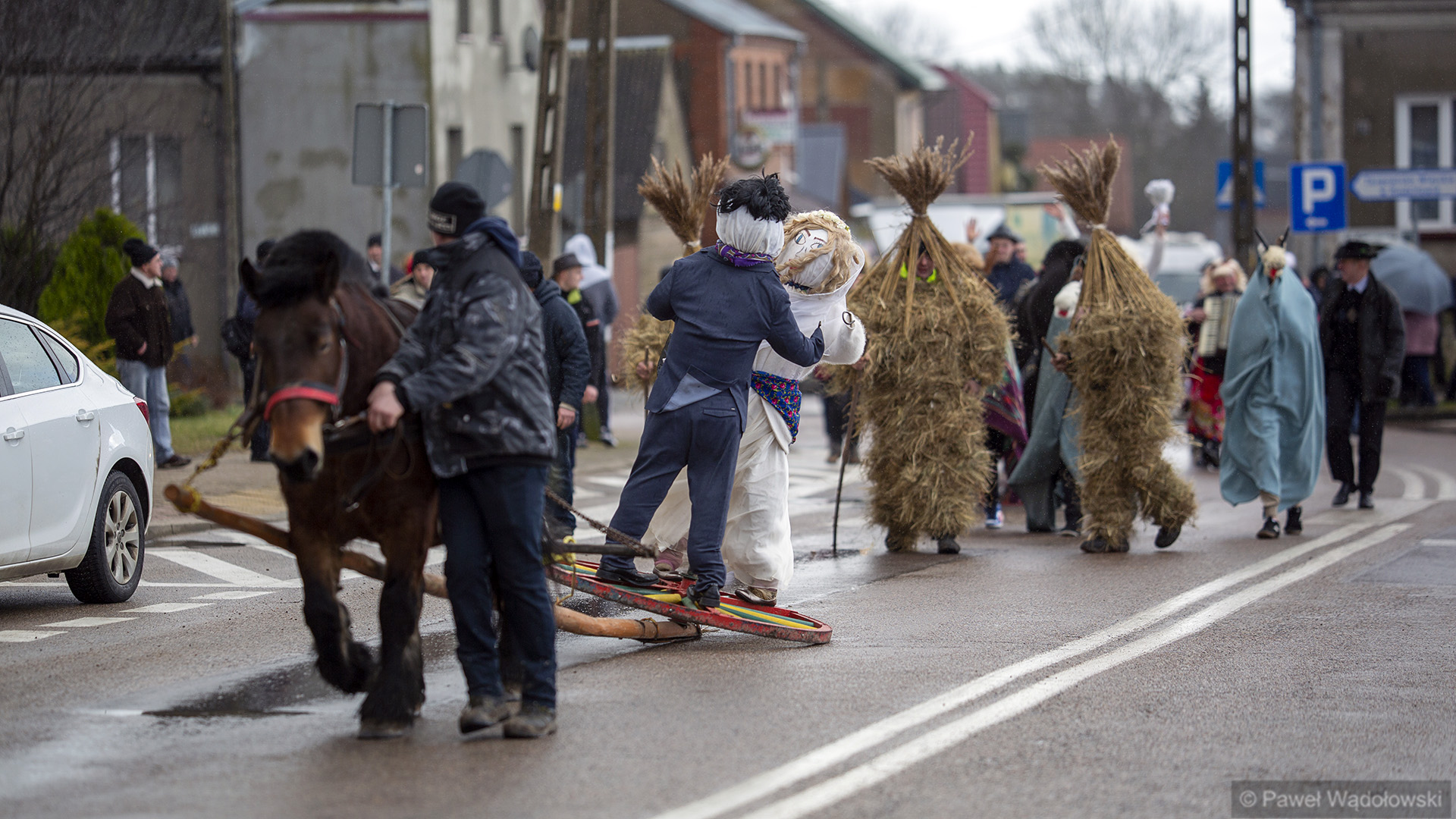 To tradycja już z lat około 60. A głównym elementem są dwie postacie umieszczone na kole drewnianym, które są ciągnięte przez konia. To jest korowód i za tymi dwoma postaciami szli przebrani mieszkańcy, którzy odwiedzali urzędy, odwiedzali sąsiedzi. A wszystko kończyła wspólna biesiada w gospodzie