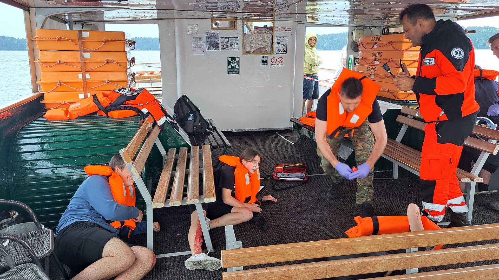 Zawodnicy mają do wykonania różne zadania, które mają pomóc im przełamać strach i lęk przed udzieleniem pomocy osobom poszkodowanym. Ewakuują właśnie pełen rannych osób statek. Na jego pokładzie wybuchł pożar. Musza posegregować ludzi, wybrać tych, którzy są w najpoważniejszym stanie, później tych mniej chorych oraz tych co mogą się samodzielnie ruszać - mówił ratownik medyczny podlaskiego oddziału straży granicznej Zbigniew Sobiesiak.
