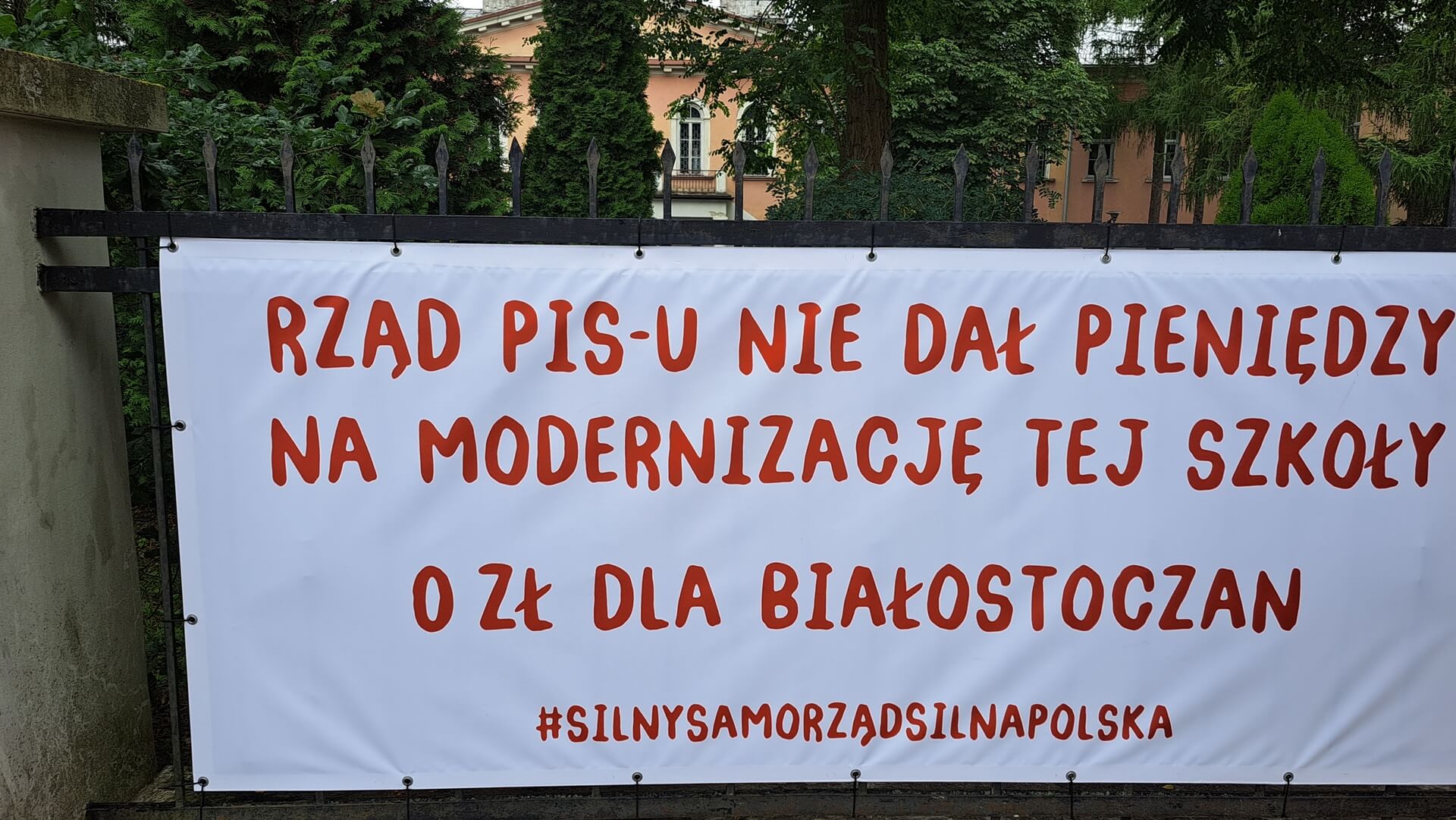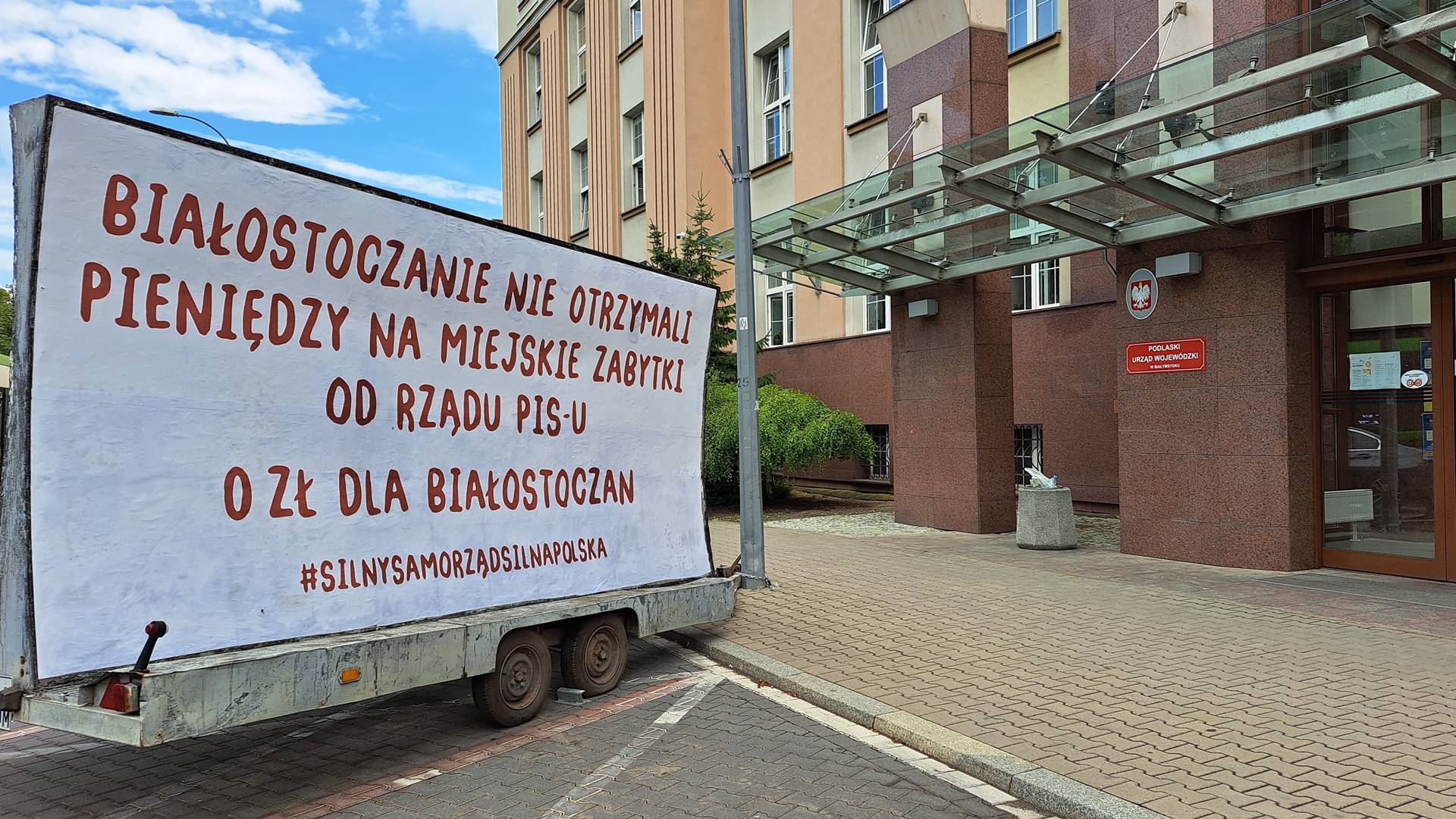 Jeden z projektów, który złożyli miejscy urzędnicy dotyczył remontu zabytkowego budynku VI Liceum Ogólnokształcącego w Białymstoku. To przy tej szkole zorganizowano konferencję. Na ogrodzeniu tej szkoły powieszono baner z informacją o braku dofinansowania na remont placówki. Podobny baner jest na samochodowej przyczepie, którą ustawiono przed siedzibą Podlaskiego Urzędu Wojewódzkiego.